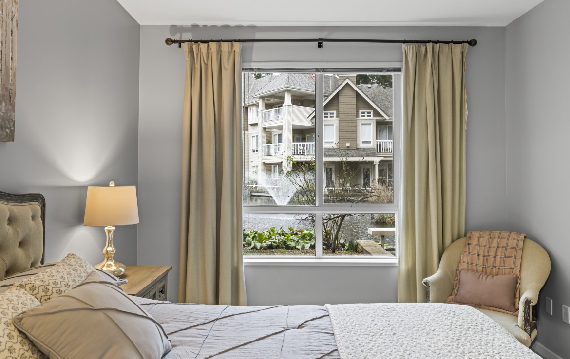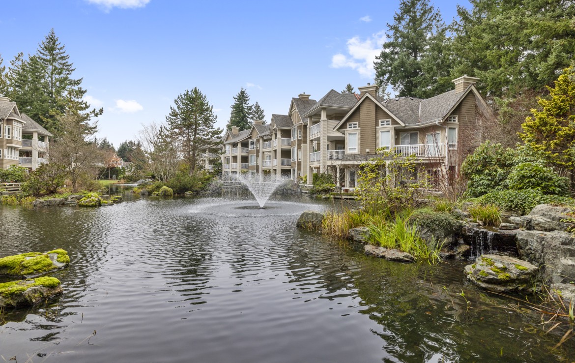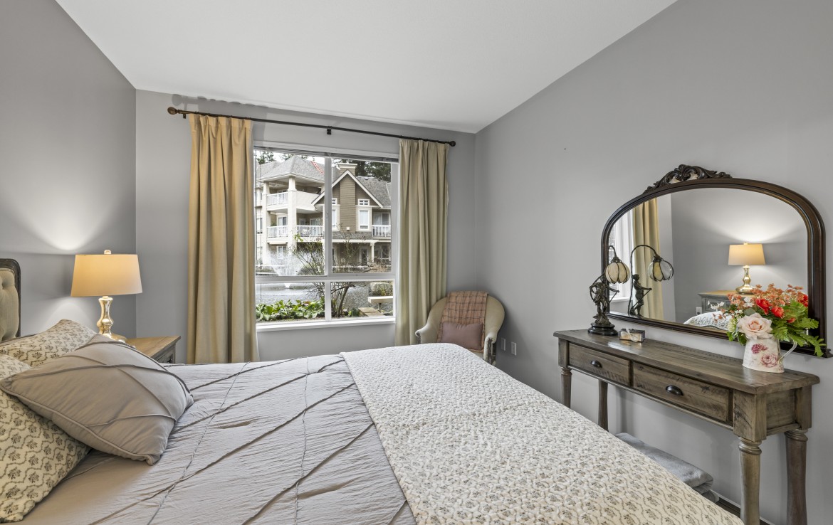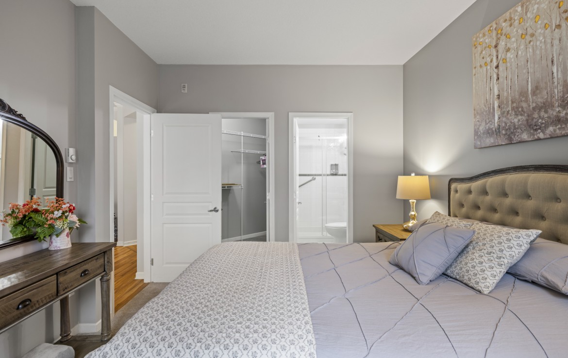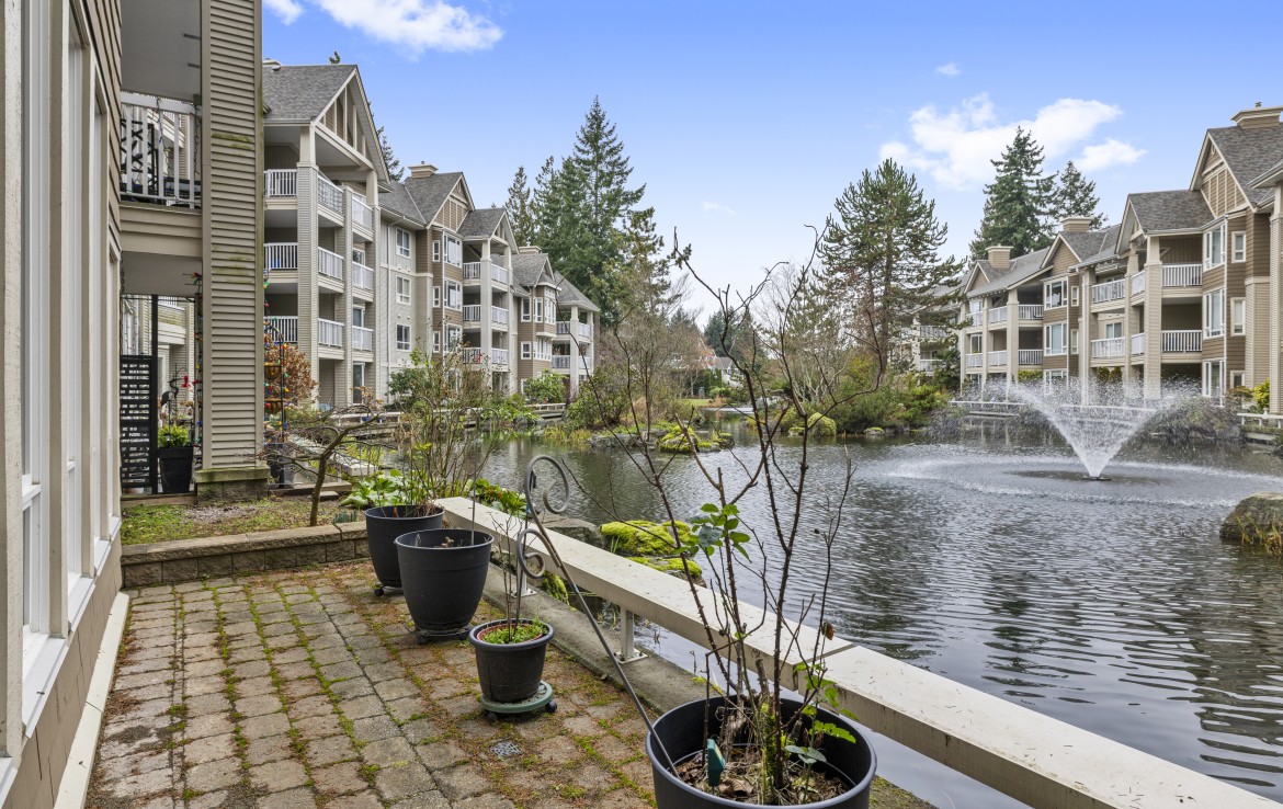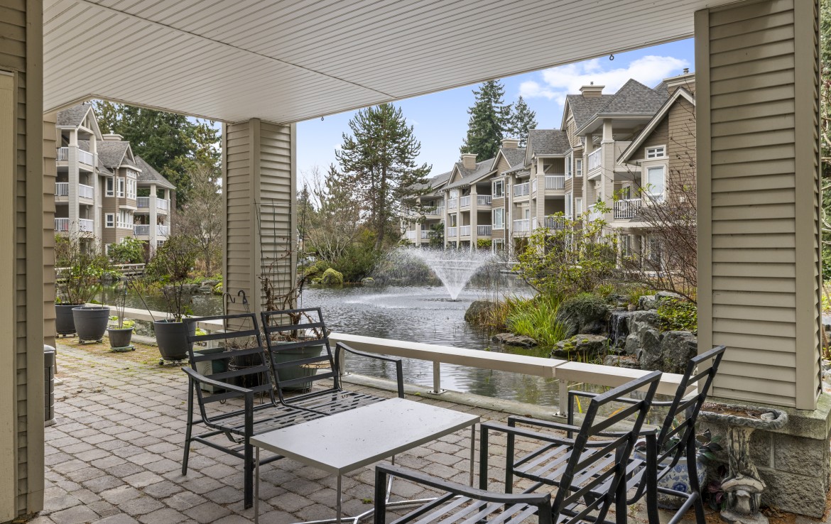 The primary bedroom also enjoys pond views and includes a walk-in closet and updated three-piece ensuite. A second bedroom and additional three-piece bathroom provide flexibility. Full-size in-unit laundry, a storage room, and two separate storage lockers add convenience. Residents enjoy park-like grounds, a clubhouse, workshop, underground parking, gas included, and one dog up to 10 kg or one cat allowed.