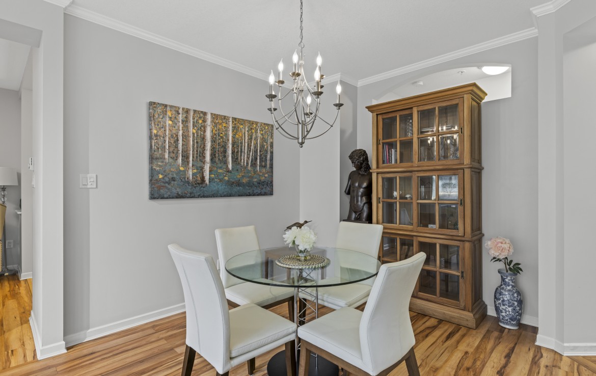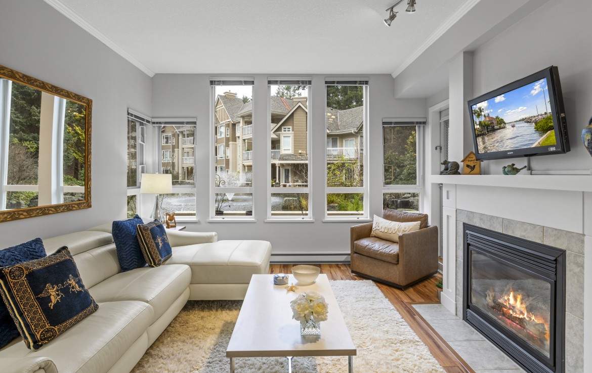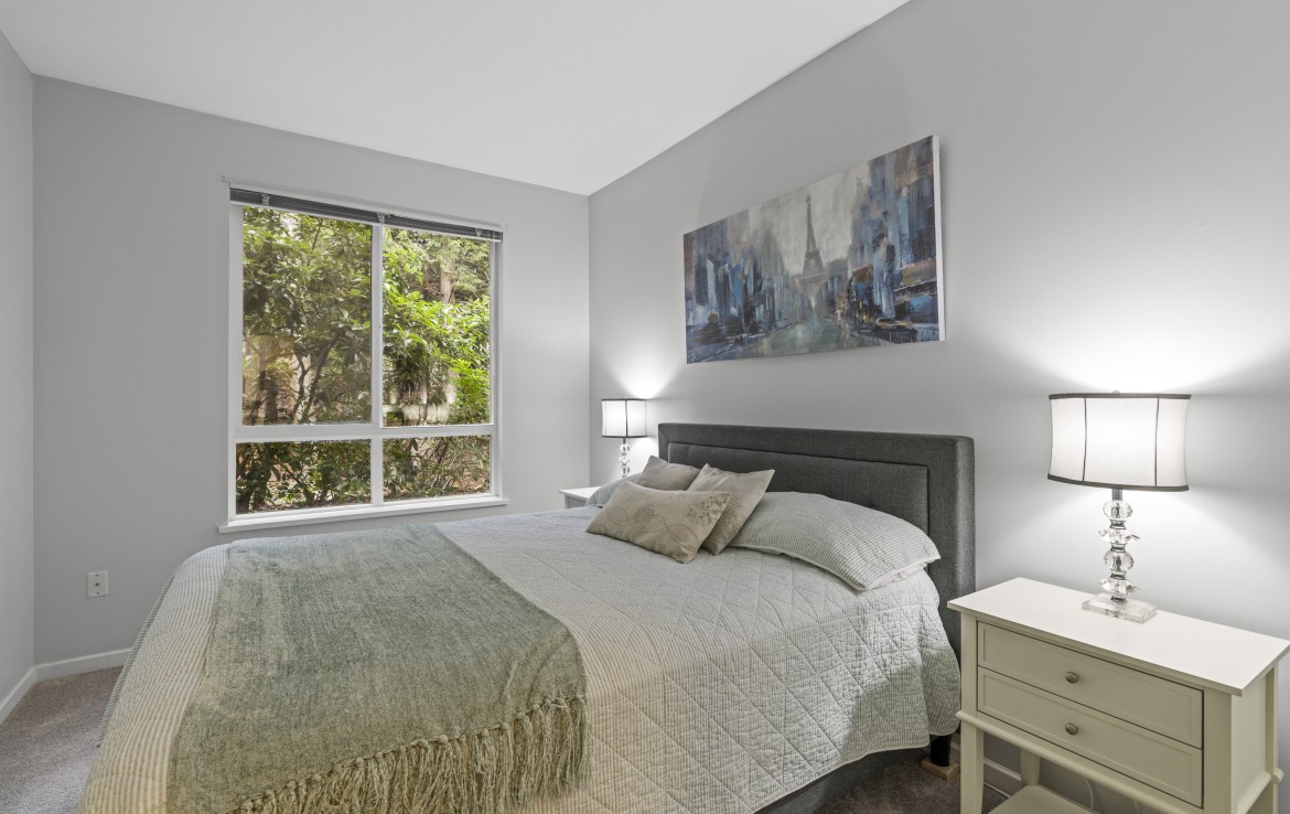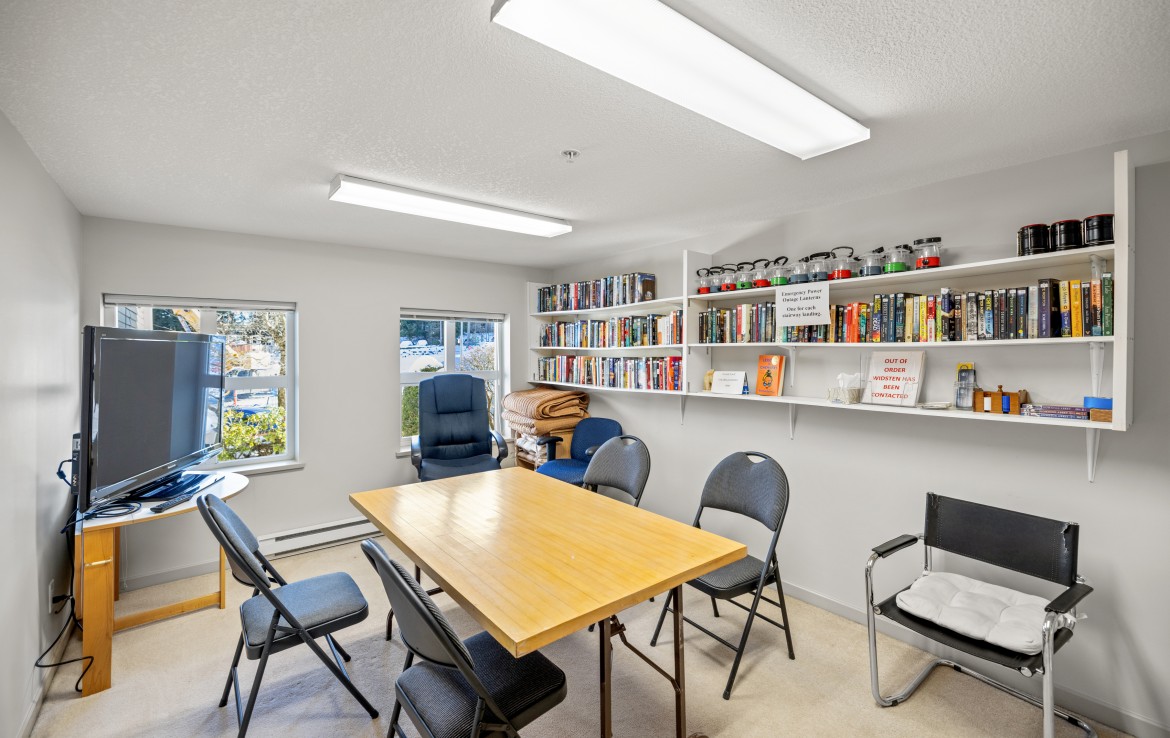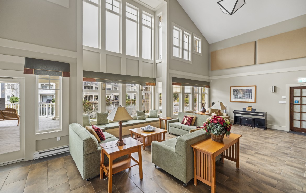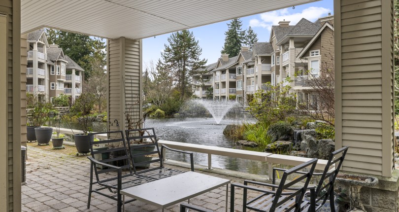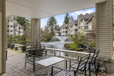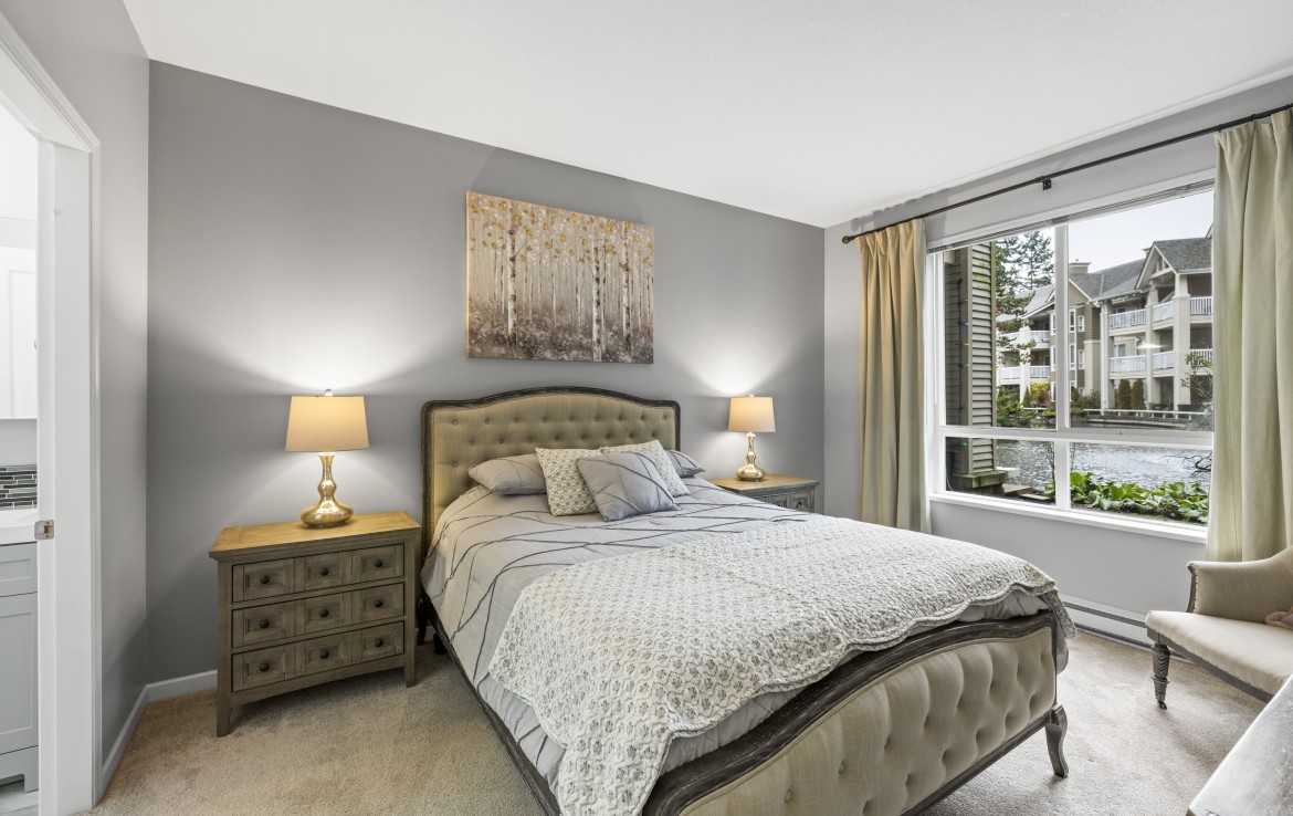 The primary bedroom also enjoys pond views and includes a walk-in closet and updated three-piece ensuite. A second bedroom and additional three-piece bathroom provide flexibility. Full-size in-unit laundry, a storage room, and two separate storage lockers add convenience. Residents enjoy park-like grounds, a clubhouse, workshop, underground parking, gas included, and one dog up to 10 kg or one cat allowed.