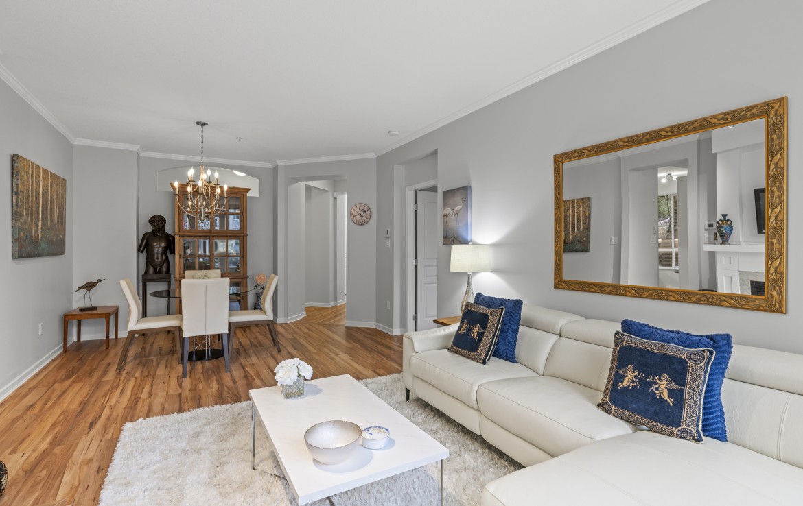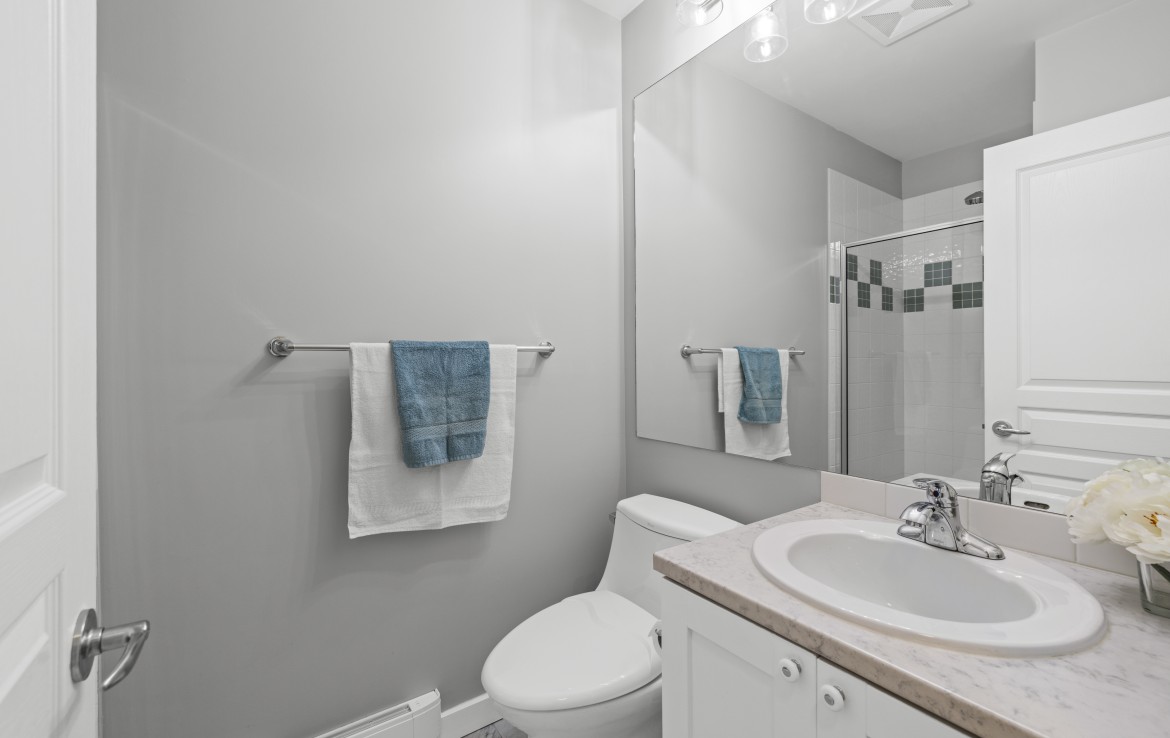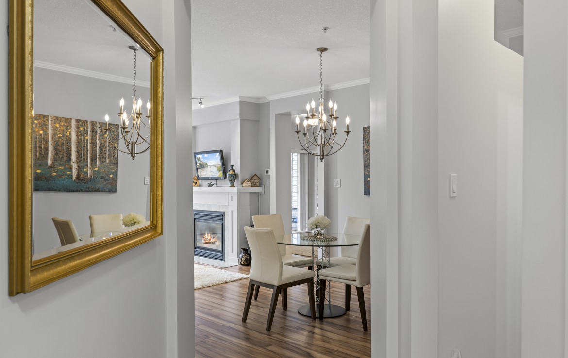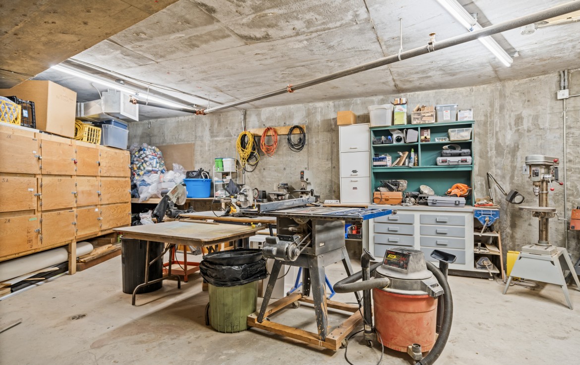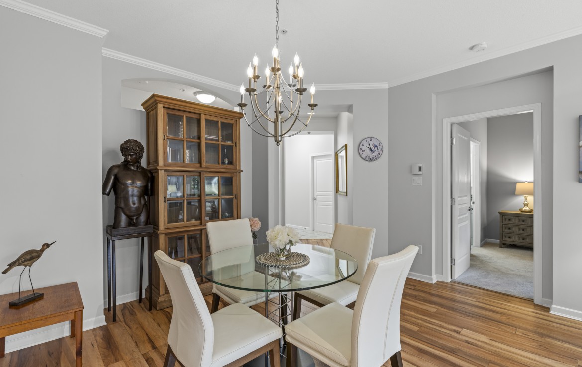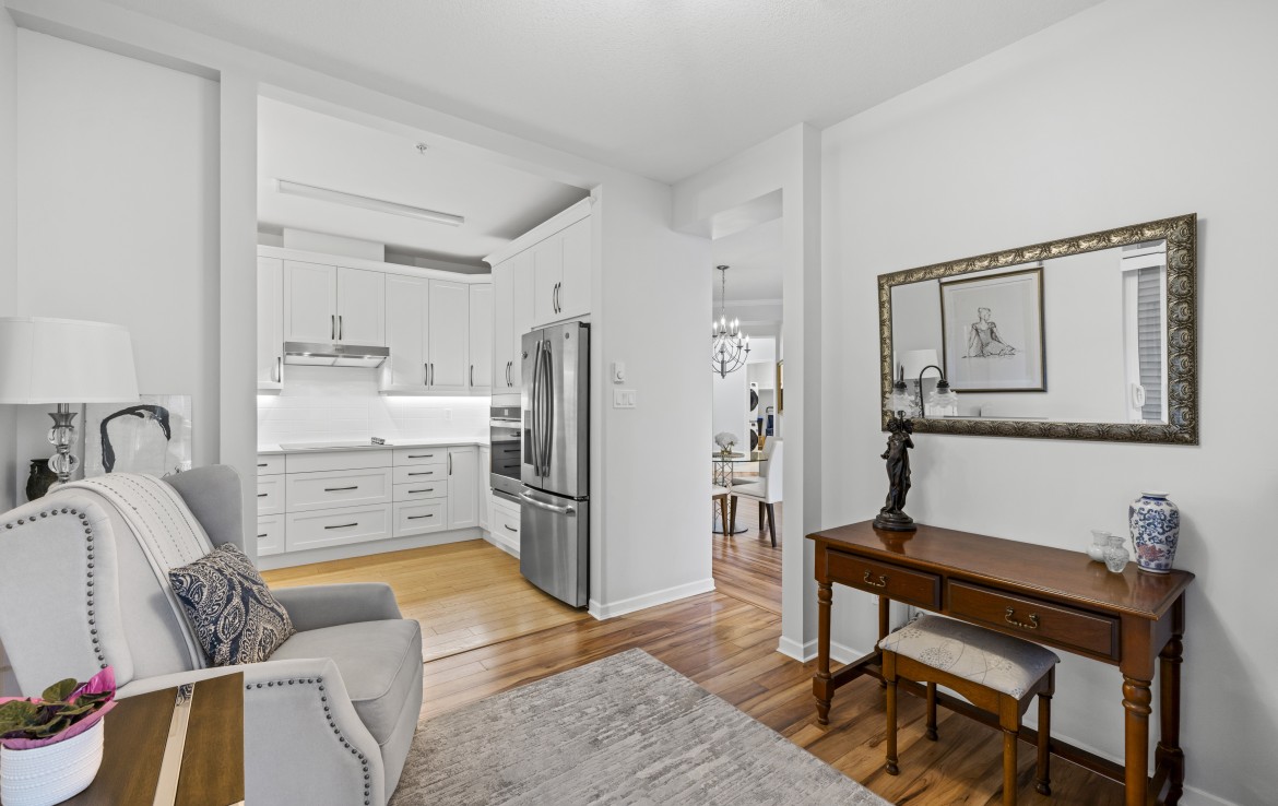 The primary bedroom also enjoys pond views and includes a walk-in closet and updated three-piece ensuite. A second bedroom and additional three-piece bathroom provide flexibility. Full-size in-unit laundry, a storage room, and two separate storage lockers add convenience. Residents enjoy park-like grounds, a clubhouse, workshop, underground parking, gas included, and one dog up to 10 kg or one cat allowed.
