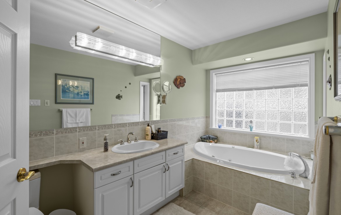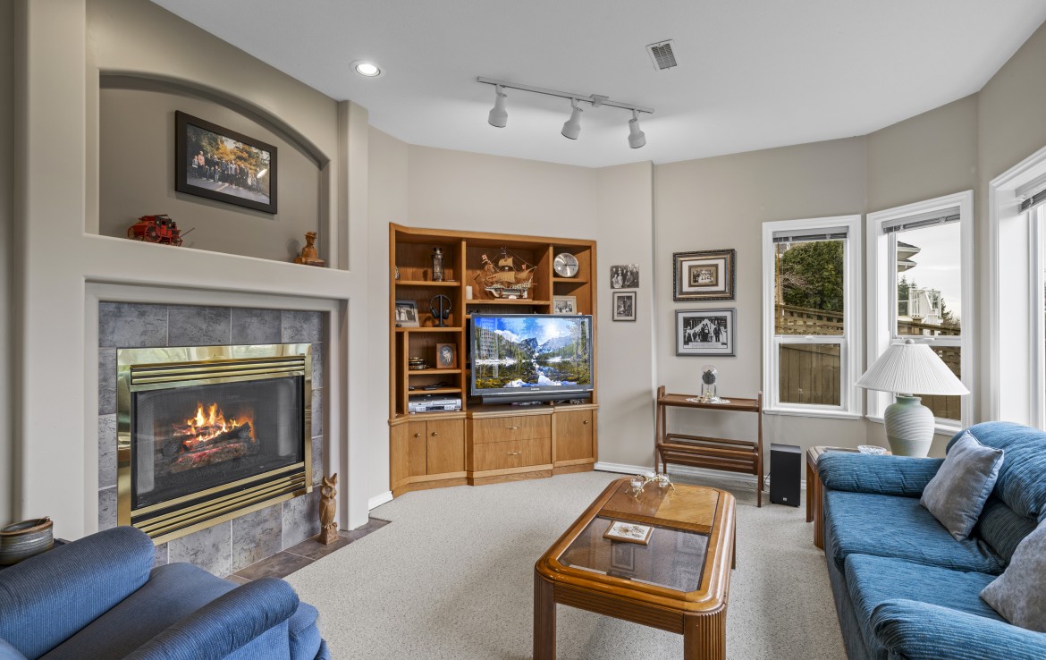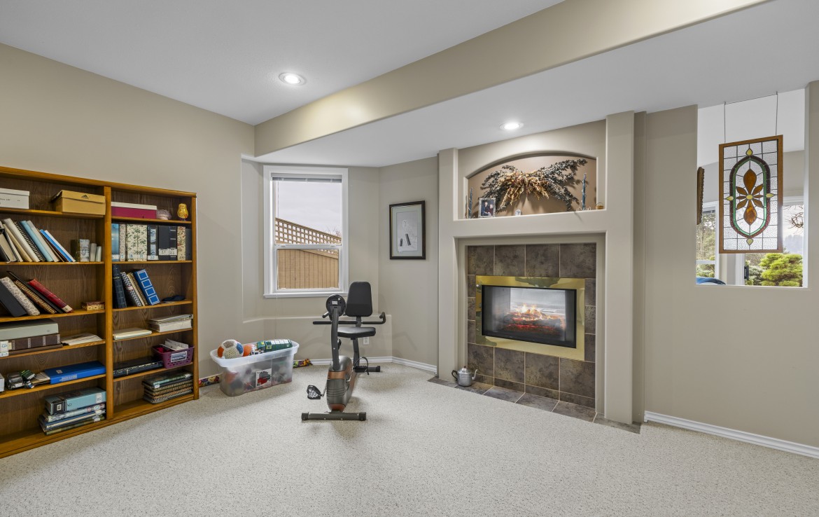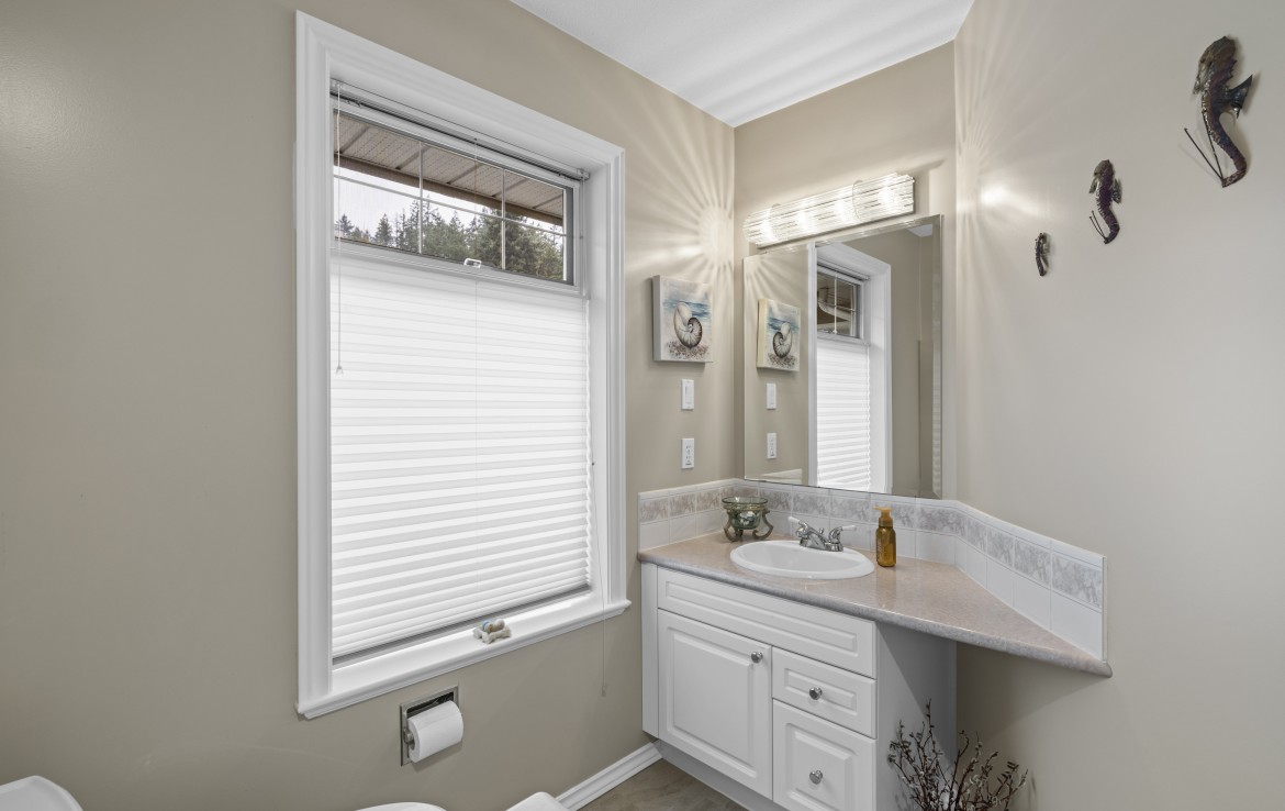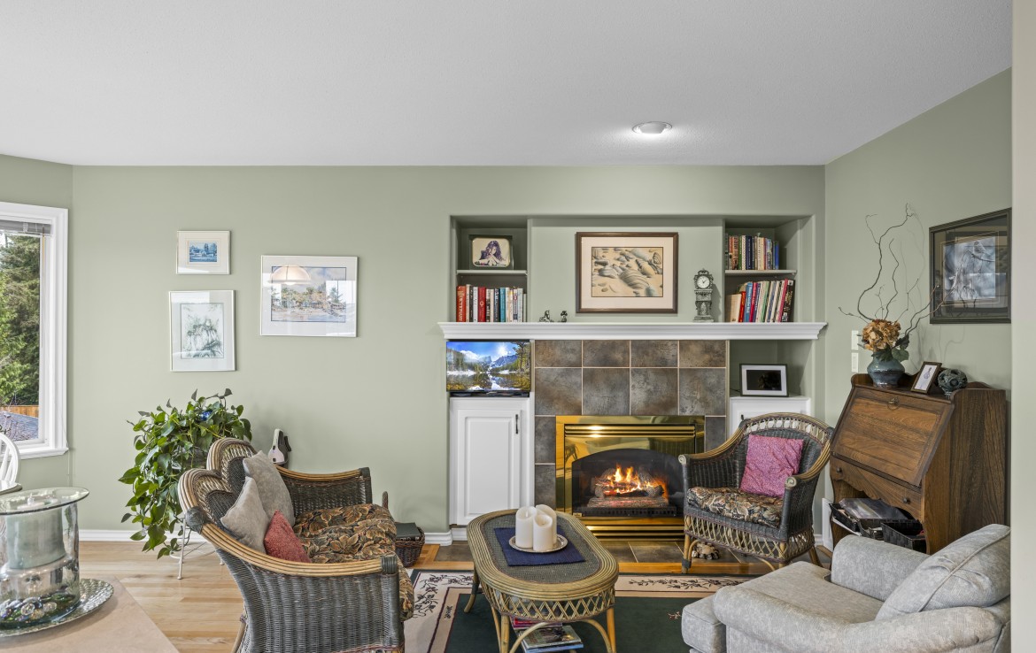 The main level includes a primary bedroom with walk-in closet and three-piece ensuite, a second bedroom and four-piece bathroom. The fully finished walk-out lower level offers a family room and rec room with a double-sided fireplace, two bedrooms with window benches, a three-piece bathroom, laundry and storage. Added features include hardwood flooring and heat pump. Just a short walk to beach access and Linley Valley hiking trails.
