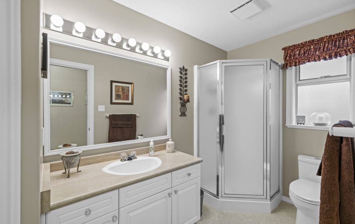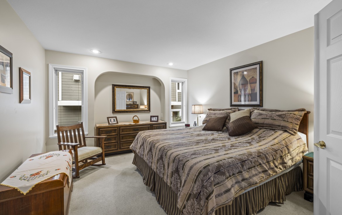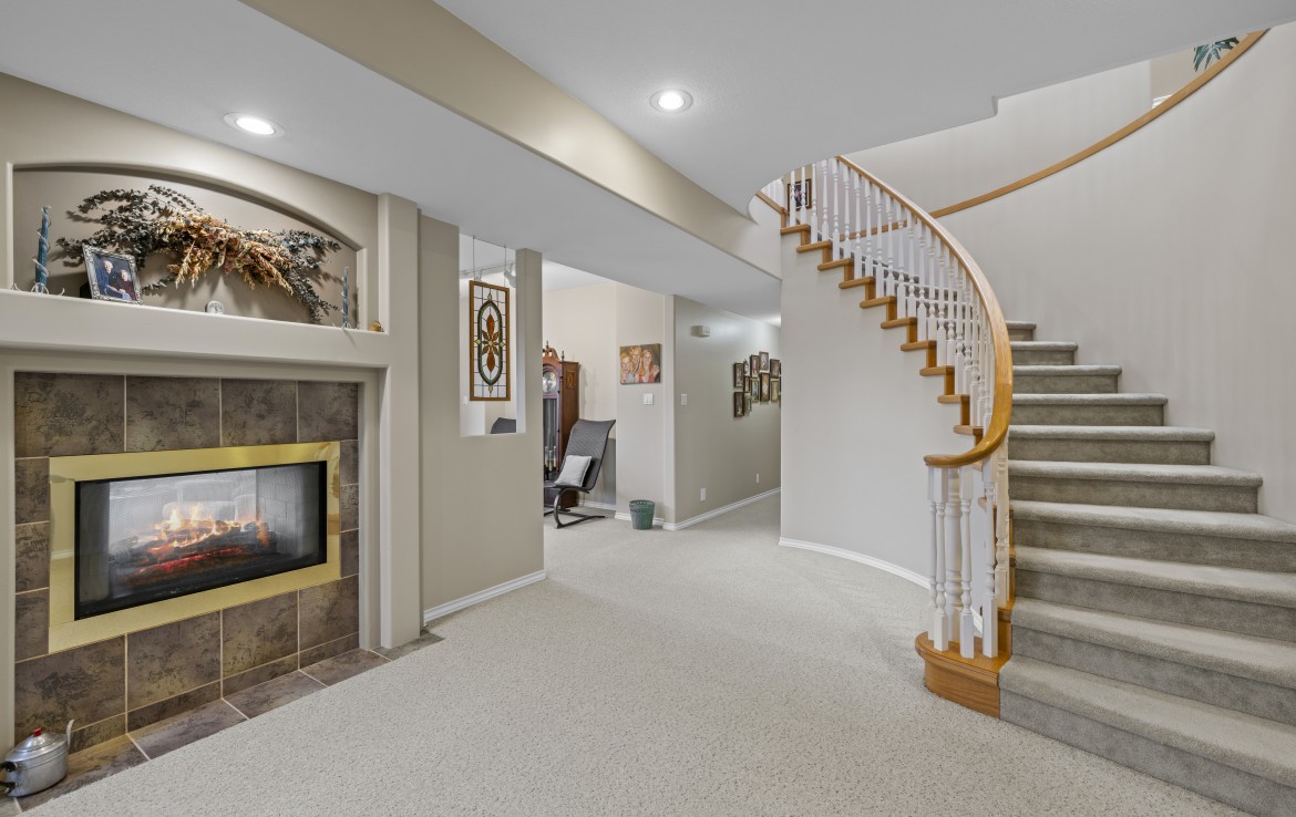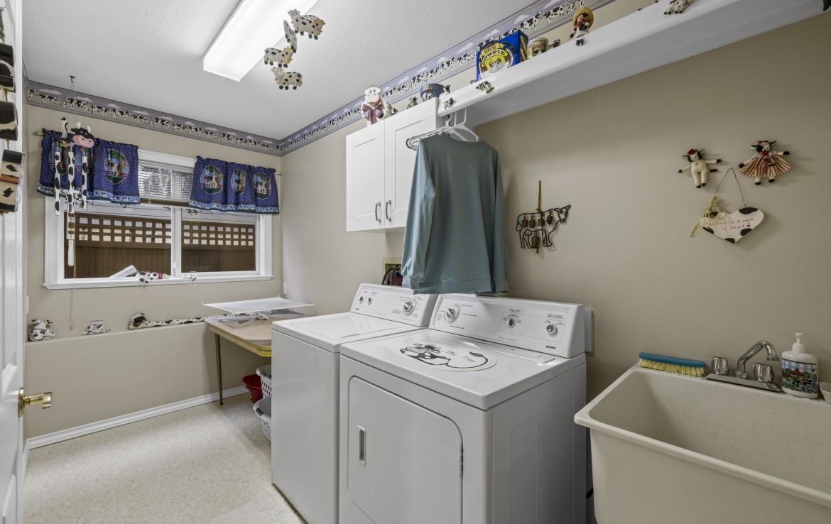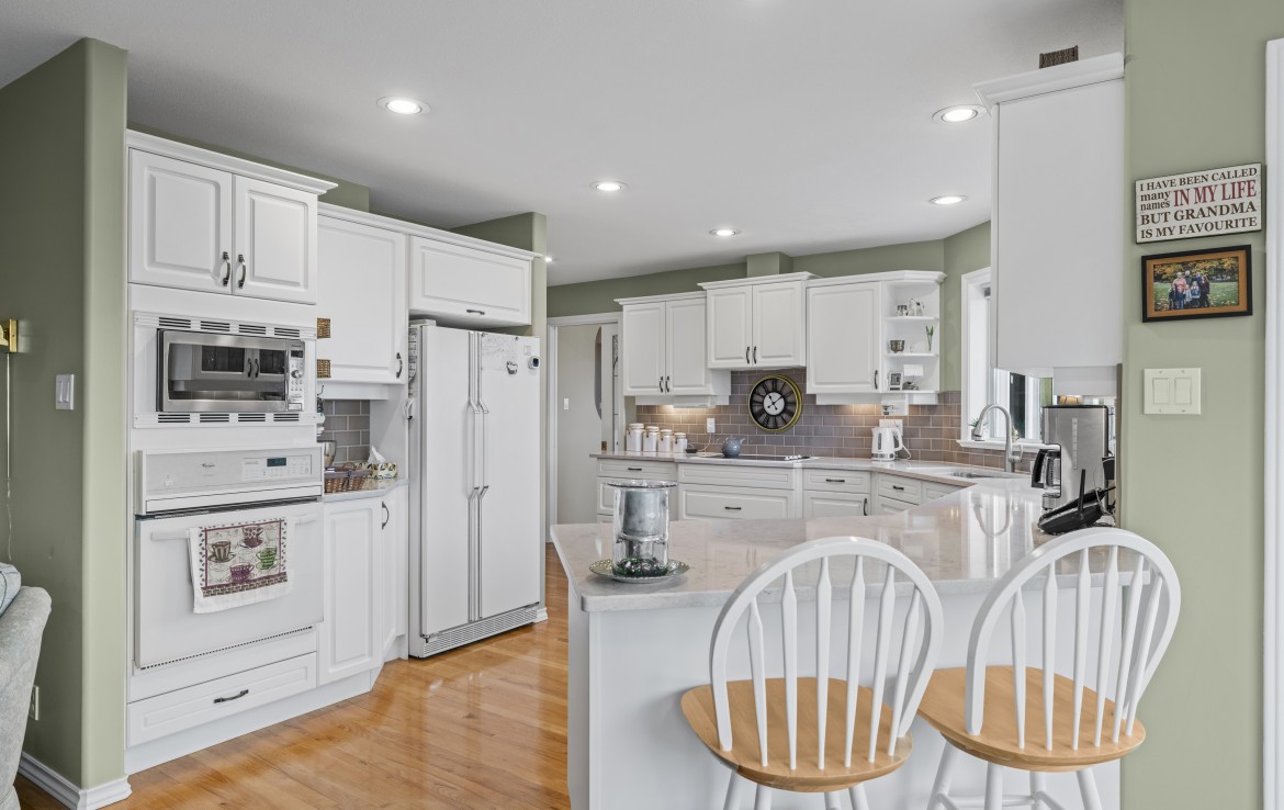 The main level includes a primary bedroom with walk-in closet and three-piece ensuite, a second bedroom and four-piece bathroom. The fully finished walk-out lower level offers a family room and rec room with a double-sided fireplace, two bedrooms with window benches, a three-piece bathroom, laundry and storage. Added features include hardwood flooring and heat pump. Just a short walk to beach access and Linley Valley hiking trails.
