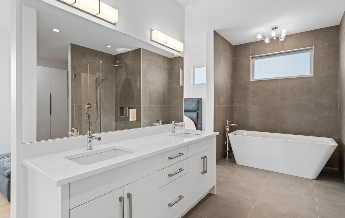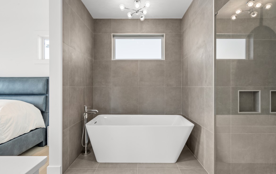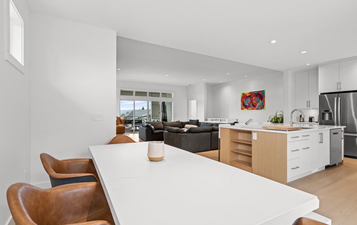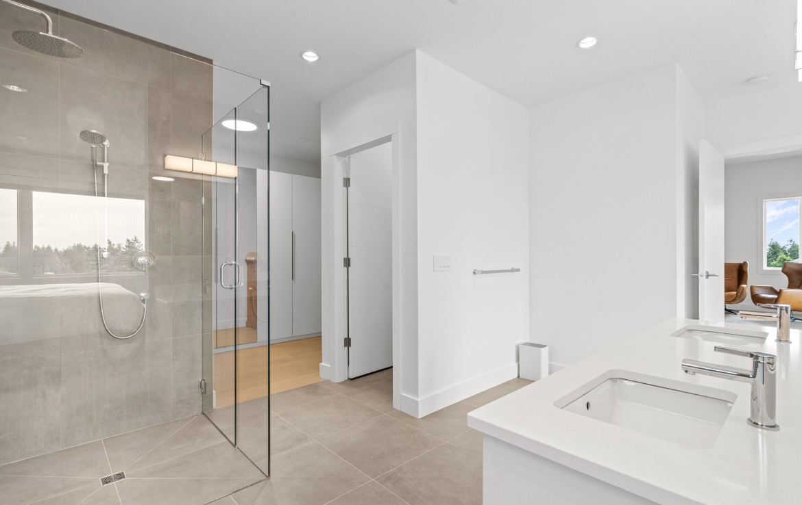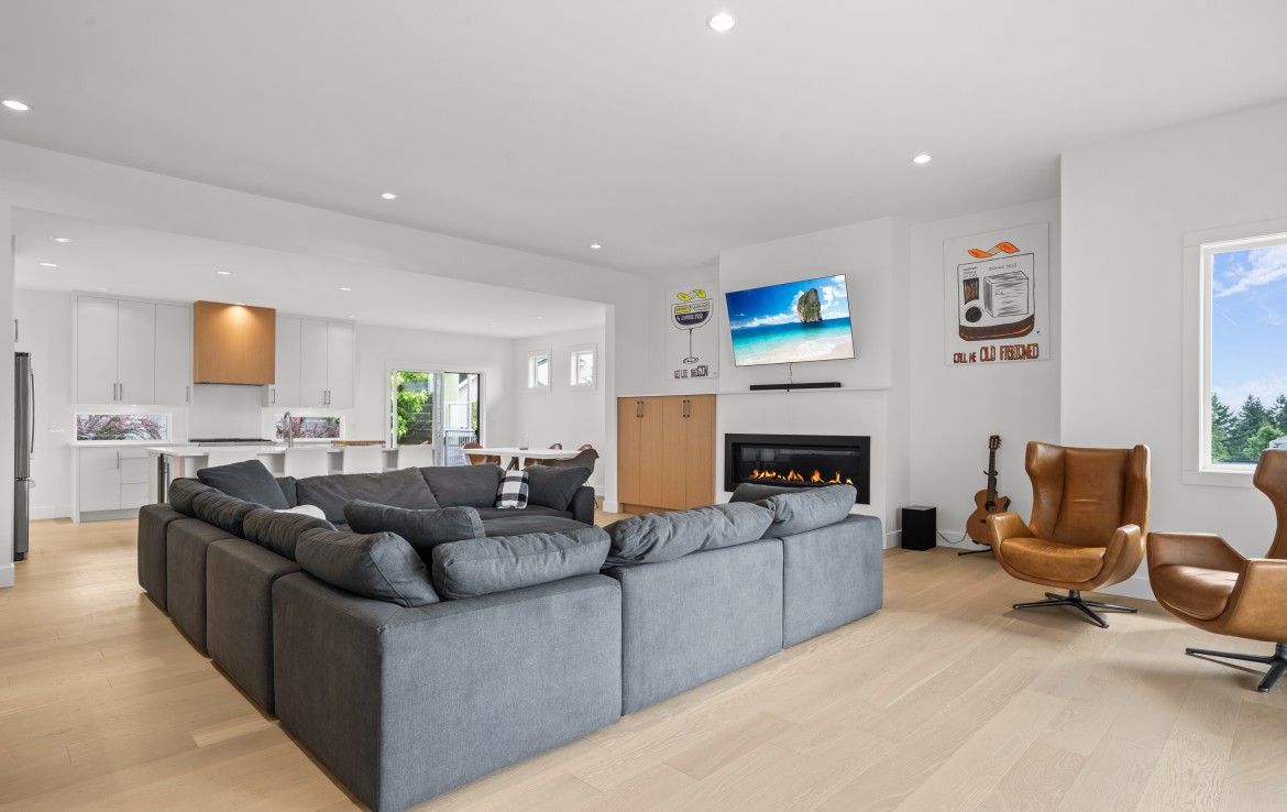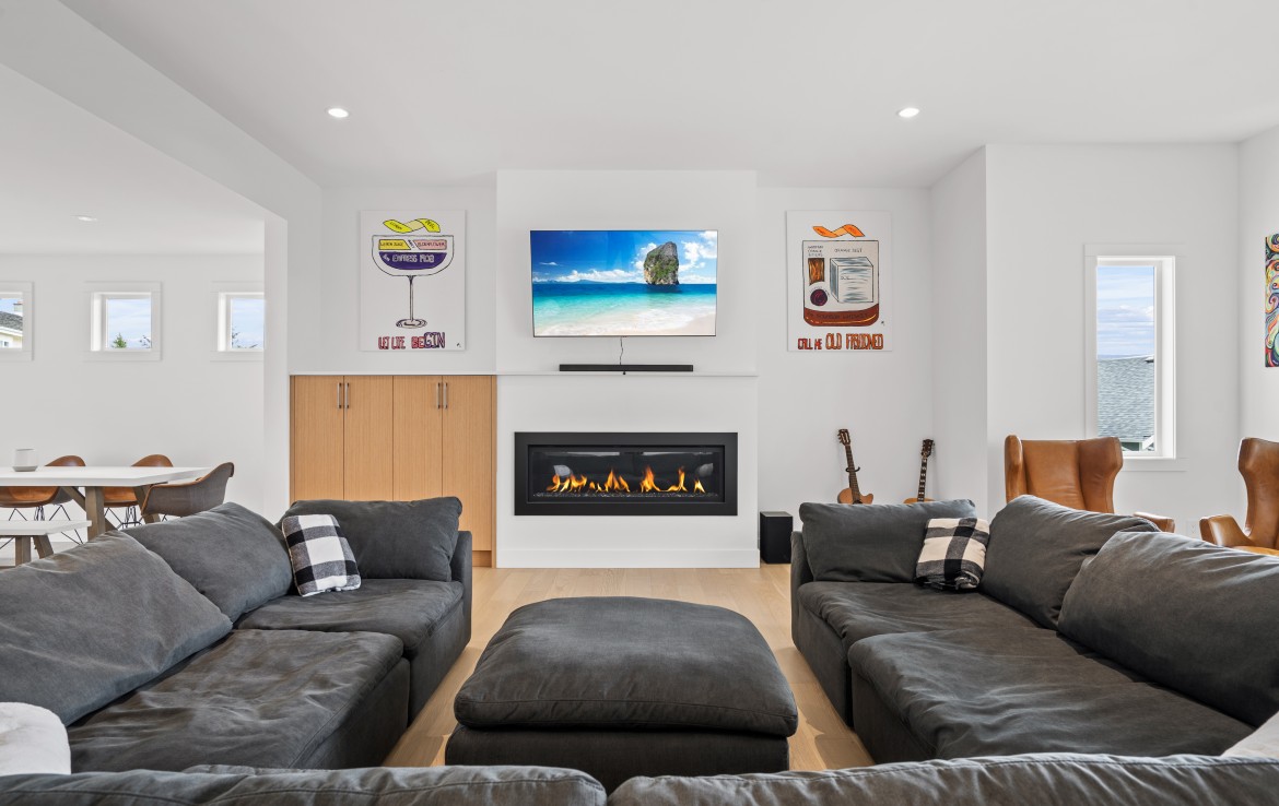 The open-concept living room is anchored by a striking 65” fireplace framed with warm oak cabinetry and a quartz mantle. From here, step out to a spacious covered deck and take in the panoramic views. The primary suite is a true retreat, featuring a spa-inspired ensuite with floor-to-ceiling tile, a barrier-free rainfall shower, freestanding soaker tub, dual vanity, and private water closet.