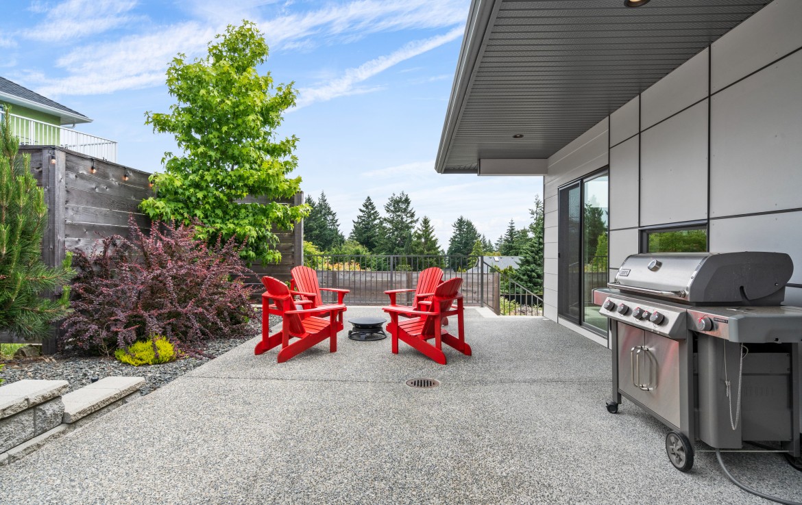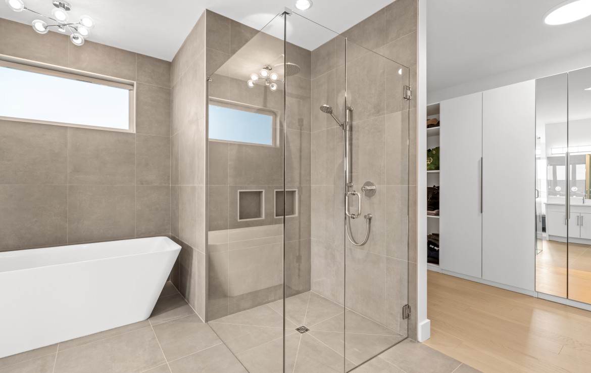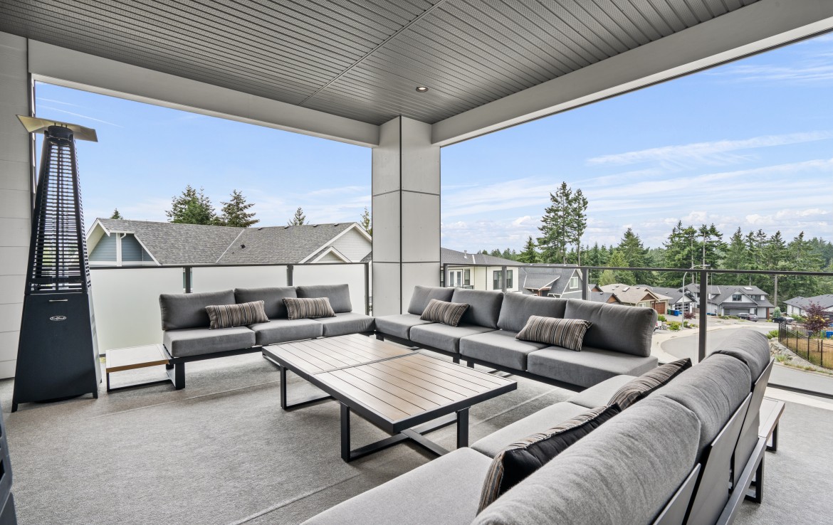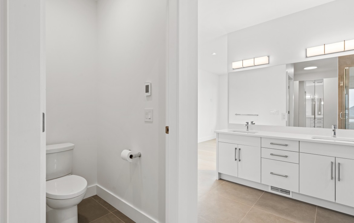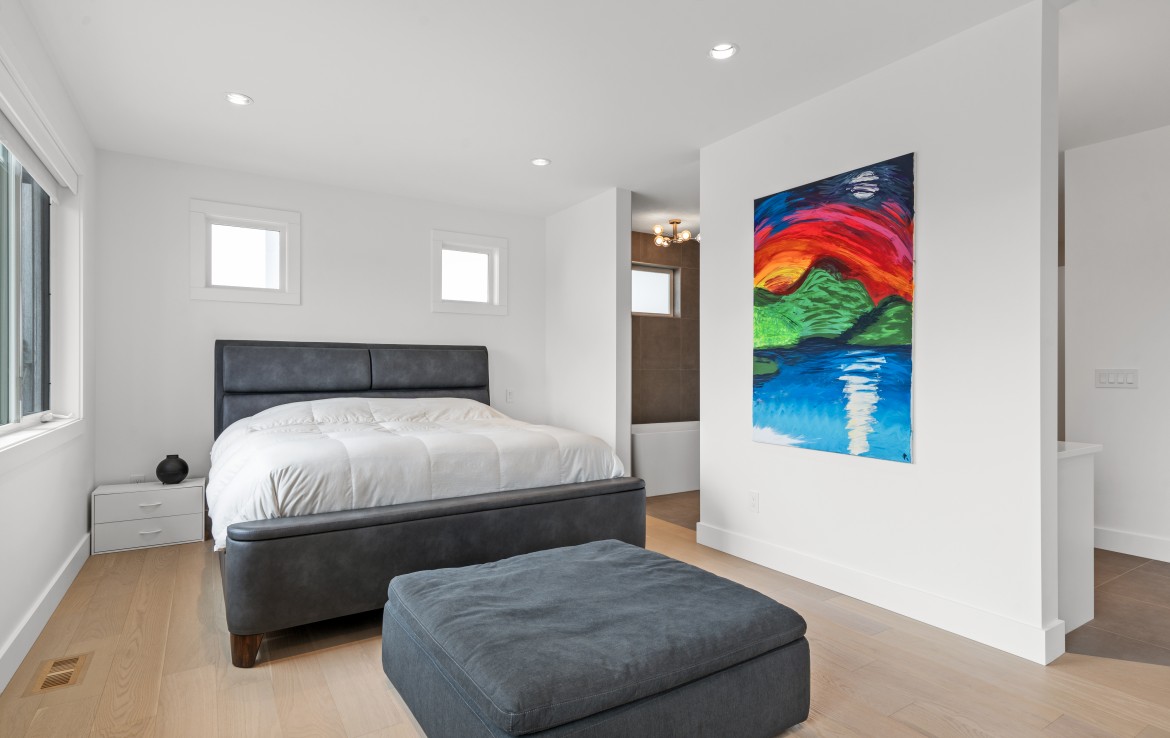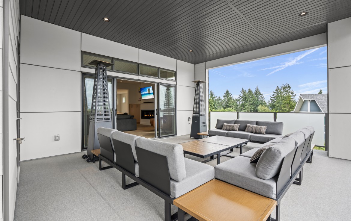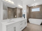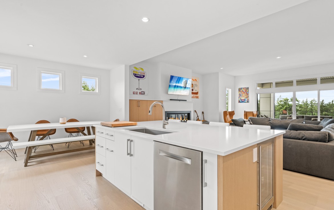 The open-concept living room is anchored by a striking 65” fireplace framed with warm oak cabinetry and a quartz mantle. From here, step out to a spacious covered deck and take in the panoramic views. The primary suite is a true retreat, featuring a spa-inspired ensuite with floor-to-ceiling tile, a barrier-free rainfall shower, freestanding soaker tub, dual vanity, and private water closet.