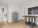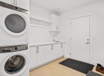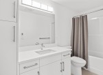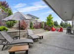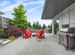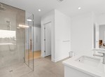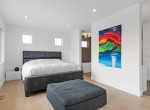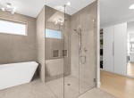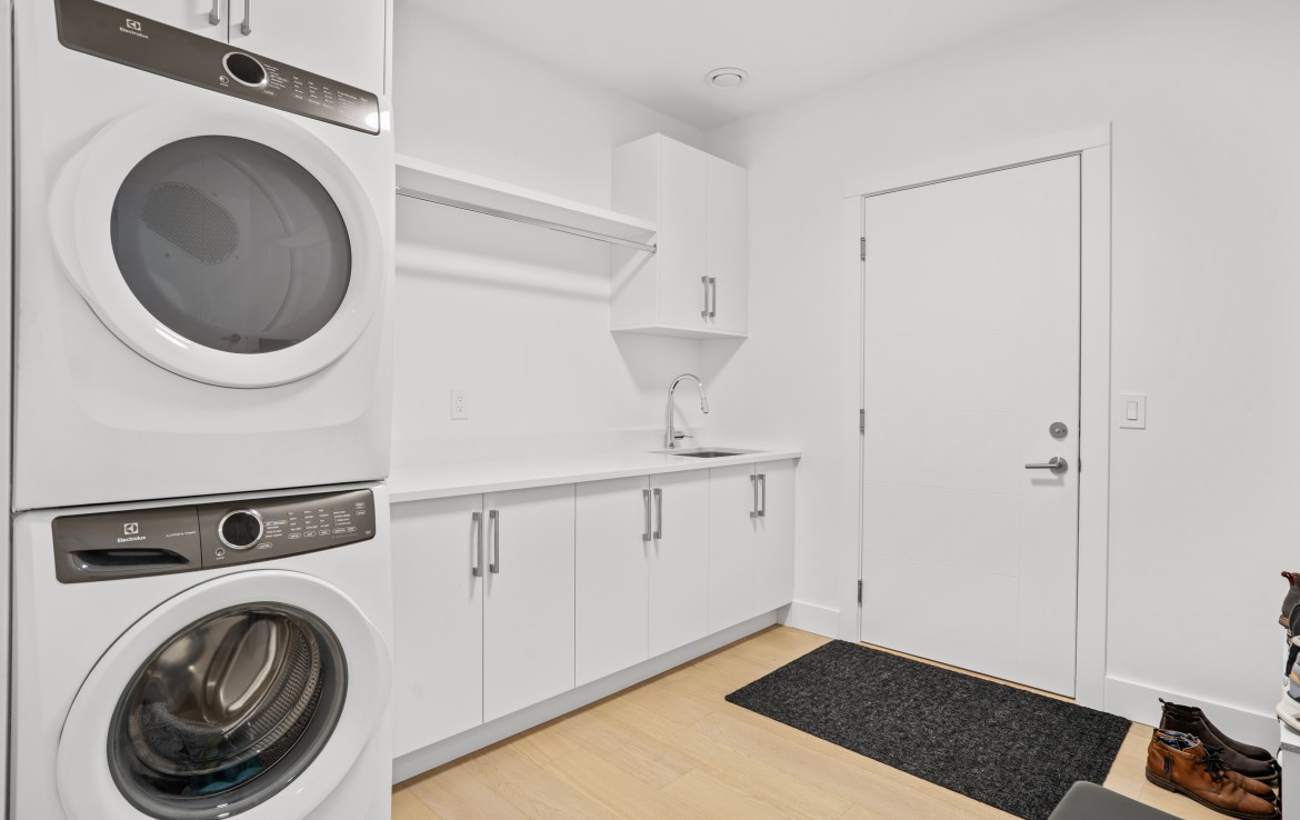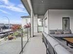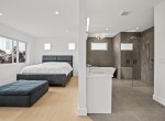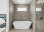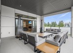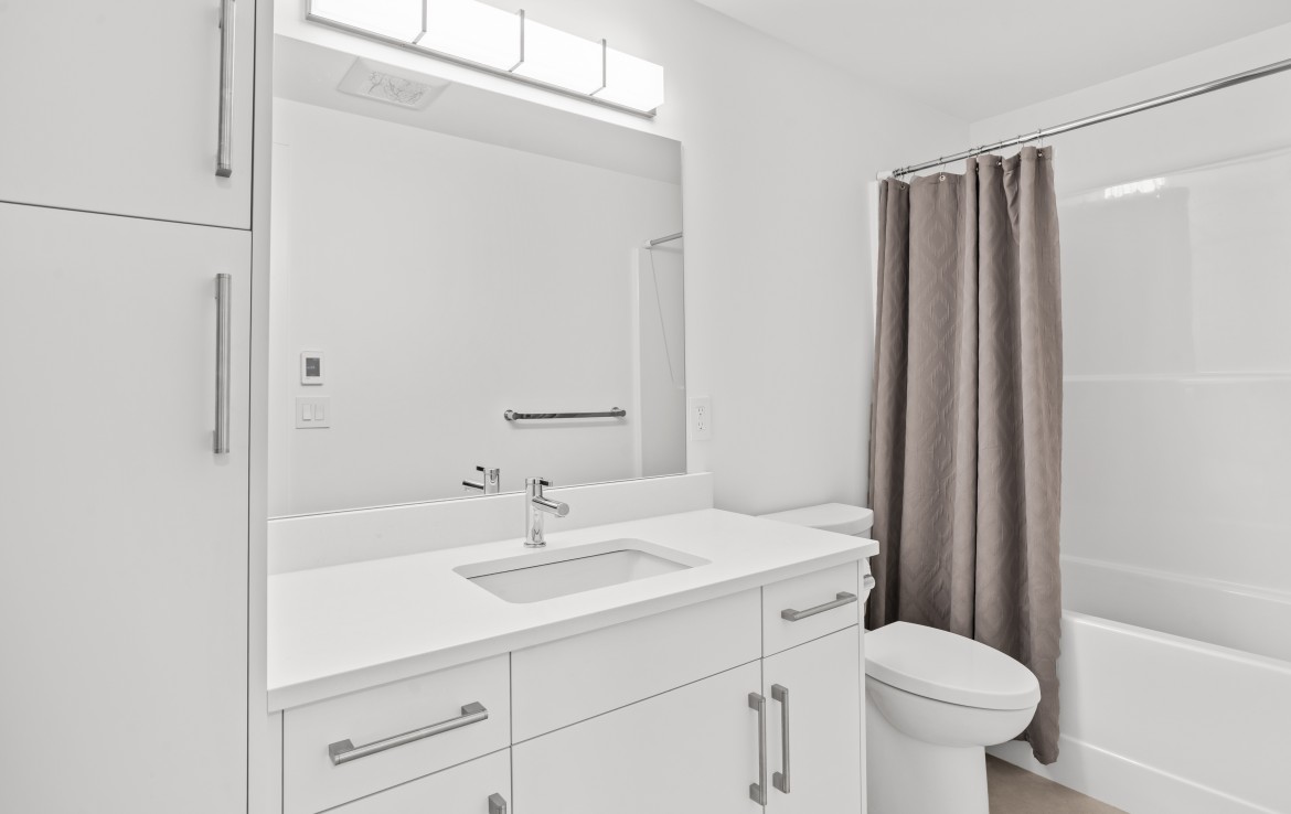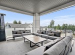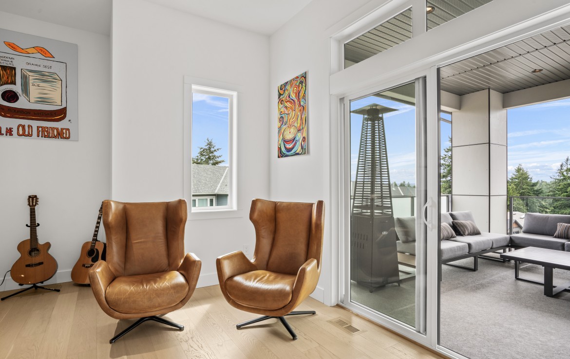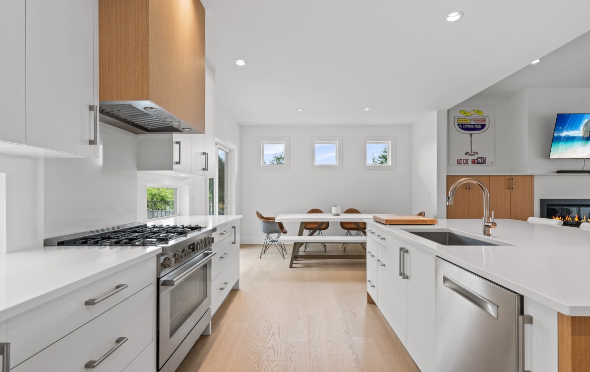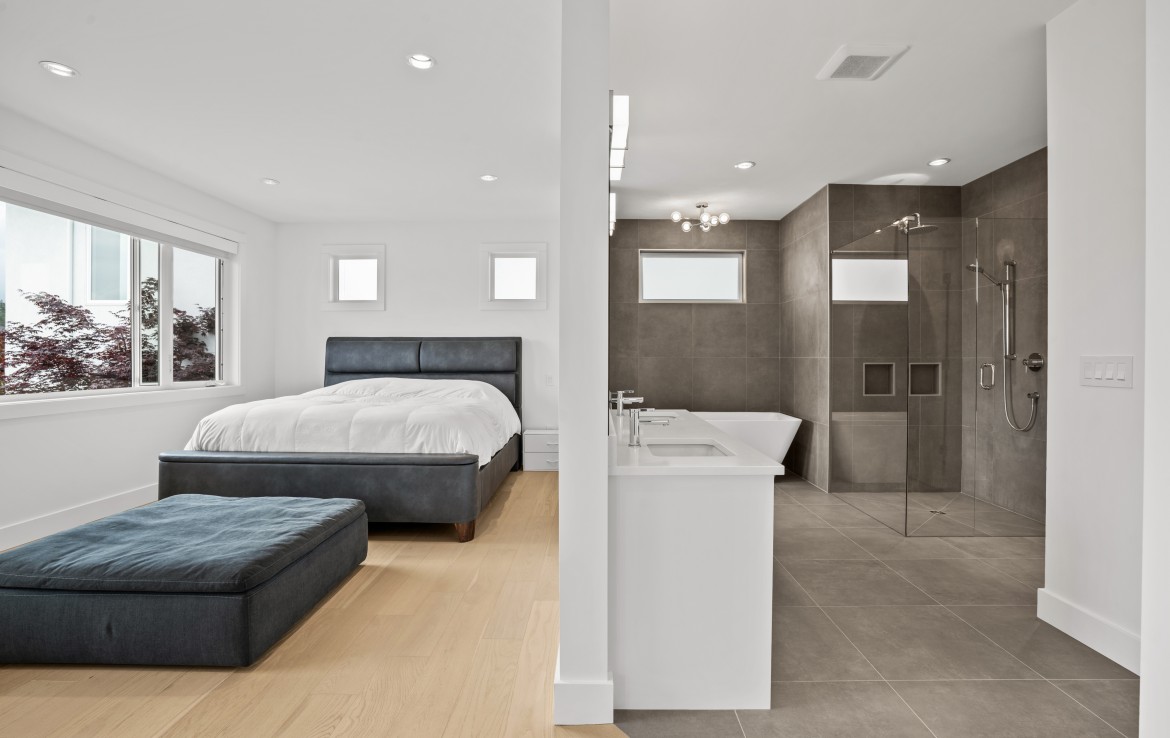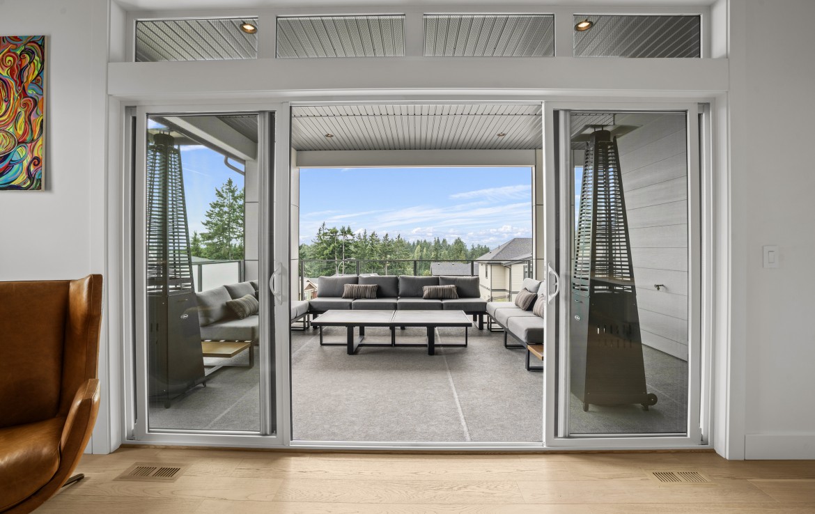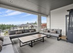 The open-concept living room is anchored by a striking 65” fireplace framed with warm oak cabinetry and a quartz mantle. From here, step out to a spacious covered deck and take in the panoramic views. The primary suite is a true retreat, featuring a spa-inspired ensuite with floor-to-ceiling tile, a barrier-free rainfall shower, freestanding soaker tub, dual vanity, and private water closet.