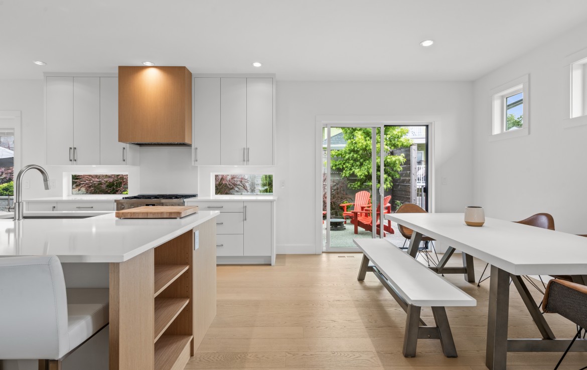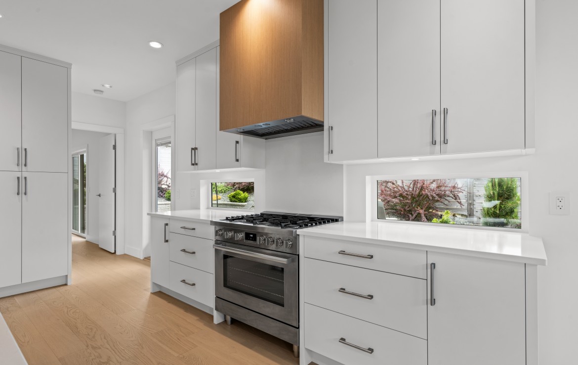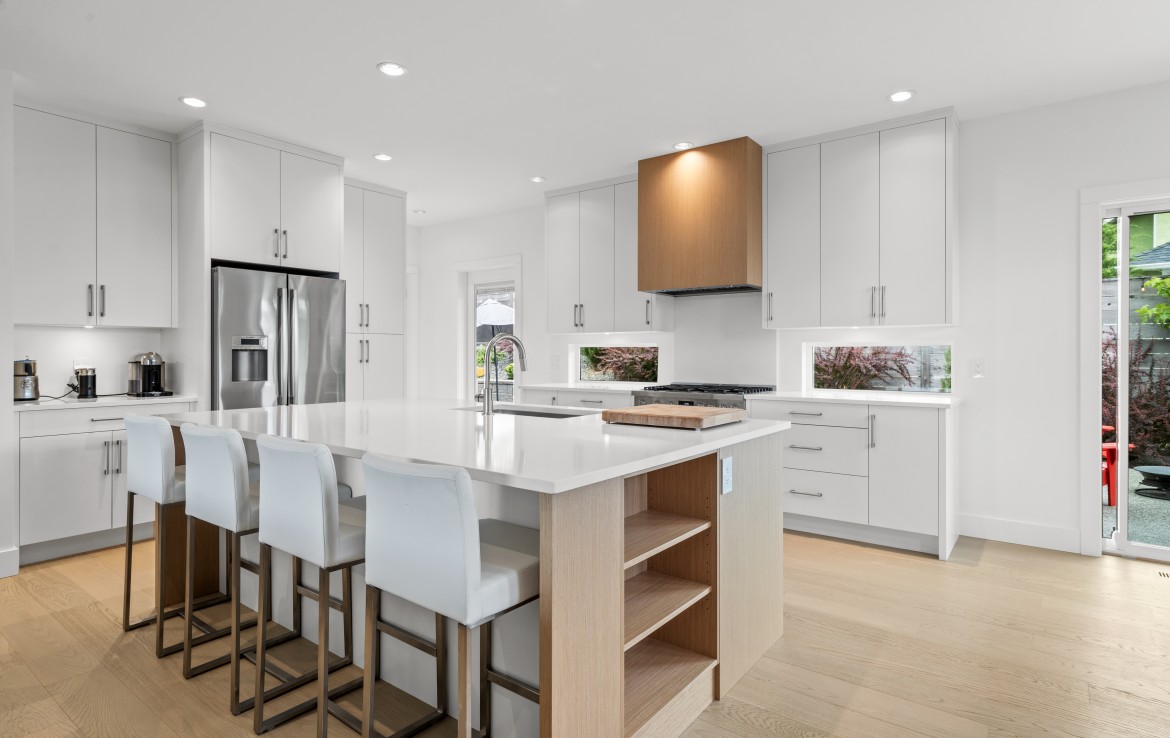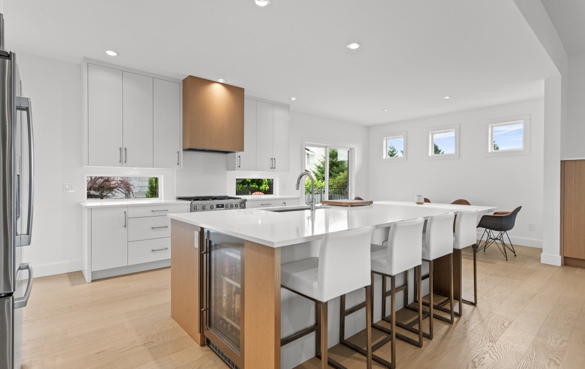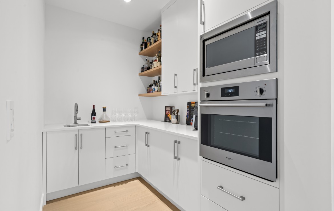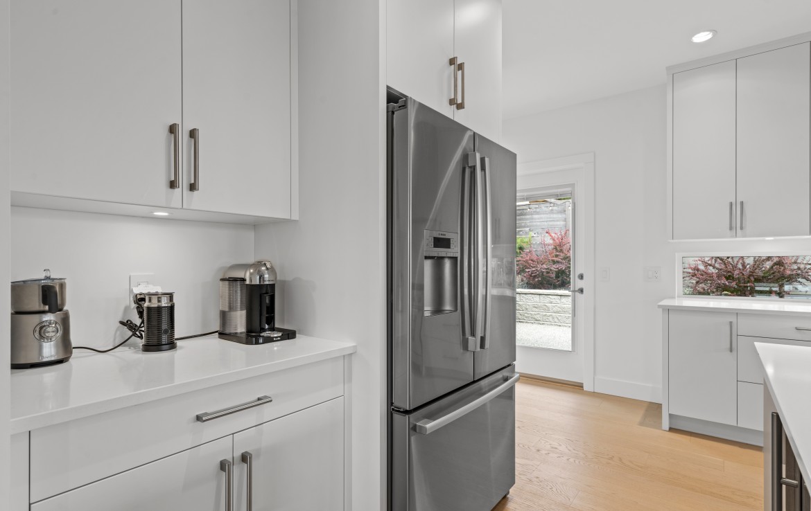 The heart of the home is a showstopping kitchen complete with quartz countertops, Bosch appliances, an expansive walk-in butler’s pantry, and custom cabinetry designed for both style and function.