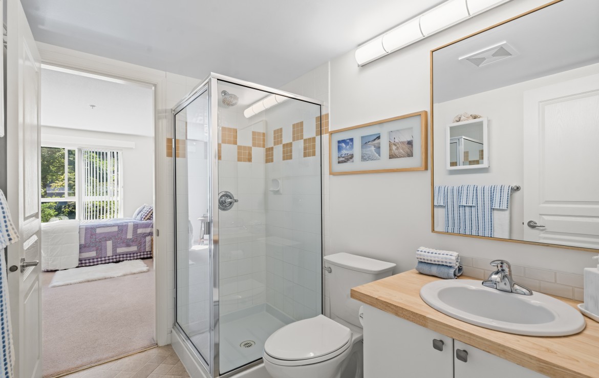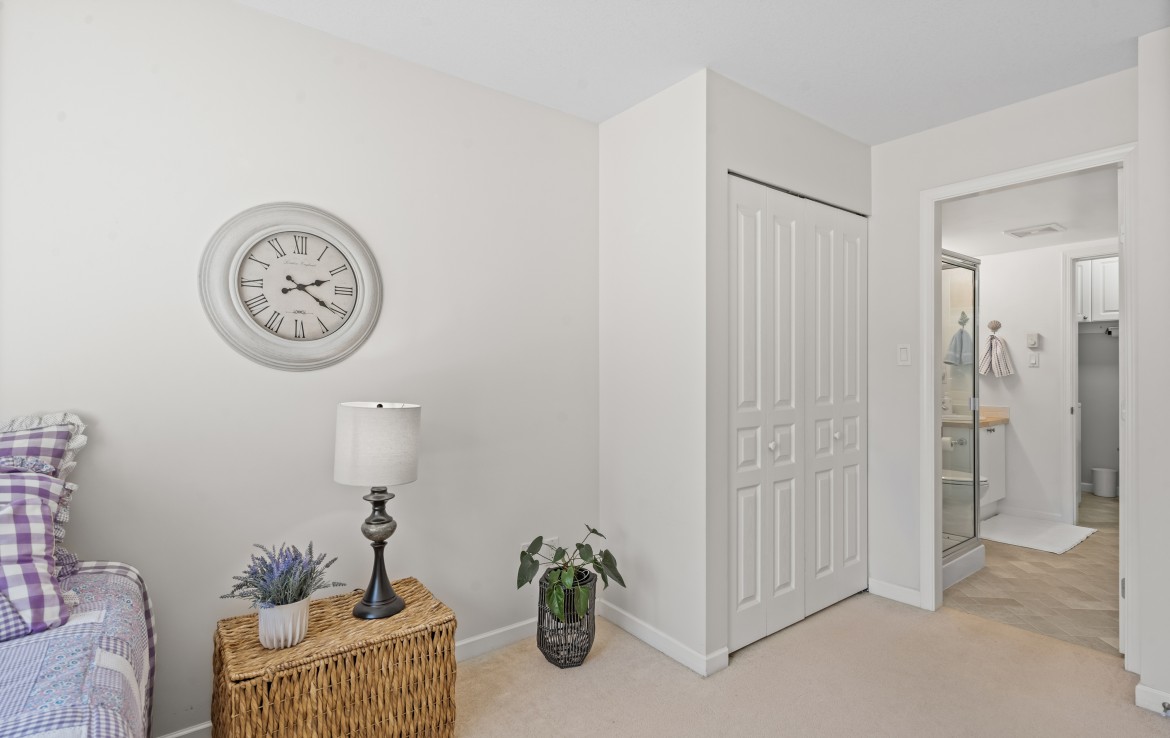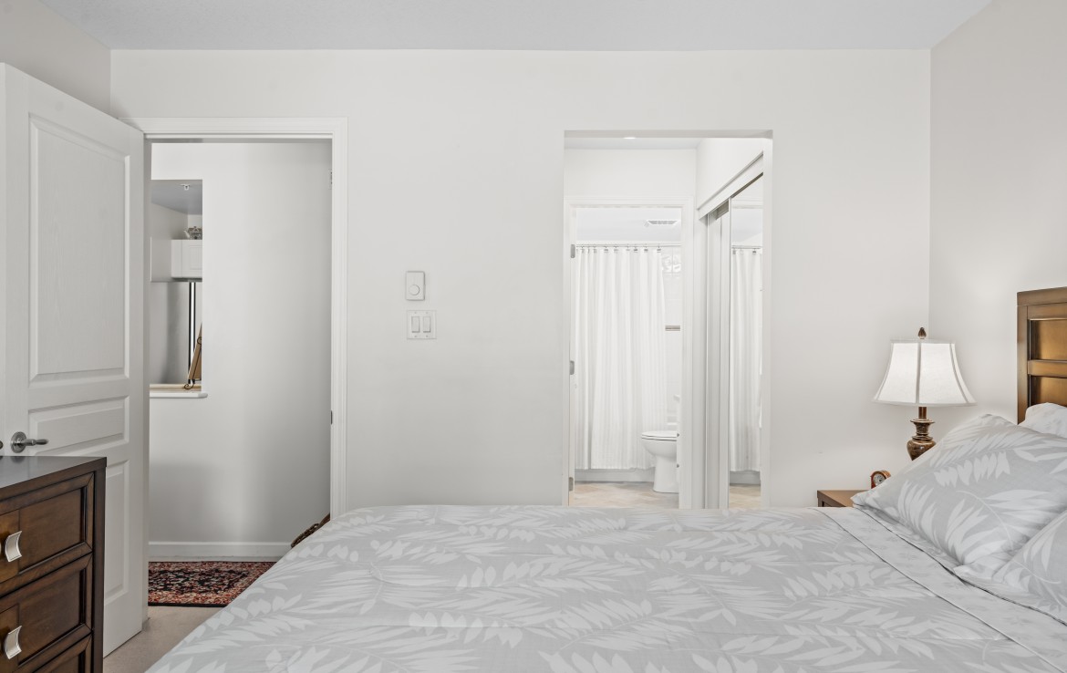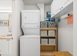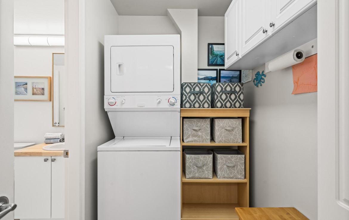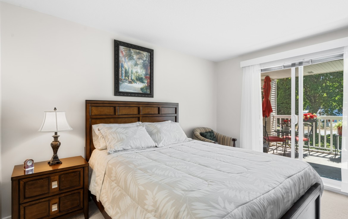 The primary bedroom offers a sliding door to the deck, dual closets and a four-piece ensuite. The second bedroom has access to the main three-piece bathroom. There is also an in-unit laundry room with storage and two separate storage lockers.