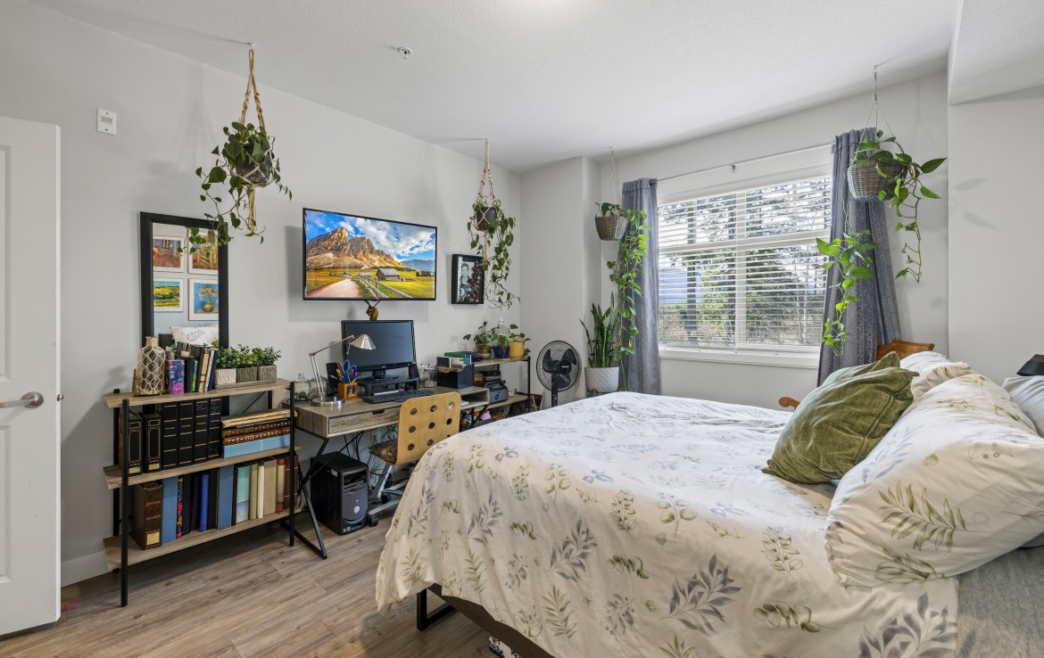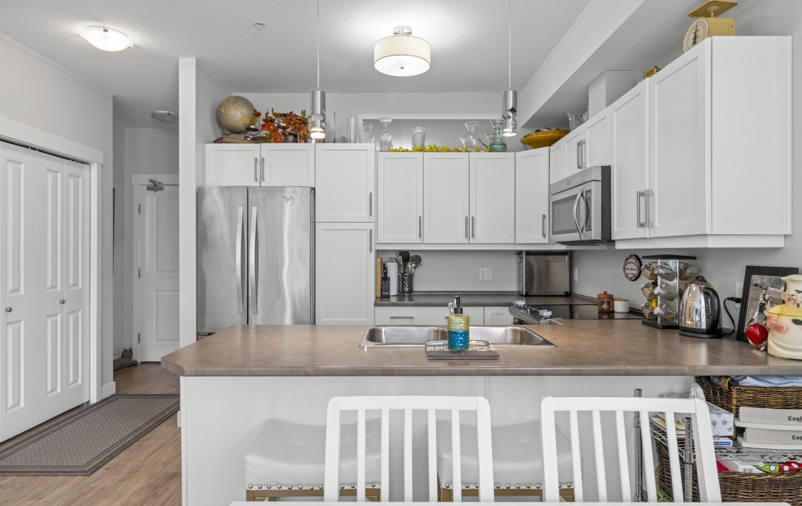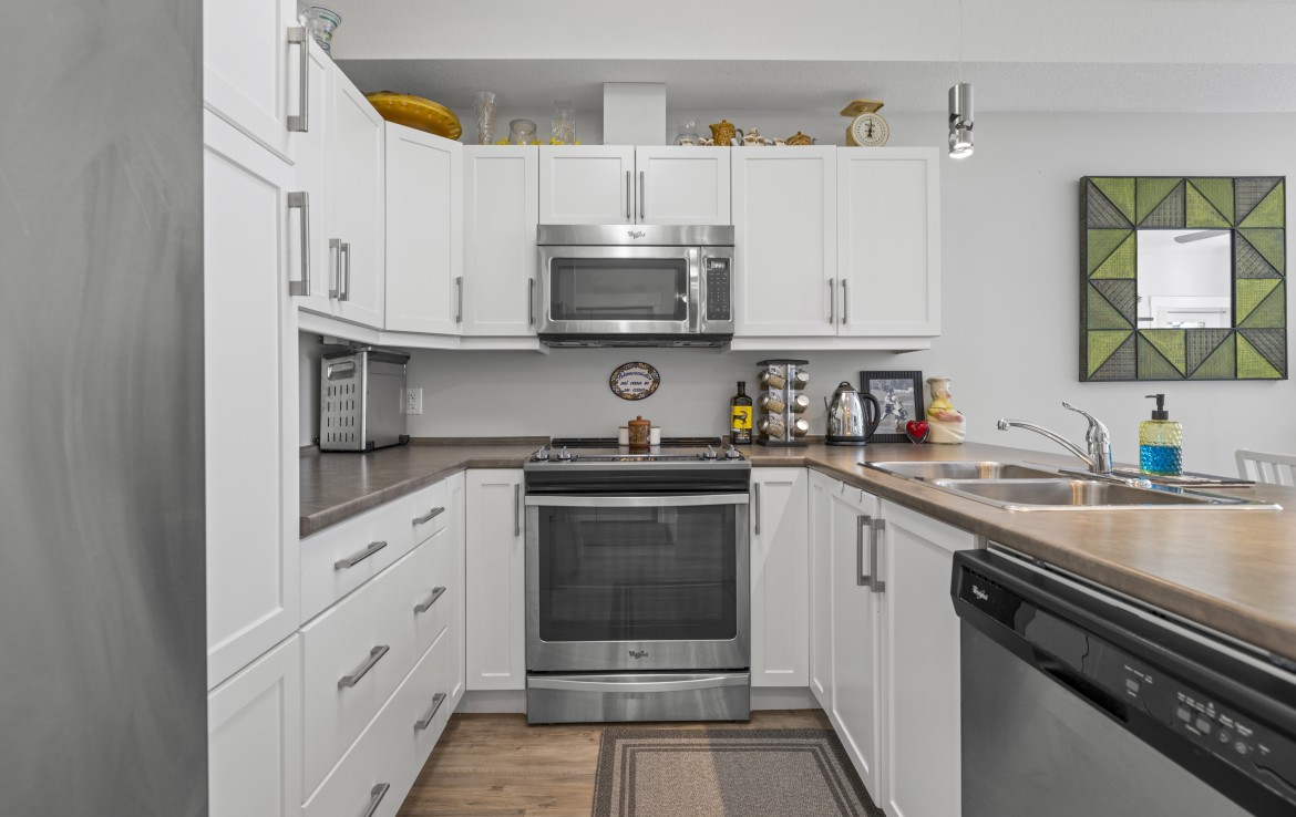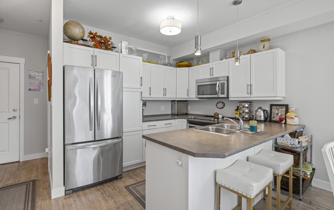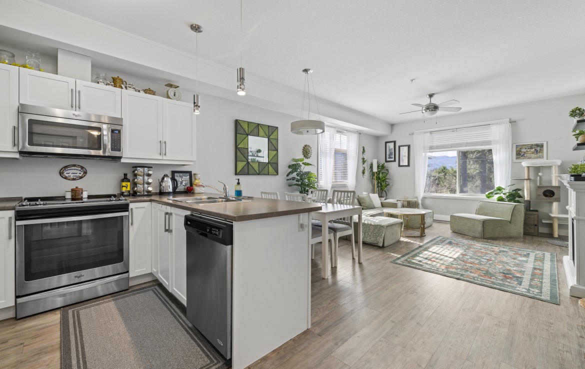 This well-designed unit with mountain views offers two bedrooms plus a spacious den, ideal for a home office. The open-concept layout is both functional and inviting, featuring abundant storage and a covered balcony for year-round enjoyment. The kitchen is equipped with four stainless steel appliances, ample white cabinetry, and great workspace. The primary bedroom includes a walk-in closet and a private three-piece ensuite.