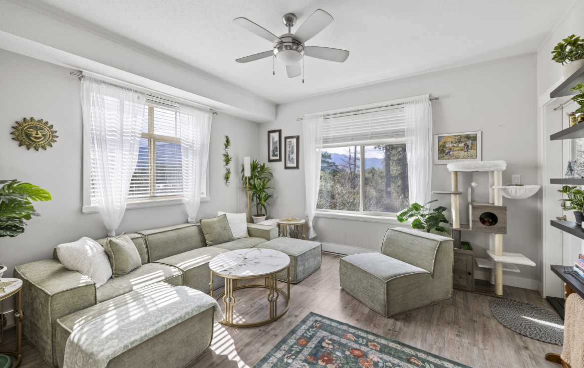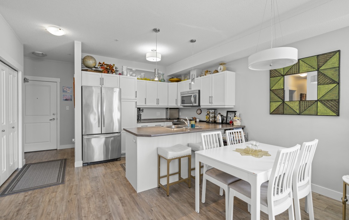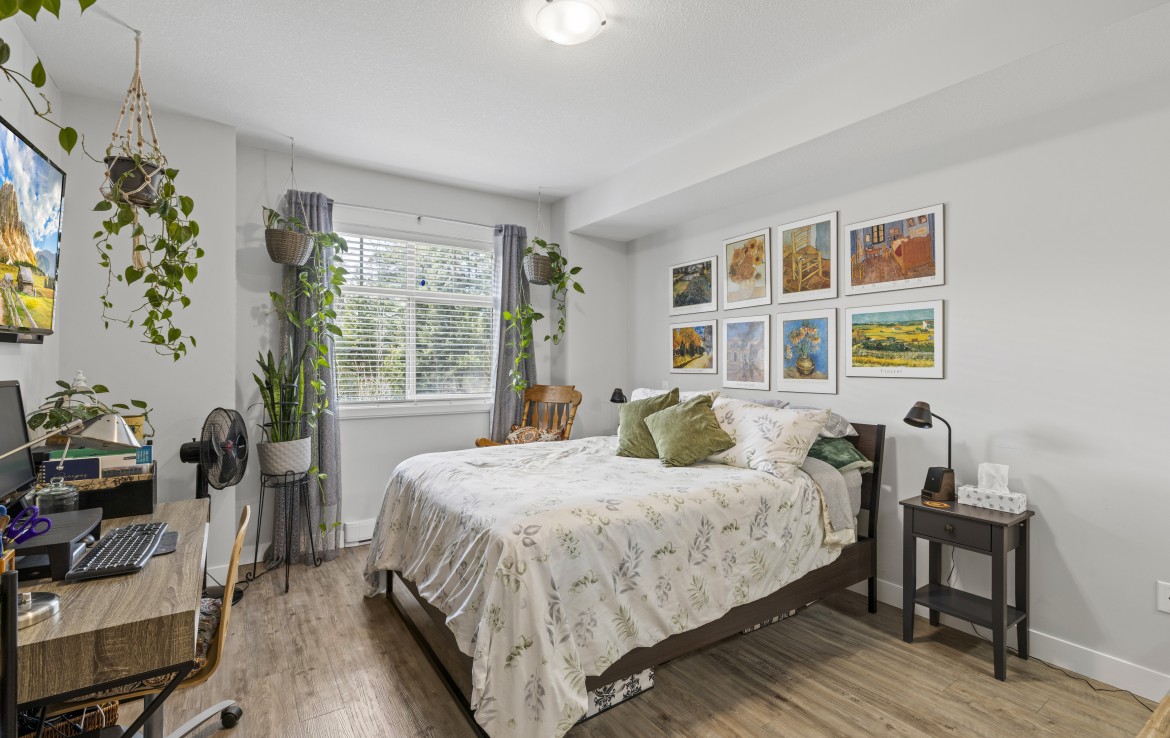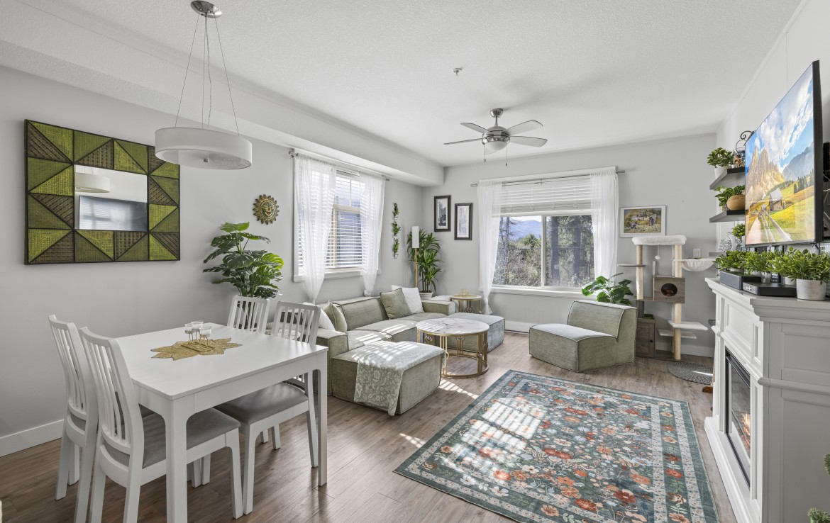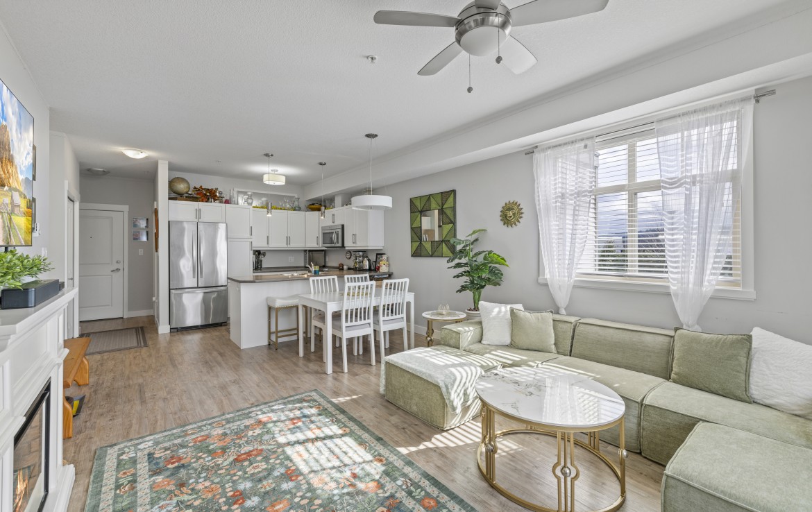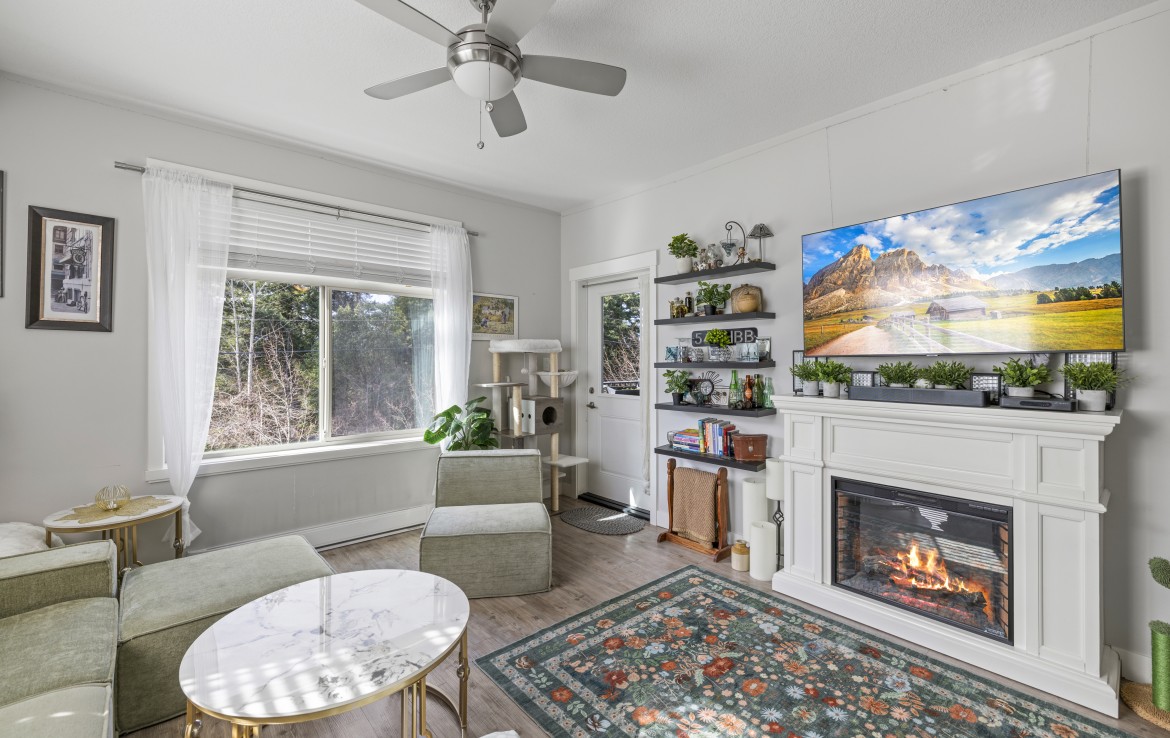 This well-designed unit with mountain views offers two bedrooms plus a spacious den, ideal for a home office. The open-concept layout is both functional and inviting, featuring abundant storage and a covered balcony for year-round enjoyment. The kitchen is equipped with four stainless steel appliances, ample white cabinetry, and great workspace. The primary bedroom includes a walk-in closet and a private three-piece ensuite.