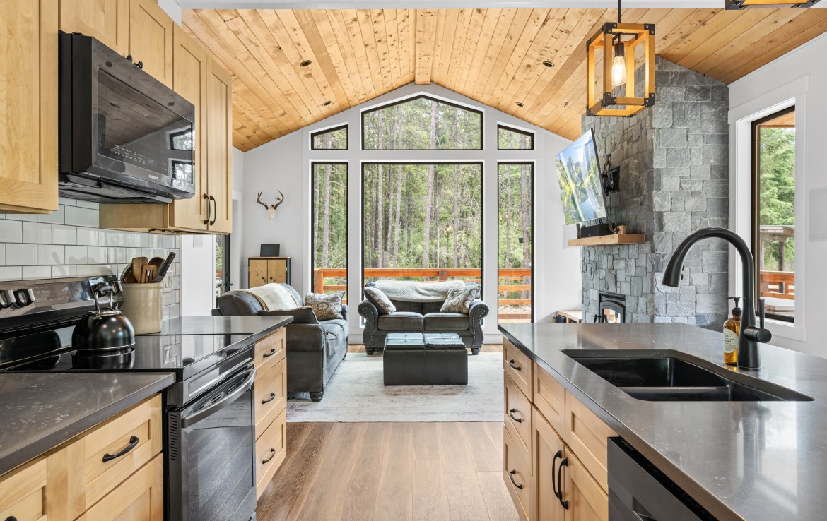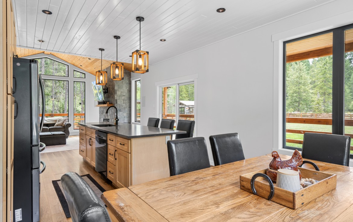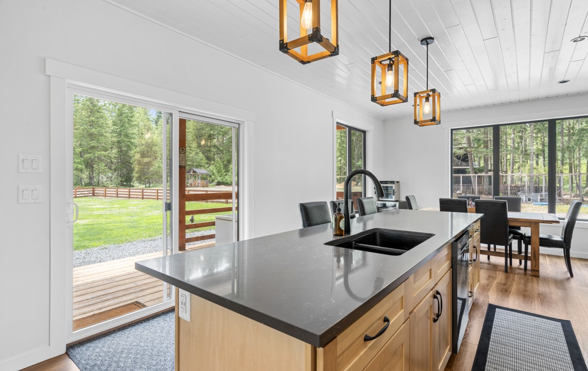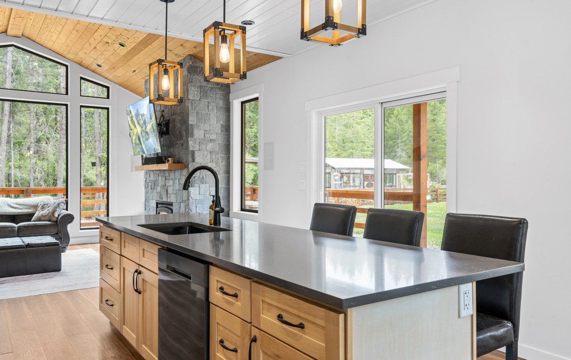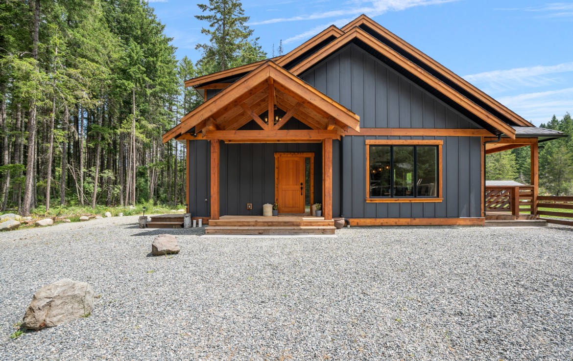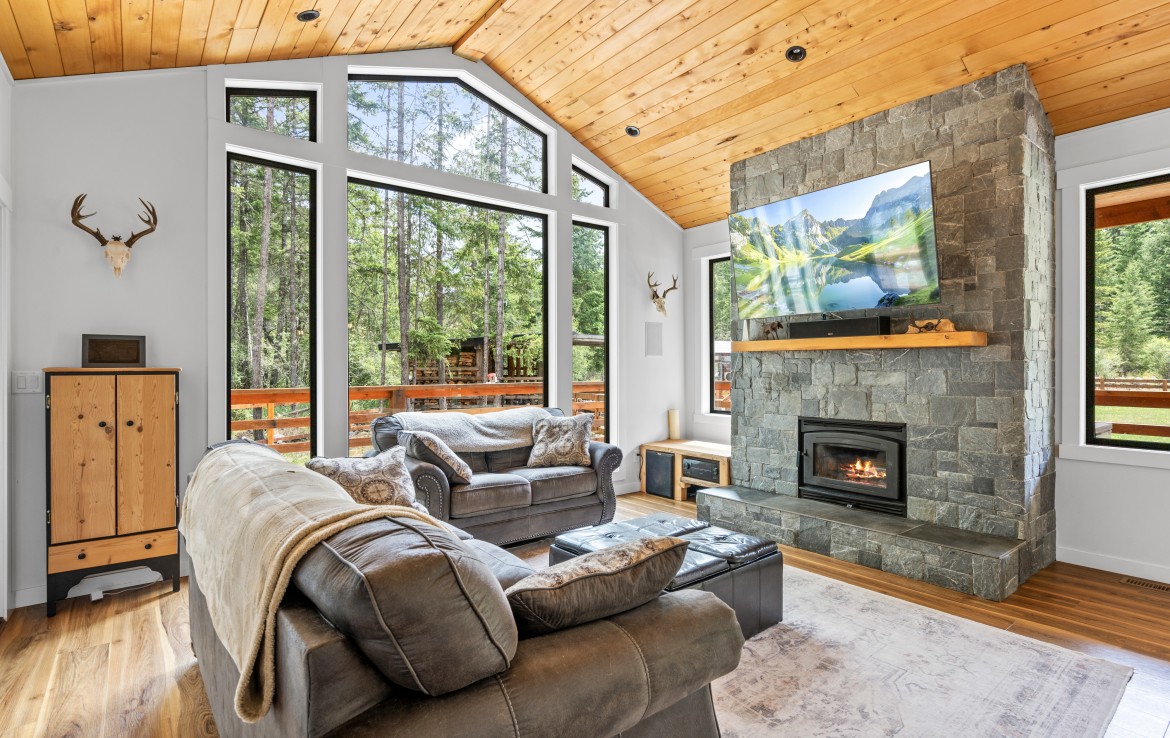 Welcome to your private 15.8-acre retreat with 600 feet of slow-moving riverfront, complete with peaceful swimming holes and the soothing sounds of nature. This custom-built three bedroom, three bathroom home offers modern comfort in a park-like setting. Designed with quality and efficiency in mind, it features a Pacific Energy wood-burning fireplace with floor-to-ceiling stone surround, a stunning kitchen with quartz countertops, 10’ island, and black stainless appliances, plus a main-level primary suite.