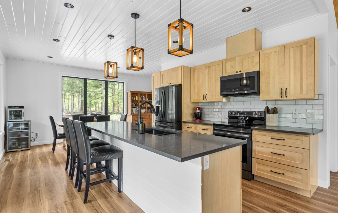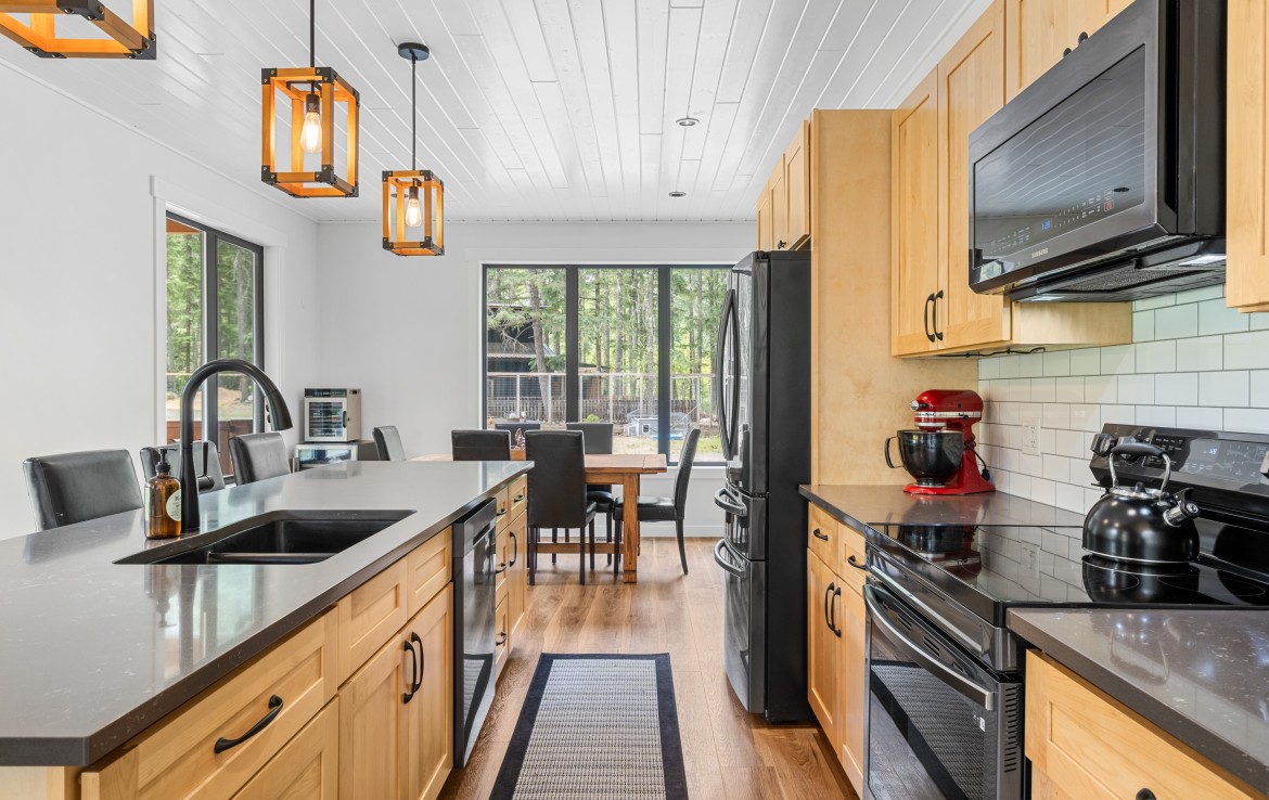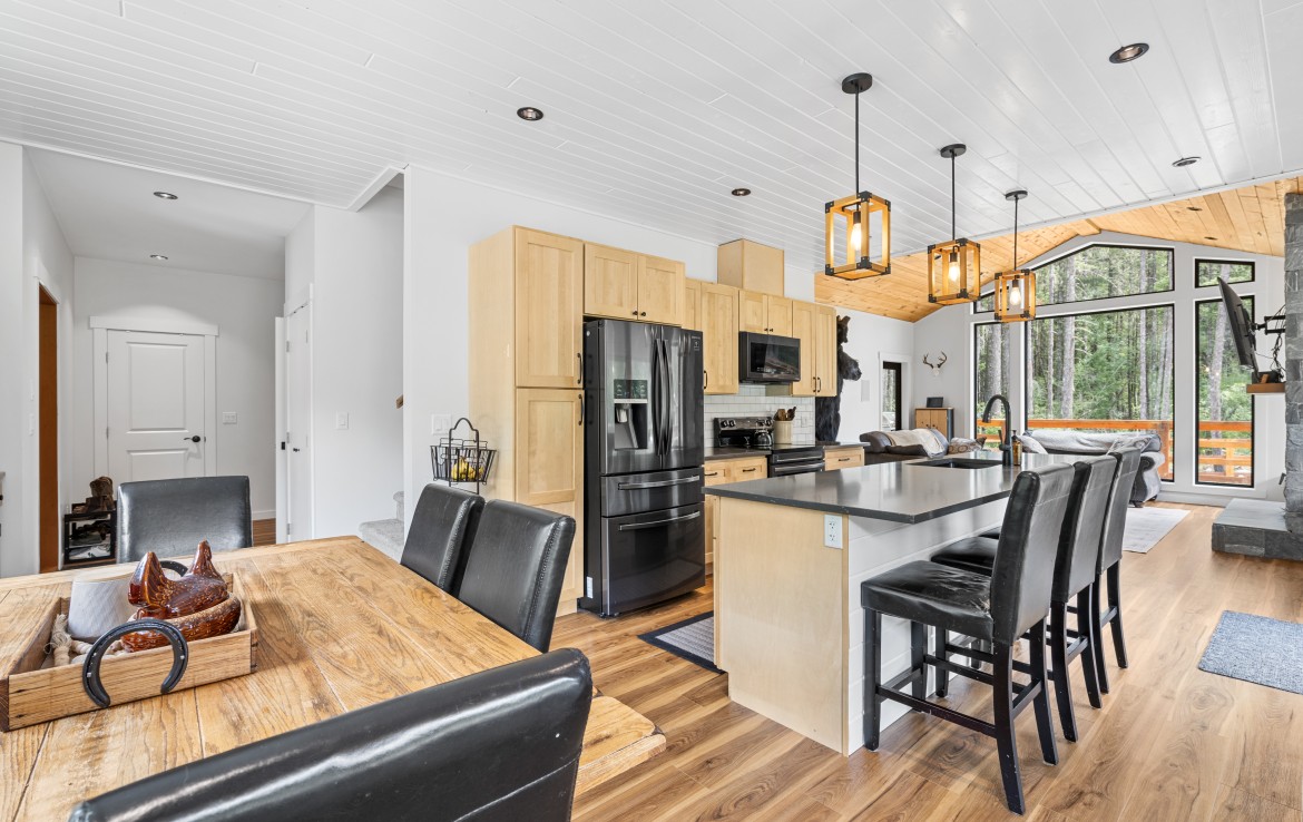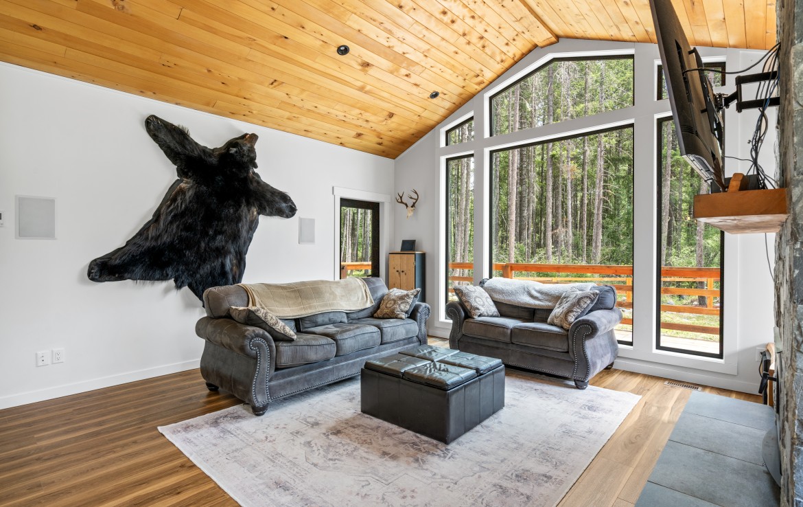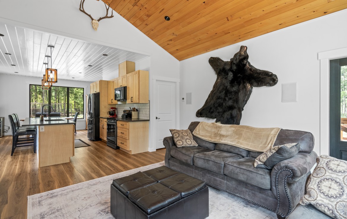 Welcome to your private 15.8-acre retreat with 600 feet of slow-moving riverfront, complete with peaceful swimming holes and the soothing sounds of nature. This custom-built three bedroom, three bathroom home offers modern comfort in a park-like setting. Designed with quality and efficiency in mind, it features a Pacific Energy wood-burning fireplace with floor-to-ceiling stone surround, a stunning kitchen with quartz countertops, 10’ island, and black stainless appliances, plus a main-level primary suite.
