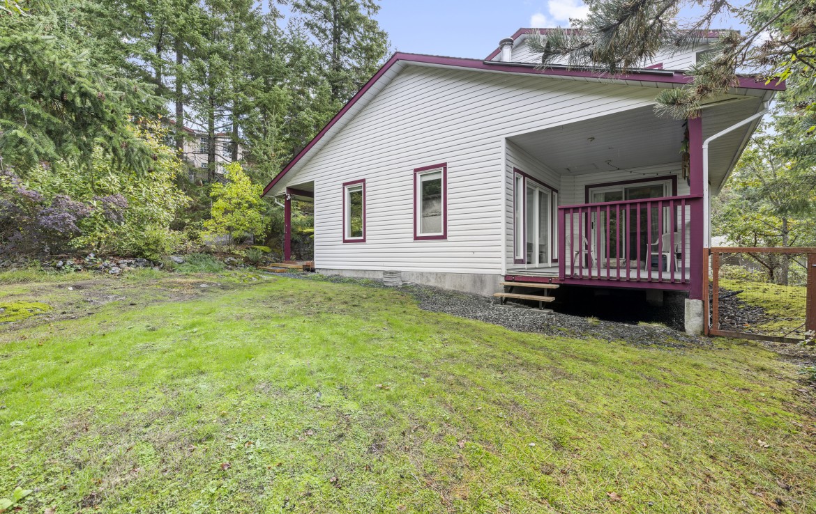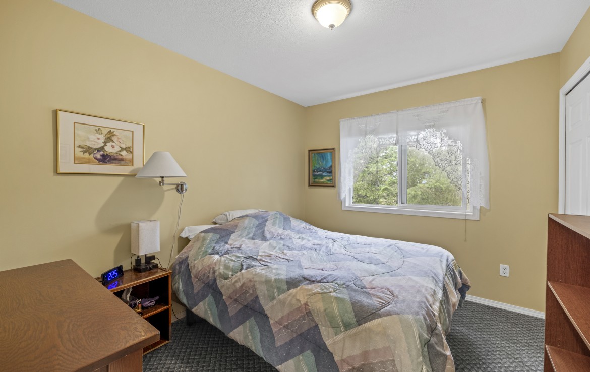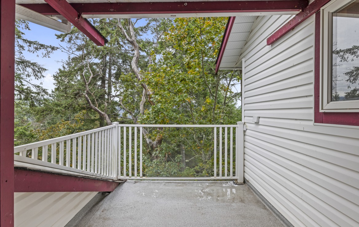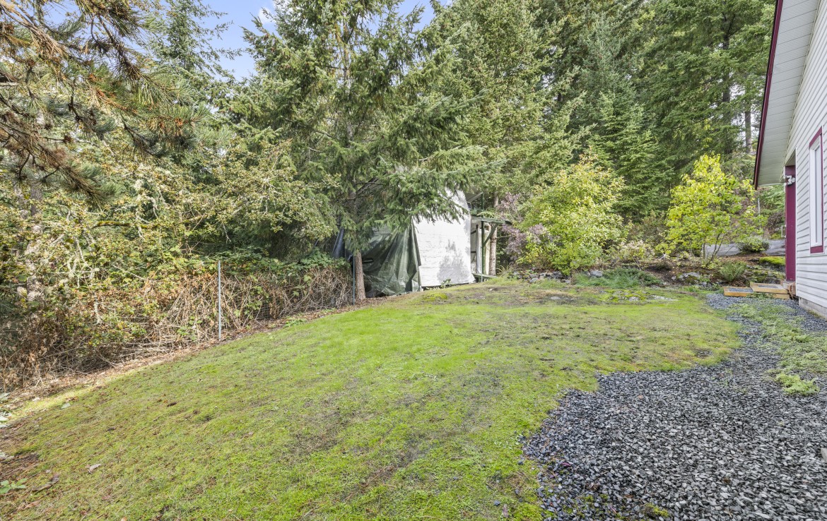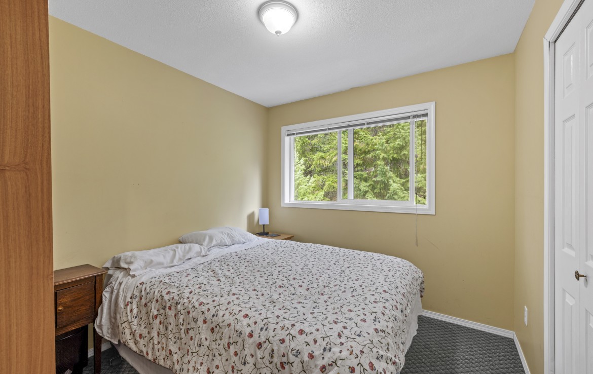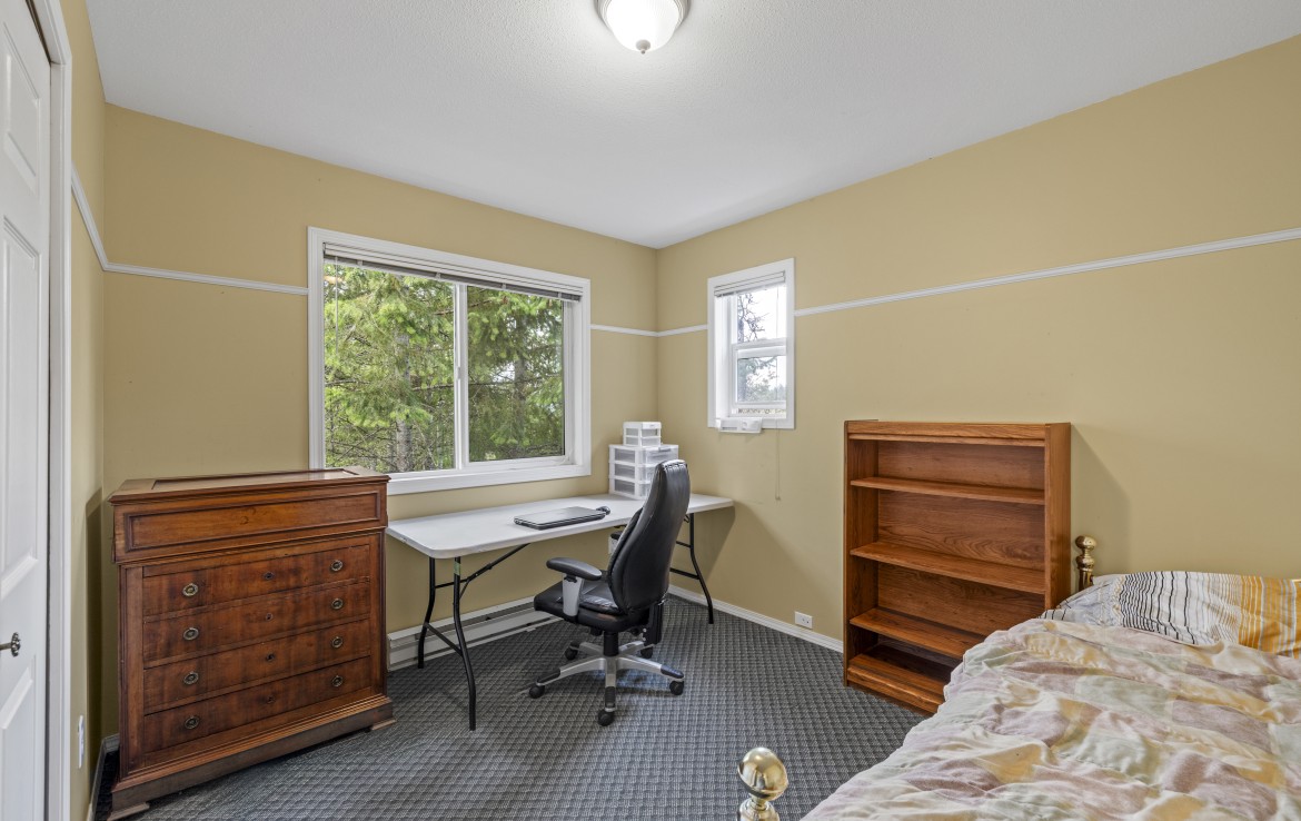Upstairs, the primary bedroom includes a walk-in closet, four-piece ensuite and access to a partially covered deck. Three additional bedrooms and a four-piece main bathroom complete the upper level. Added features include a double garage, carport, multiple decks for outdoor enjoyment and two storey shed with potential use as a greenhouse. This home offers privacy and space in a peaceful setting close to parks, beaches, Fairwinds amenities, and a nearby school bus stop—perfect for family living.