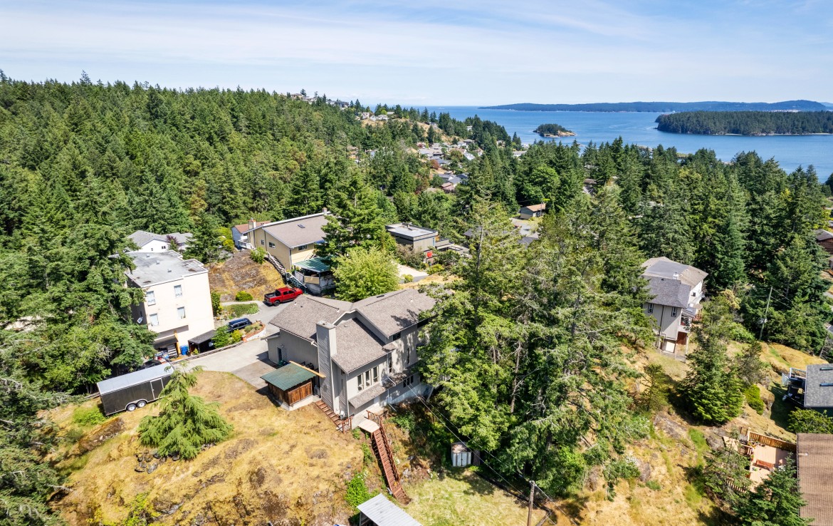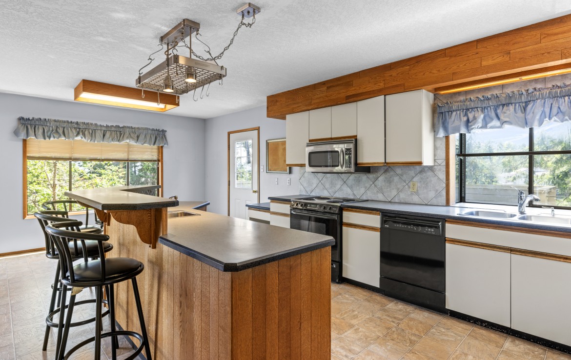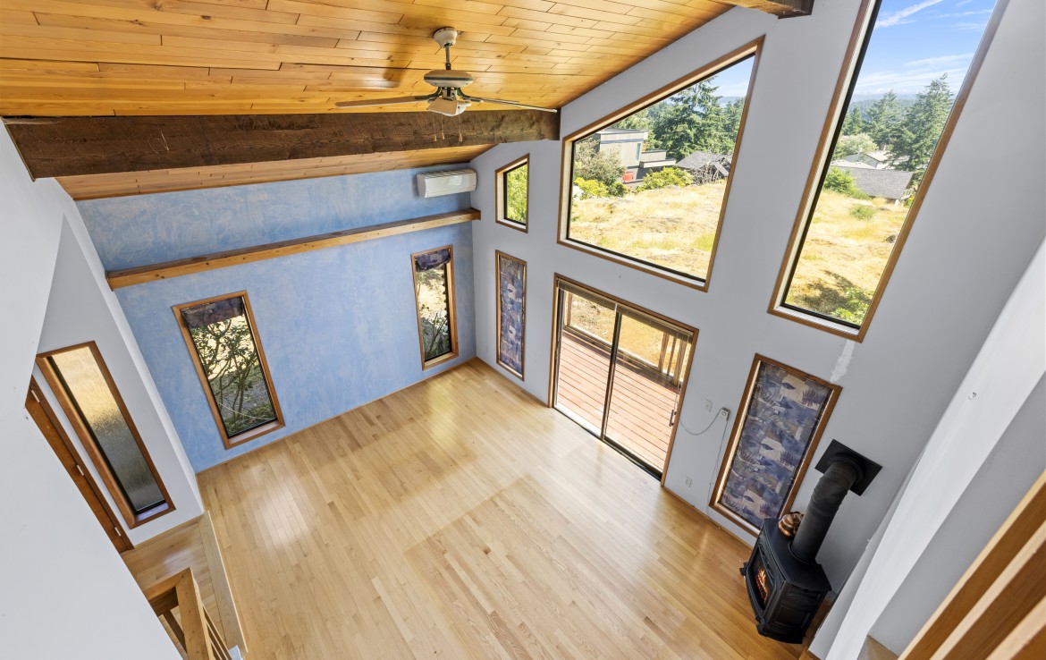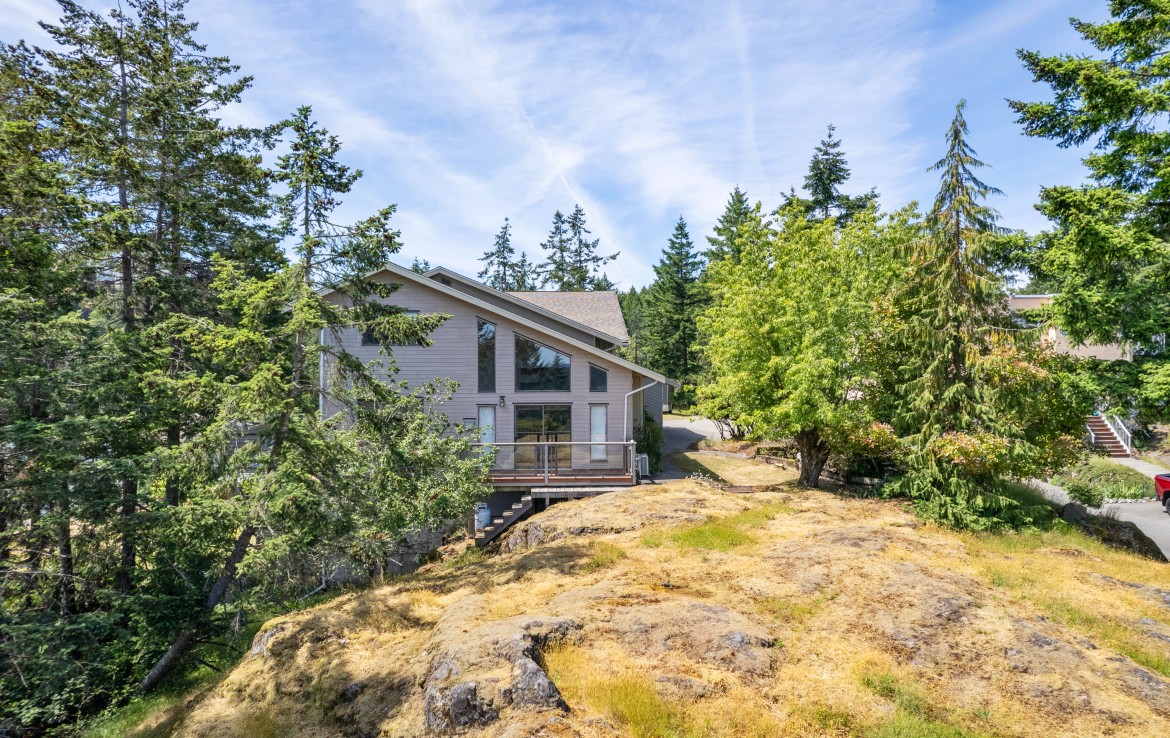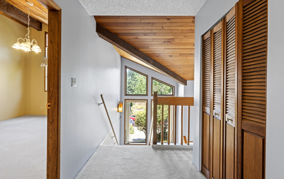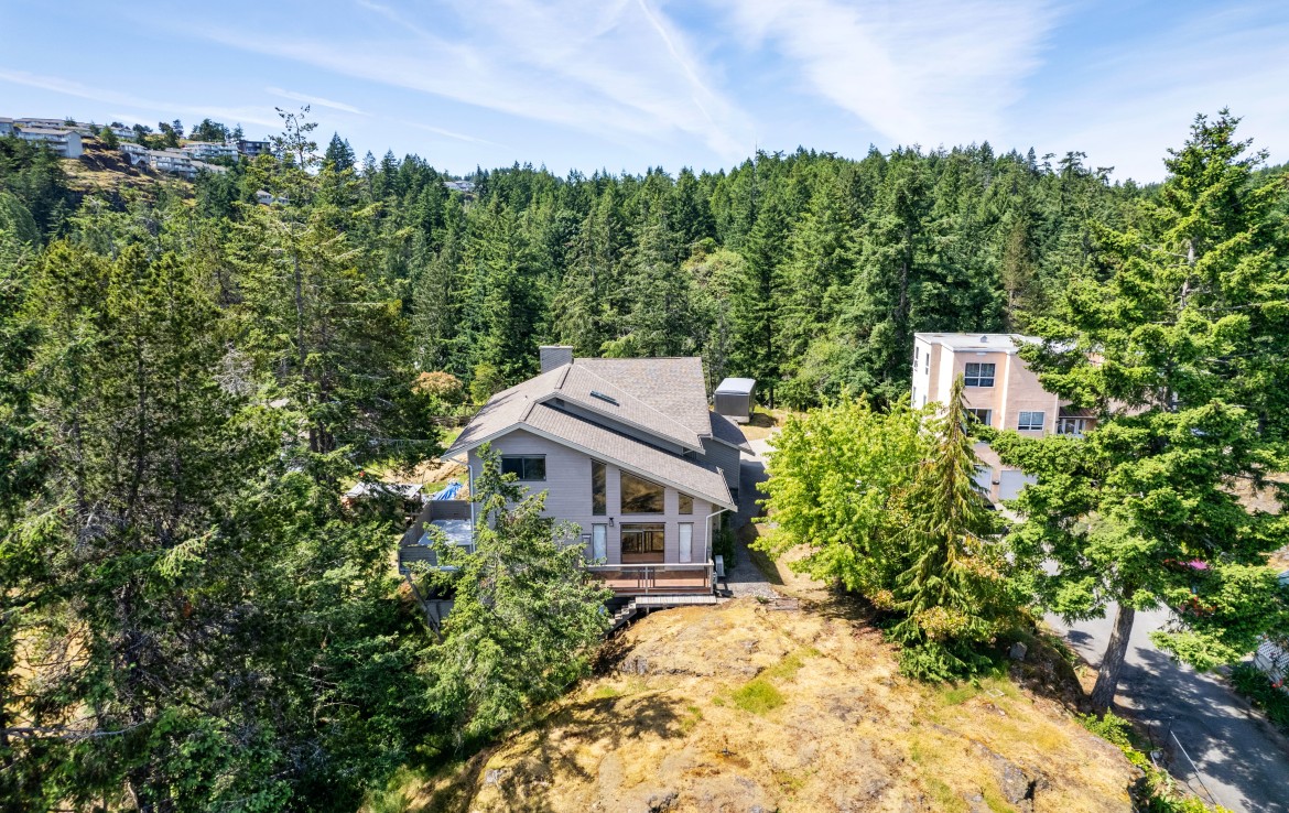 This custom-built ocean view West Coast-style home offers a rare opportunity to own in a peaceful, established neighbourhood near Linley Valley trails and beach access. Thoughtfully designed to reflect its natural surroundings, the home features soaring vaulted ceilings, warm wood accents, and abundant windows that bring in natural light. The main level includes a living room and family room—both with vaulted ceilings—a kitchen with eating nook, formal dining room, two-piece bathroom, and laundry.