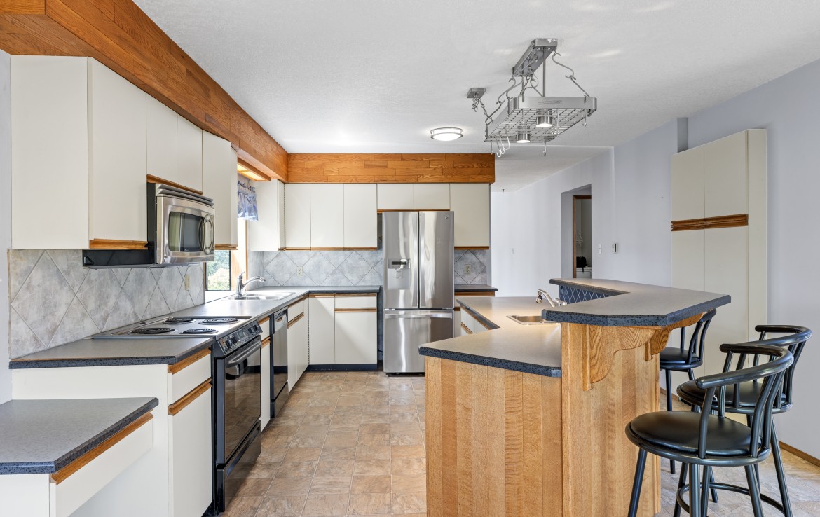 Upstairs are four bedrooms, including a spacious primary with vaulted ceilings, an oversized closet and a 4-piece ensuite with dual vanity. A second 4-piece bathroom completes the upper level. Downstairs offers great flex space with a large rec room, wet bar, two-piece bathroom, and multiple storage areas. Additional features include abundant parking and a workshop/storage area at the back of the carport. All data and measurements are approximate and must be verified if fundamental.