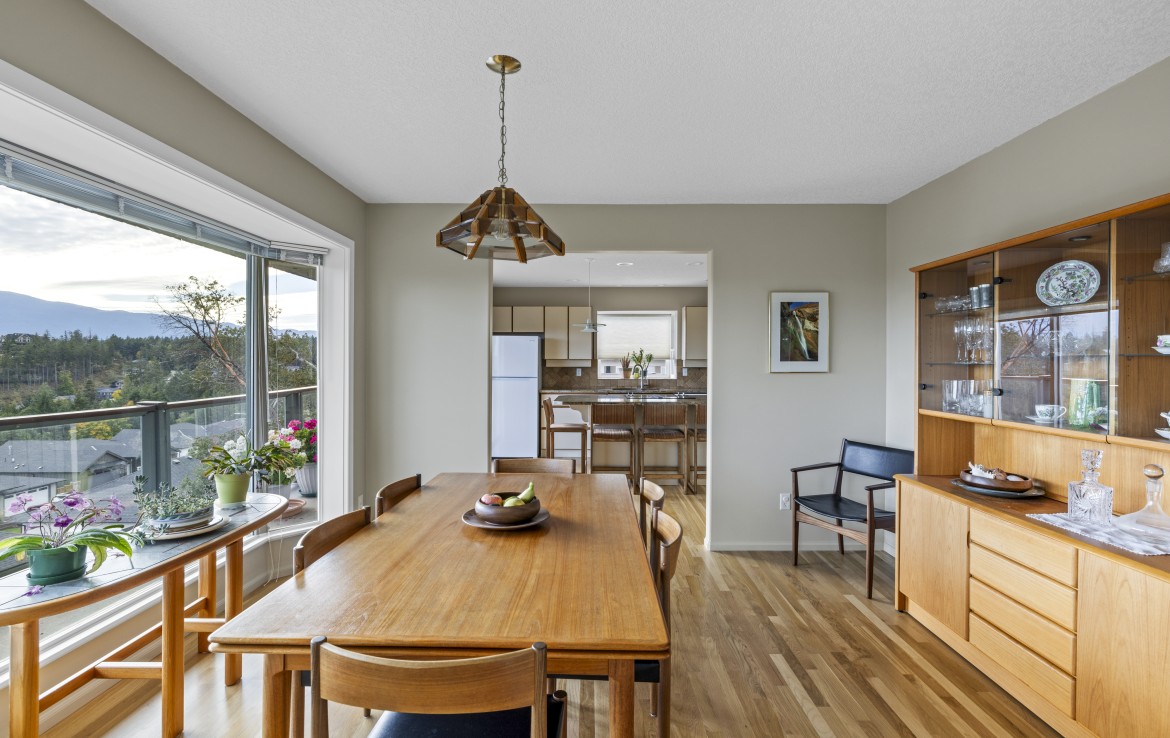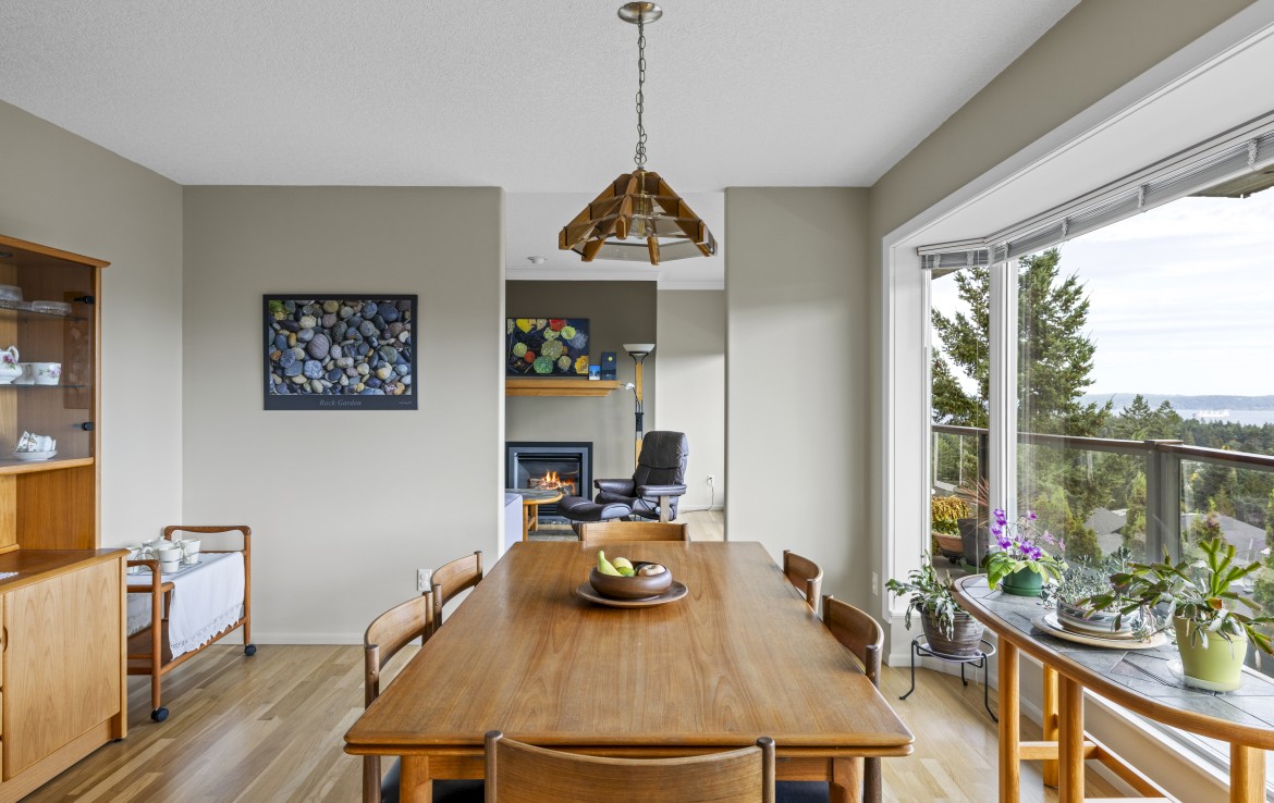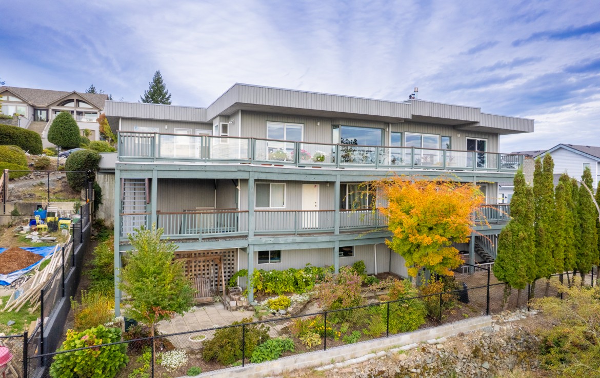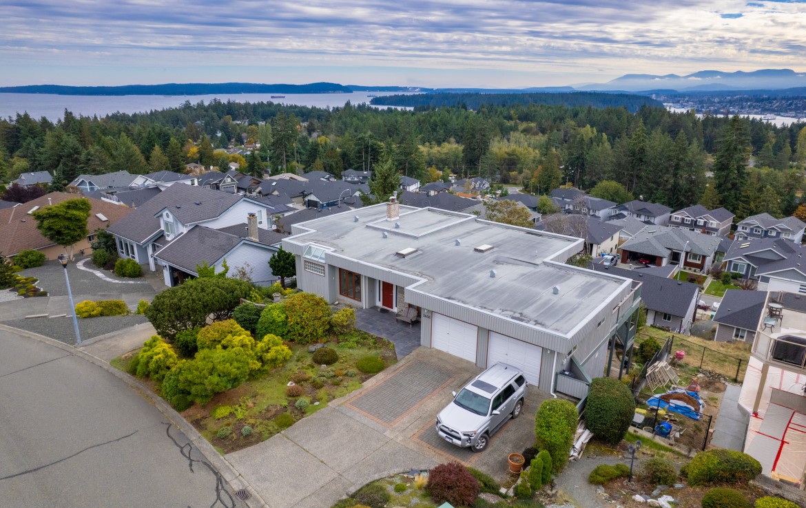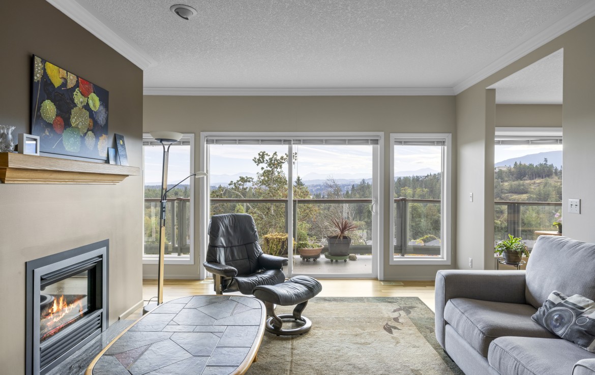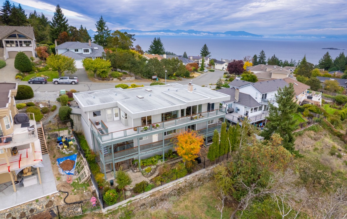 Enjoy stunning panoramic views stretching from the ocean to Mount Benson from this impressive home. Floor-to-ceiling windows and refinished hardwood flooring enhance the main living areas. The spacious kitchen features a large centre island with an eating bar leading to a generous dining room and living room with gas fireplace. The main level includes three bedrooms, including a primary with a three-piece ensuite and walk-in closet, plus a three-piece main bathroom.