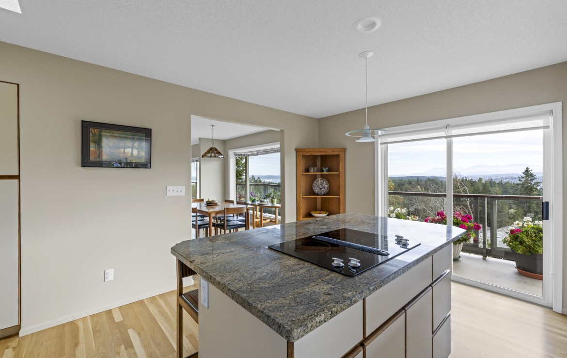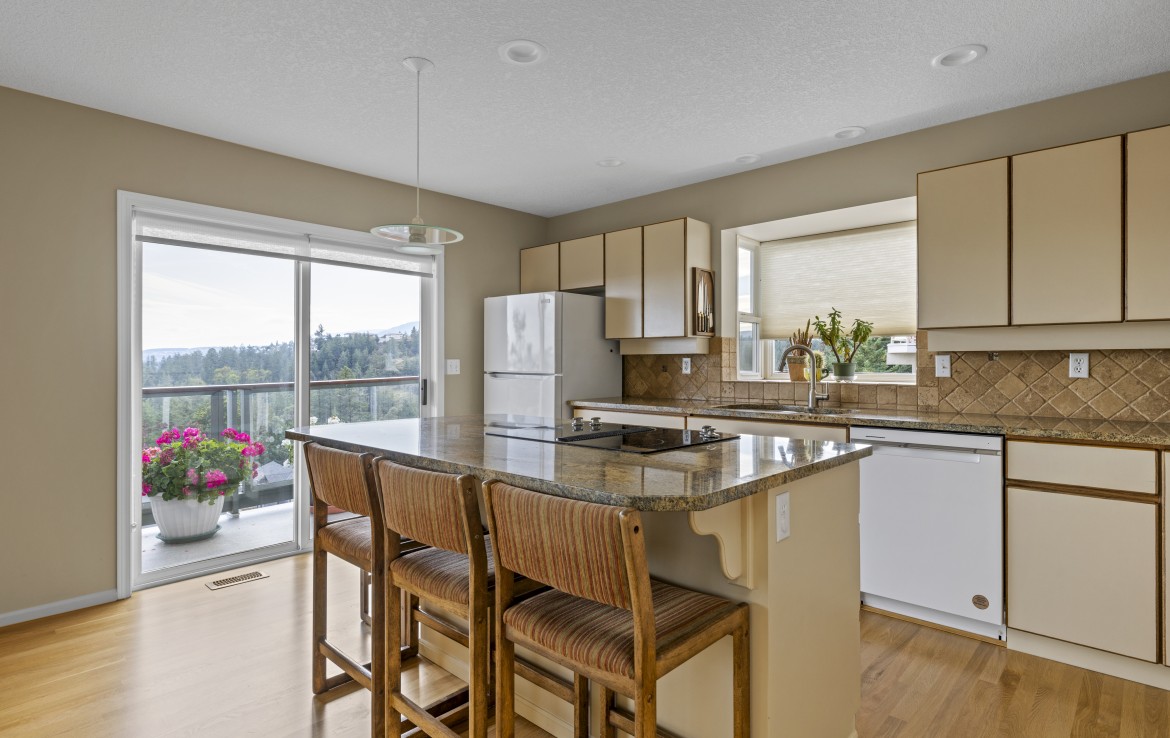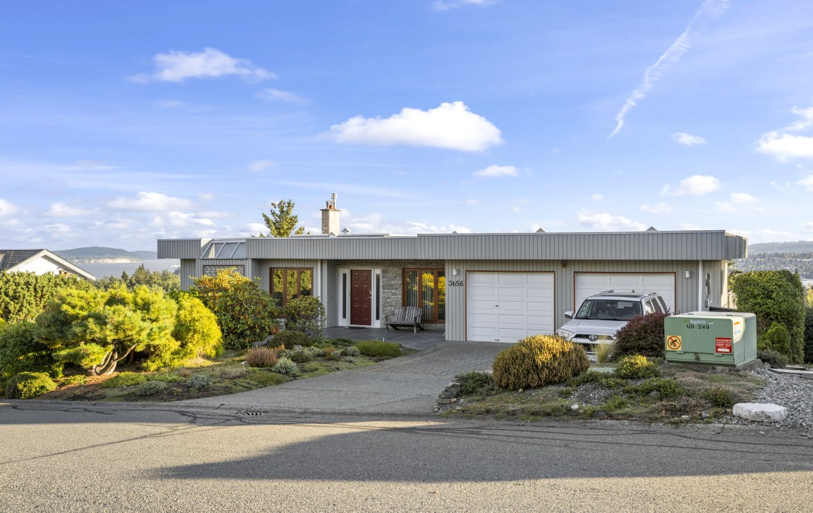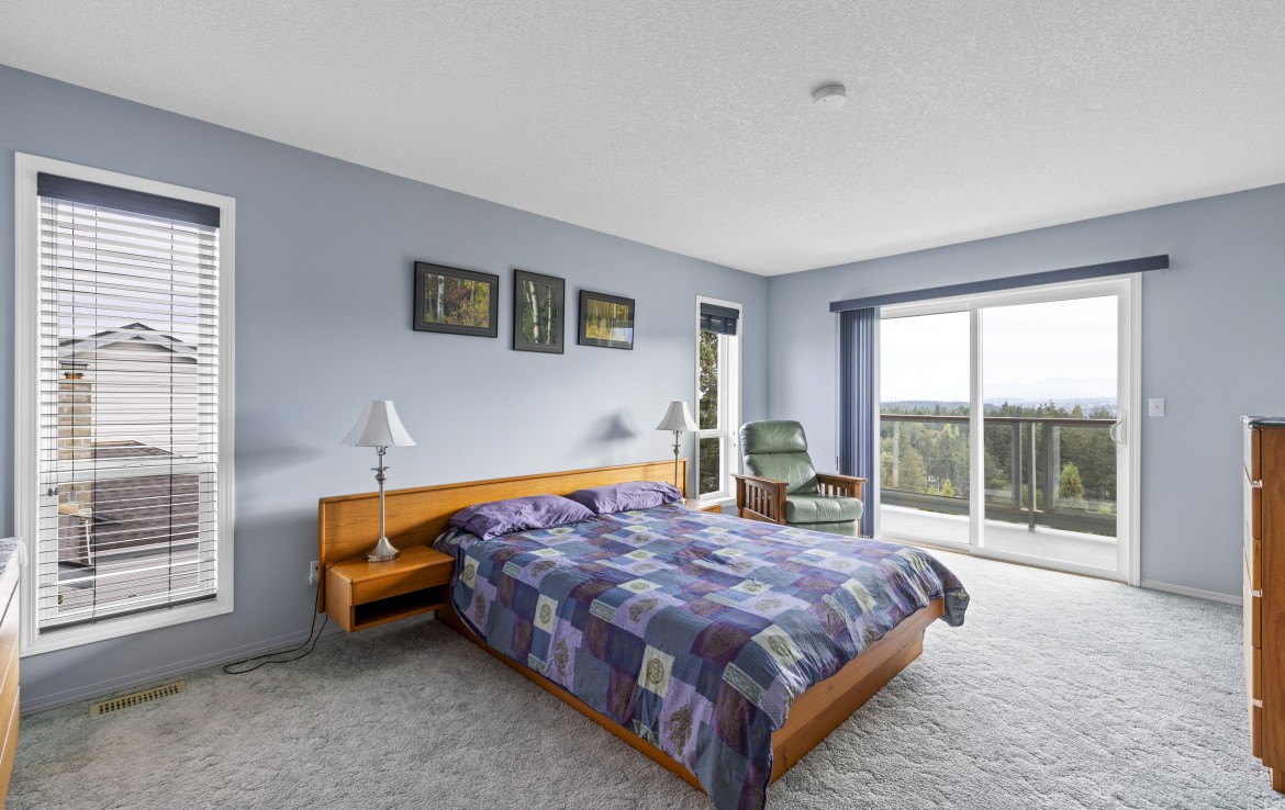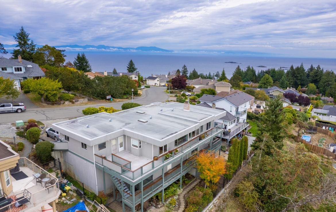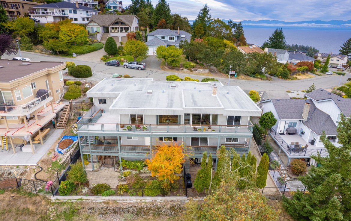 Enjoy stunning panoramic views stretching from the ocean to Mount Benson from this impressive home. Floor-to-ceiling windows and refinished hardwood flooring enhance the main living areas. The spacious kitchen features a large centre island with an eating bar leading to a generous dining room and living room with gas fireplace. The main level includes three bedrooms, including a primary with a three-piece ensuite and walk-in closet, plus a three-piece main bathroom.