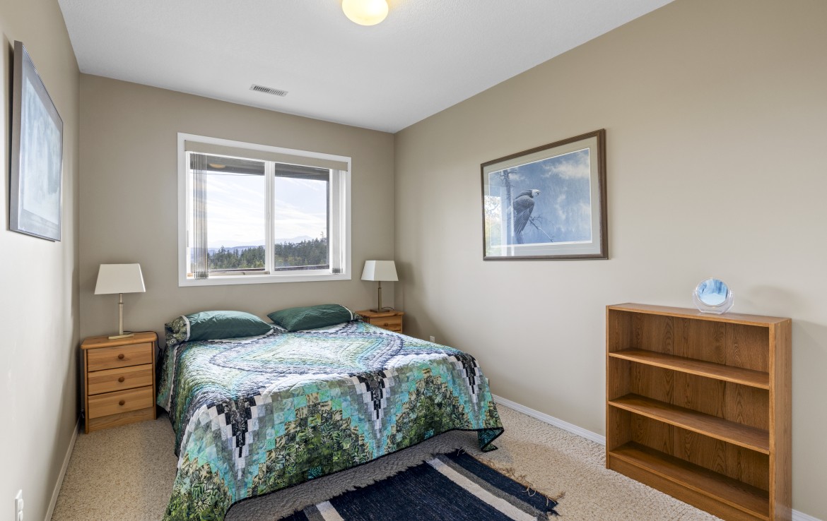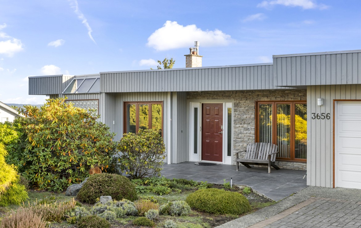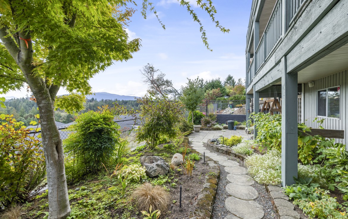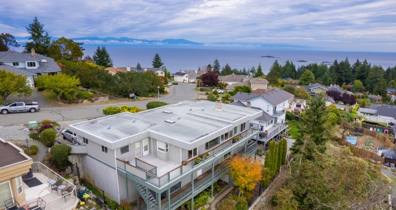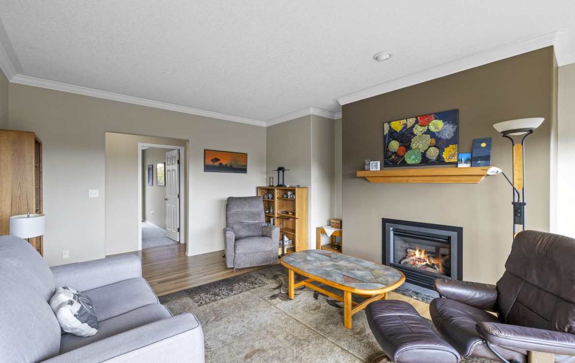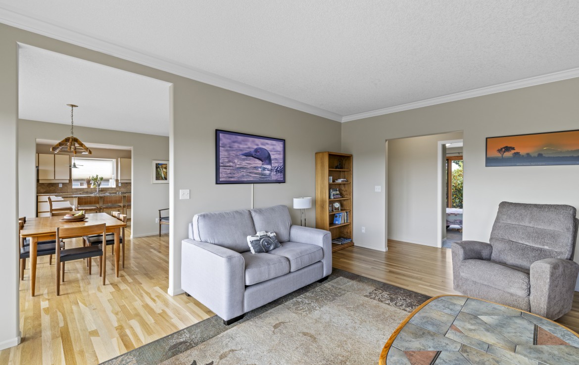 Enjoy stunning panoramic views stretching from the ocean to Mount Benson from this impressive home. Floor-to-ceiling windows and refinished hardwood flooring enhance the main living areas. The spacious kitchen features a large centre island with an eating bar leading to a generous dining room and living room with gas fireplace. The main level includes three bedrooms, including a primary with a three-piece ensuite and walk-in closet, plus a three-piece main bathroom.