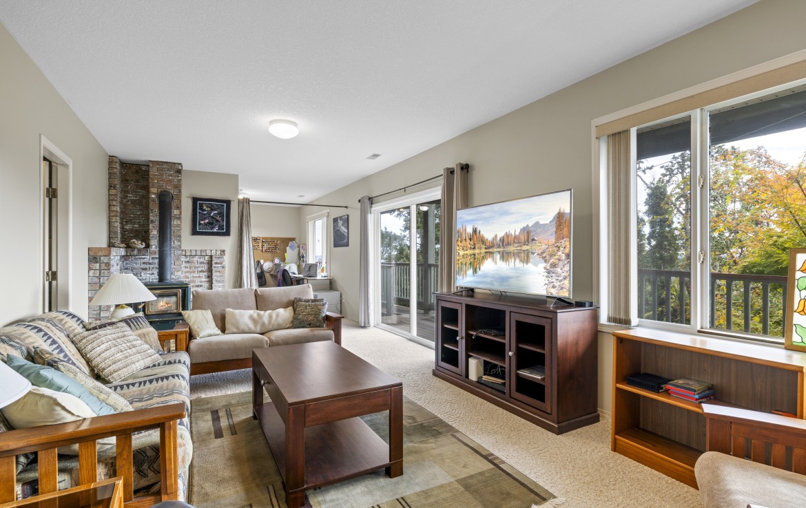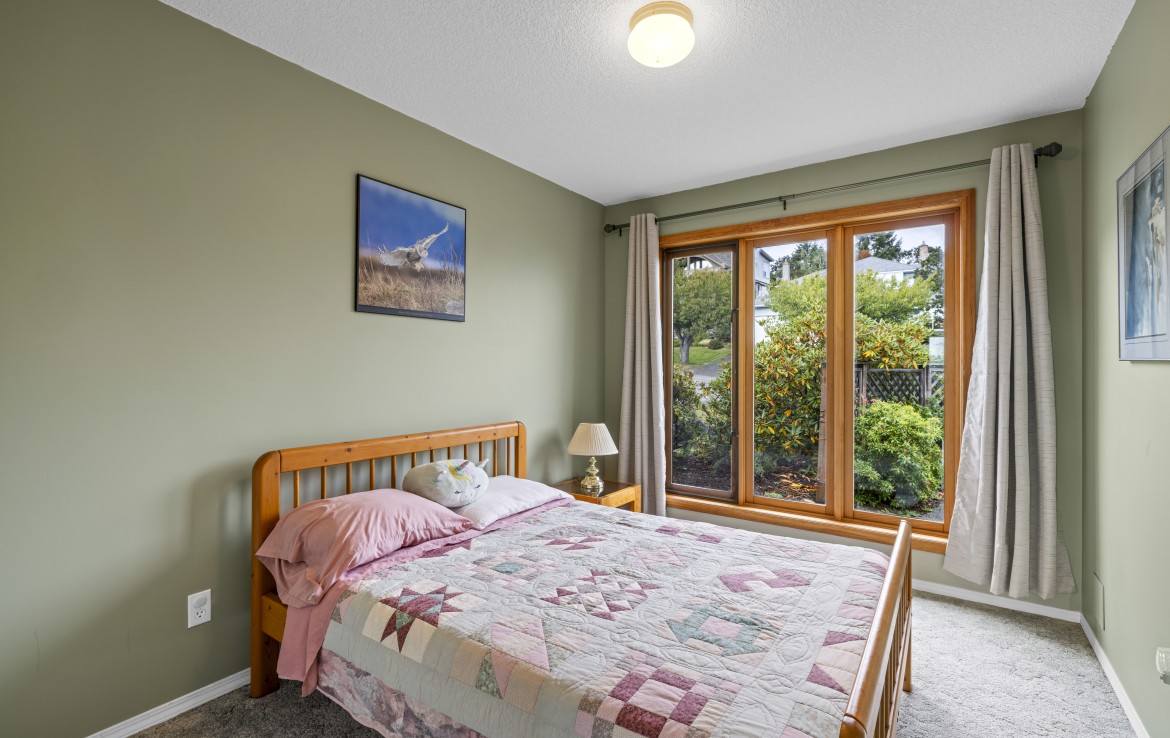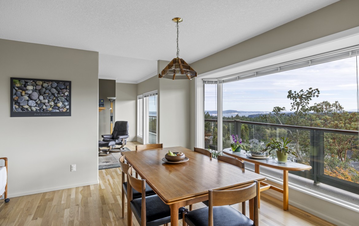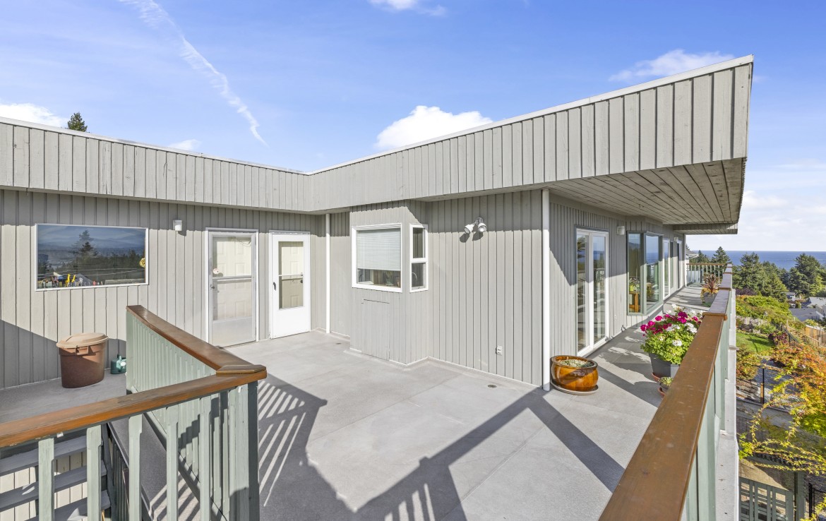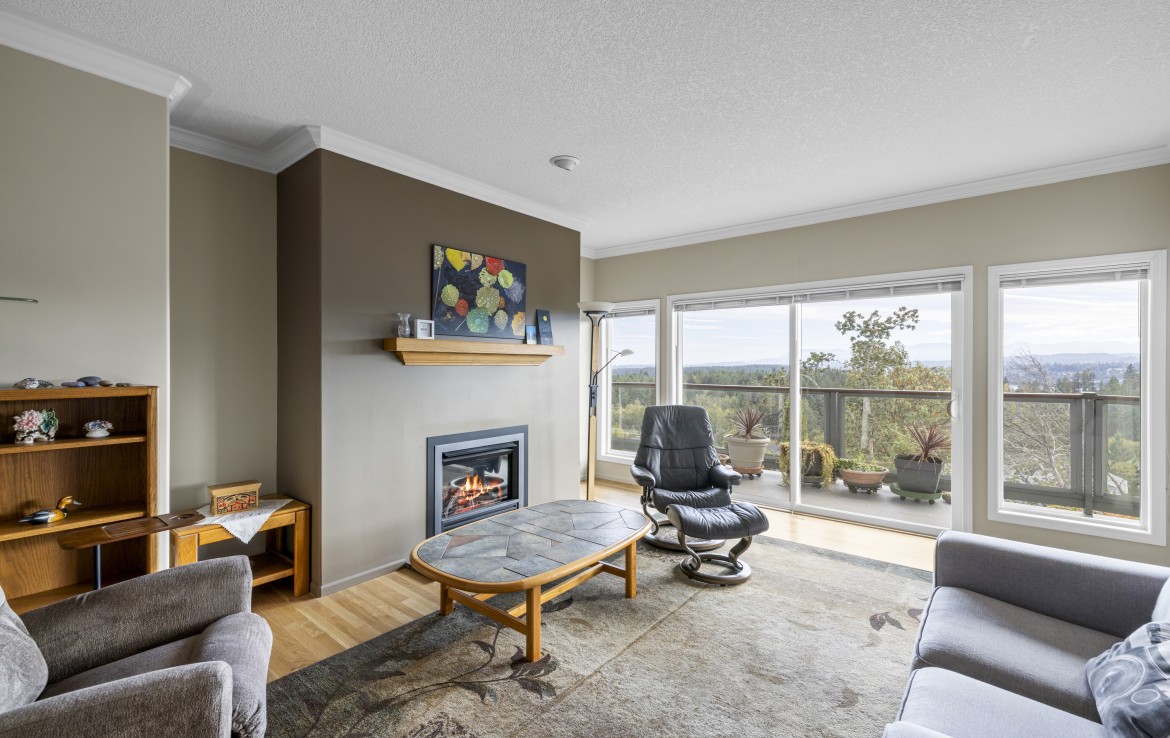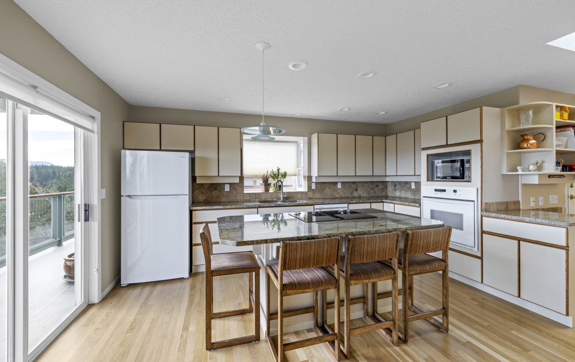 Enjoy stunning panoramic views stretching from the ocean to Mount Benson from this impressive home. Floor-to-ceiling windows and refinished hardwood flooring enhance the main living areas. The spacious kitchen features a large centre island with an eating bar leading to a generous dining room and living room with gas fireplace. The main level includes three bedrooms, including a primary with a three-piece ensuite and walk-in closet, plus a three-piece main bathroom.