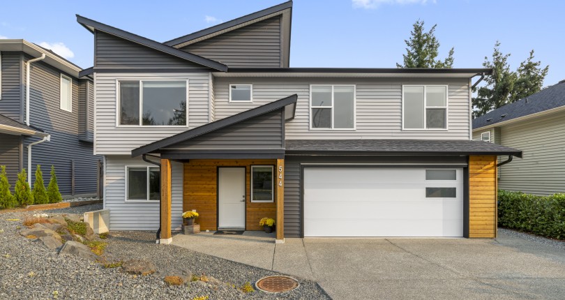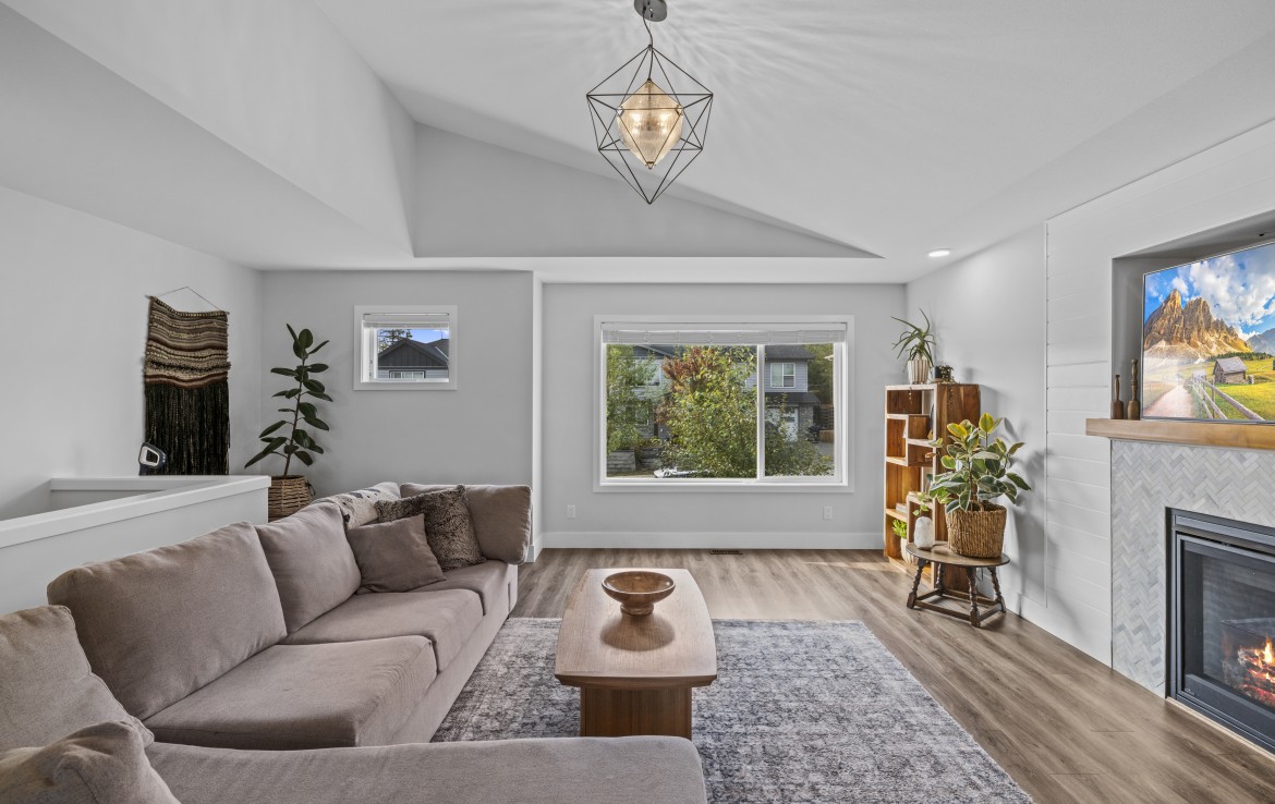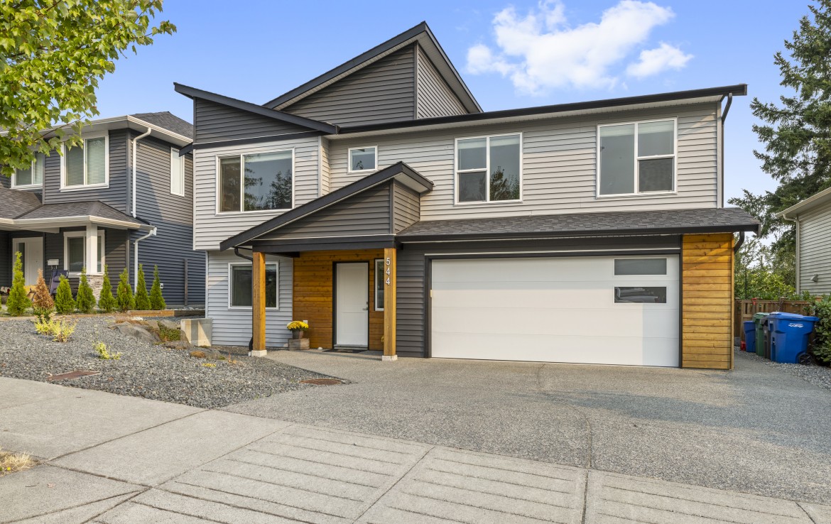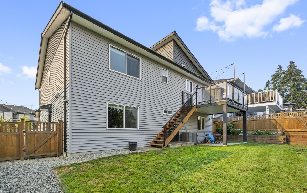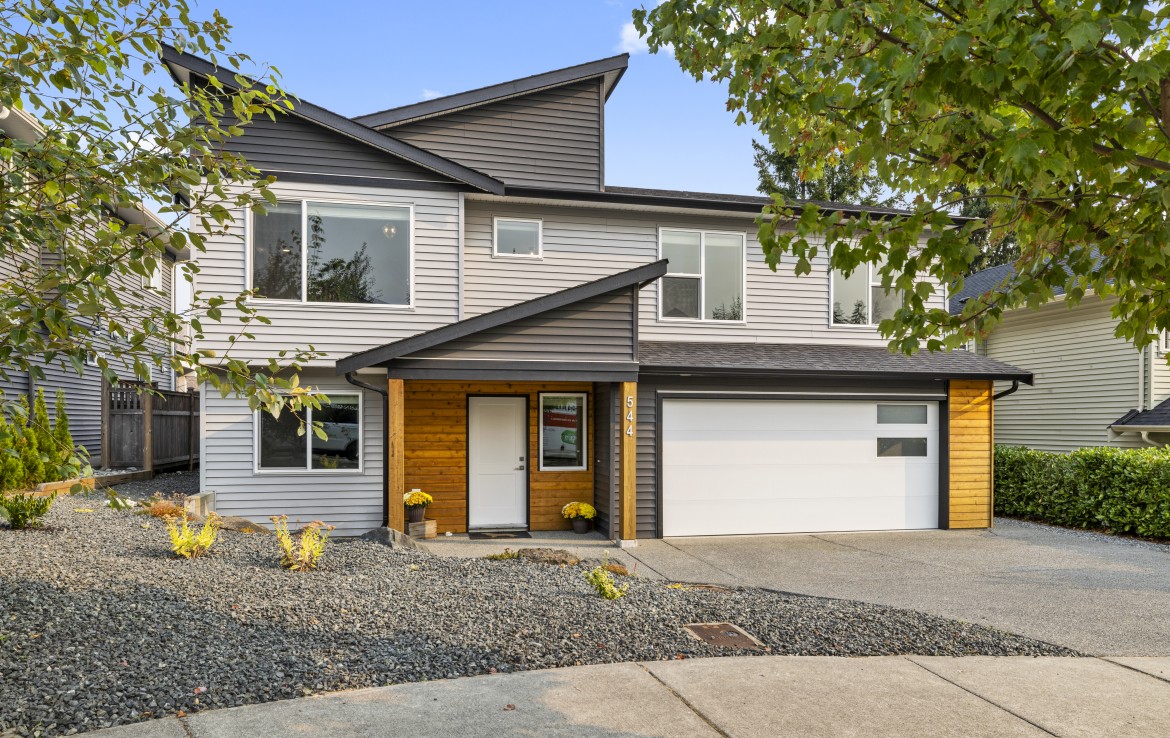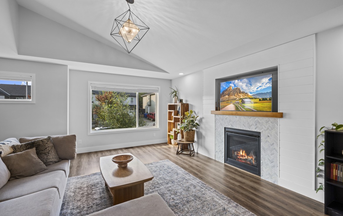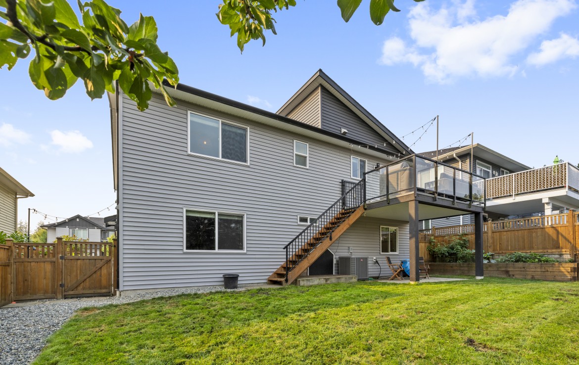 Located on a desirable cul-de-sac, this newer home offers an open concept main level with Westcoast-style vaulted ceilings. The kitchen features four stainless appliances, abundant white cabinetry, a stylish backsplash, and an island with eating bar. A gas fireplace warms the living room, while the dining area provides access to a deck with stairs leading to the backyard. The main level includes three bedrooms, with the spacious primary offering a walk-in closet and three-piece ensuite.