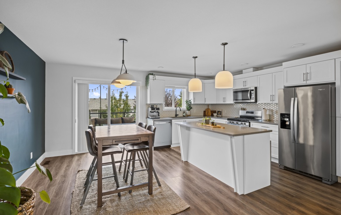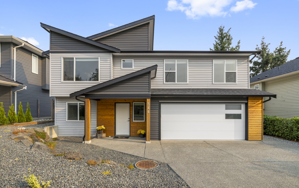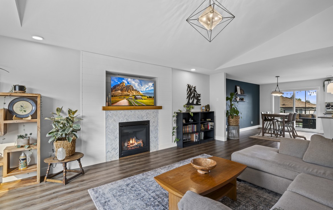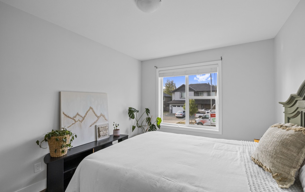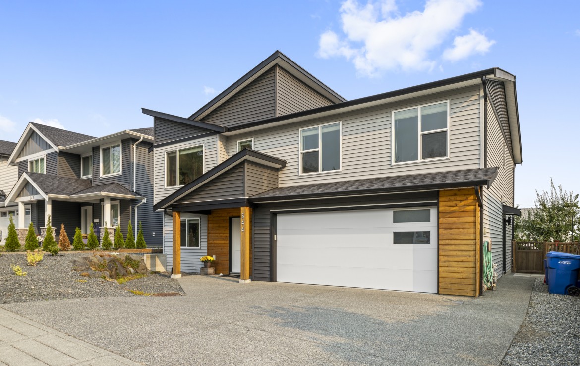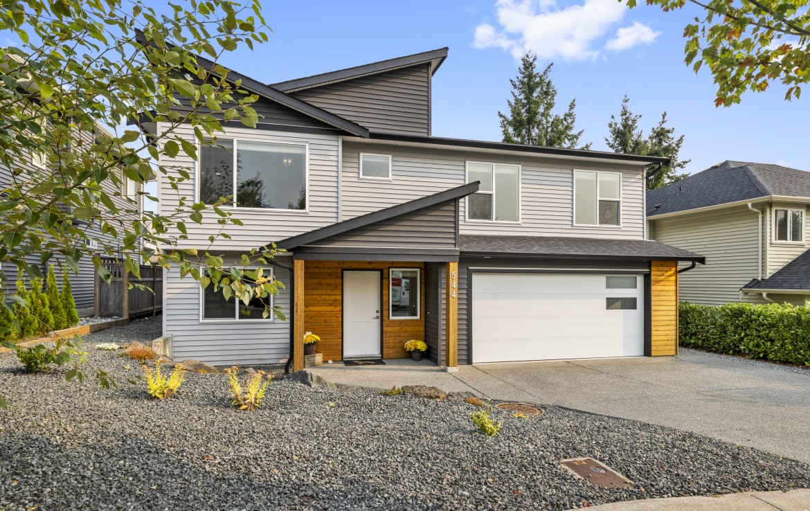 Located on a desirable cul-de-sac, this newer home offers an open concept main level with Westcoast-style vaulted ceilings. The kitchen features four stainless appliances, abundant white cabinetry, a stylish backsplash, and an island with eating bar. A gas fireplace warms the living room, while the dining area provides access to a deck with stairs leading to the backyard. The main level includes three bedrooms, with the spacious primary offering a walk-in closet and three-piece ensuite.
