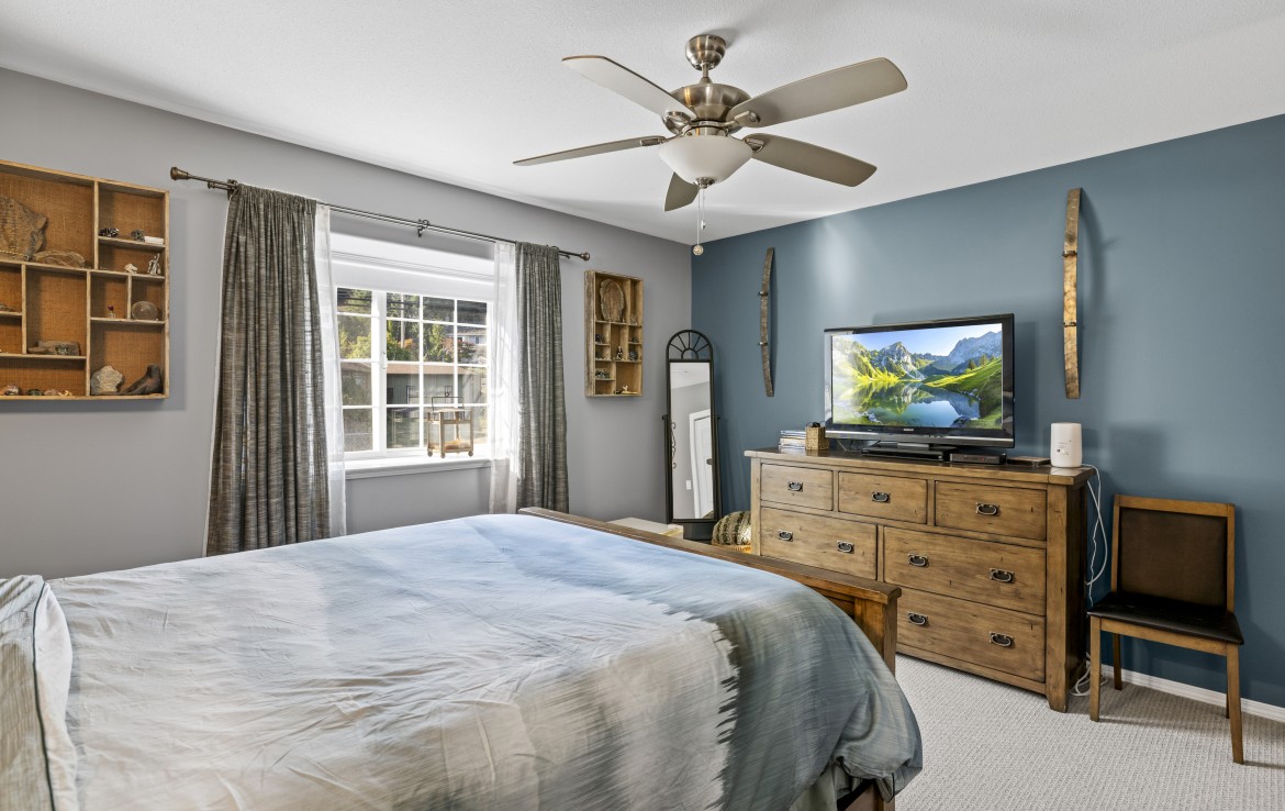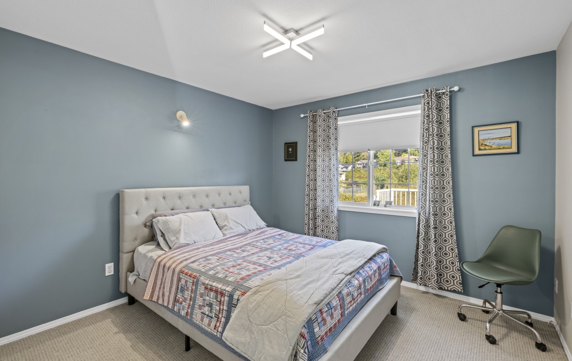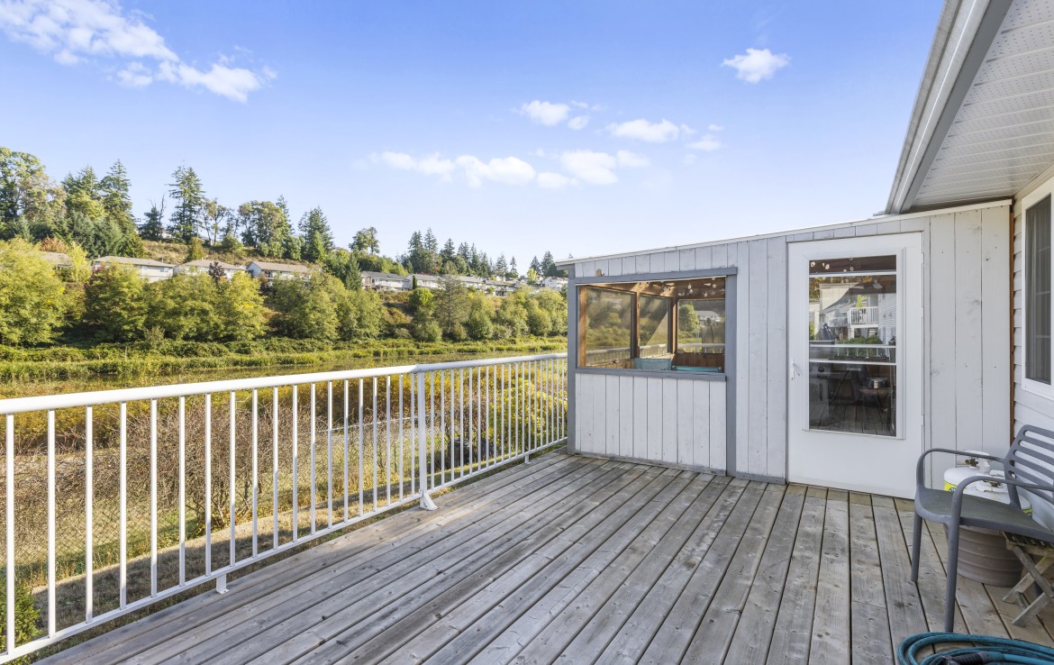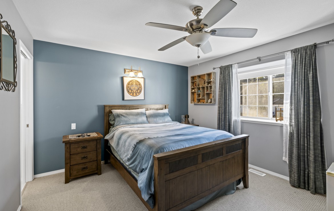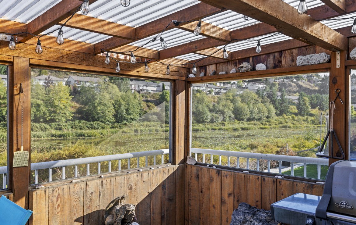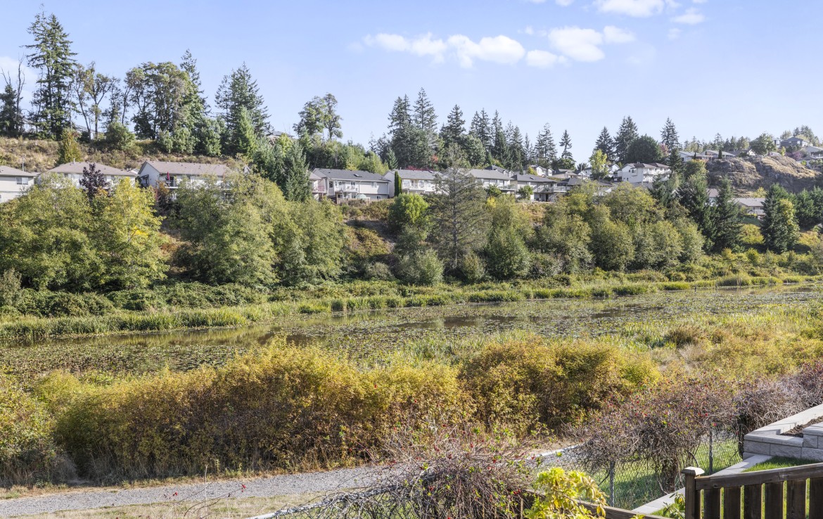 A partially covered deck overlooks the pond, providing a serene outdoor space. On the main level are two bedrooms, a four-piece bathroom, and laundry. The upper level is dedicated to the primary suite with a walk-in closet and three-piece ensuite. Recent upgrades include the roof and furnace.