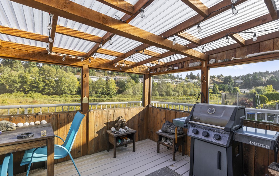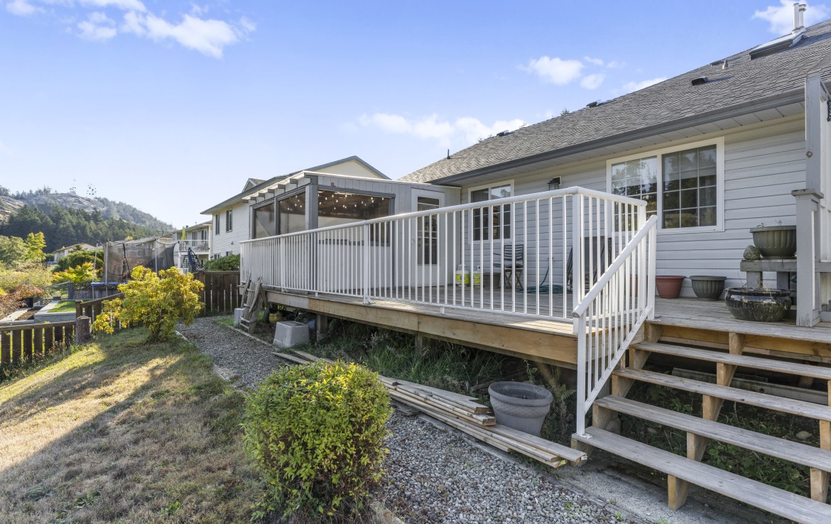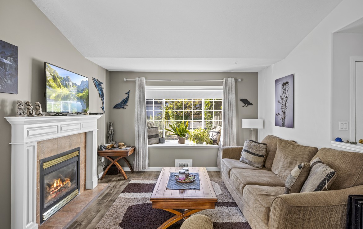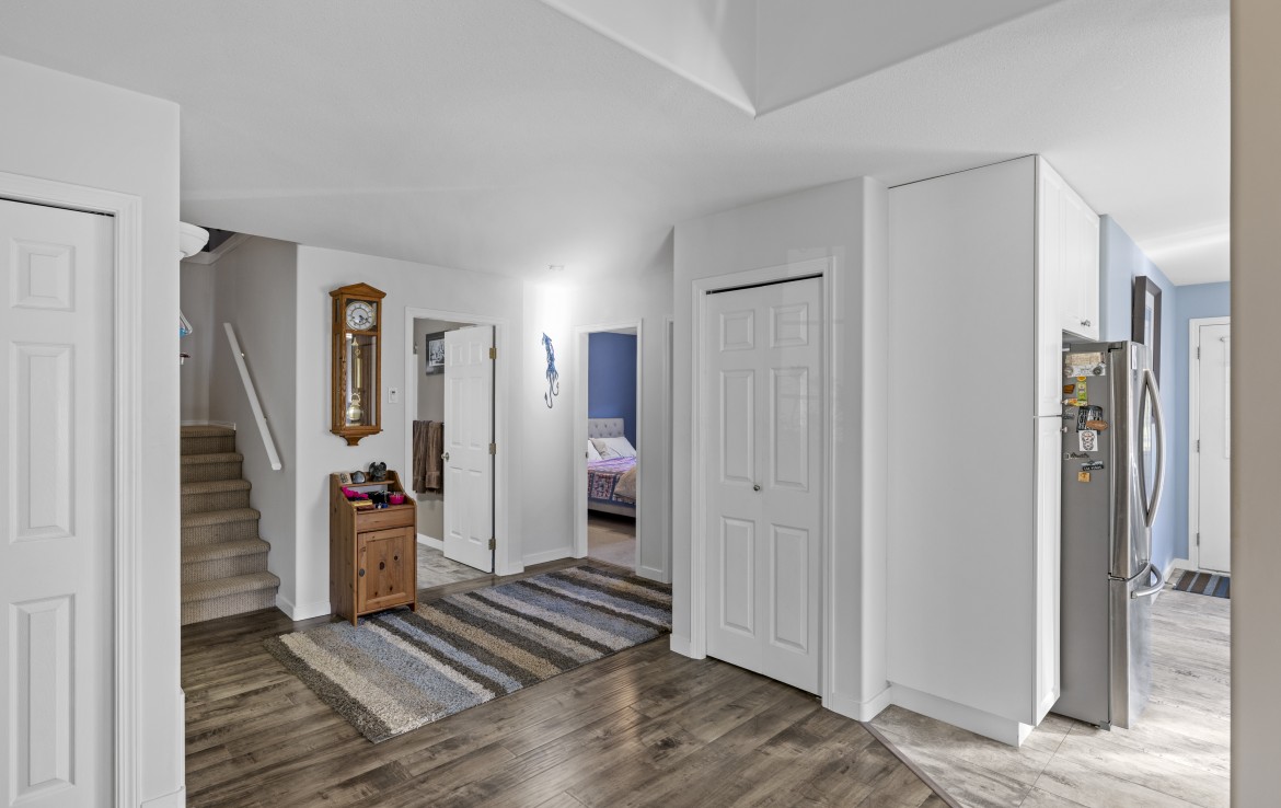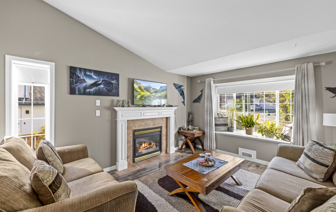 A partially covered deck overlooks the pond, providing a serene outdoor space. On the main level are two bedrooms, a four-piece bathroom, and laundry. The upper level is dedicated to the primary suite with a walk-in closet and three-piece ensuite. Recent upgrades include the roof and furnace.