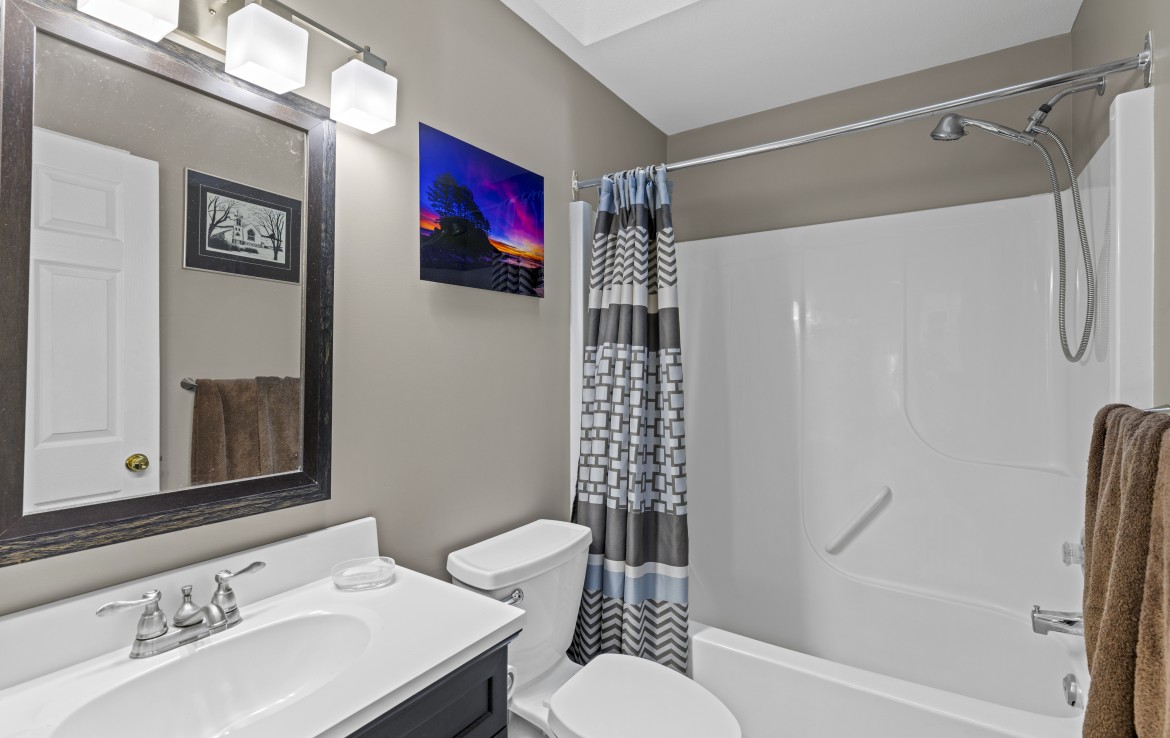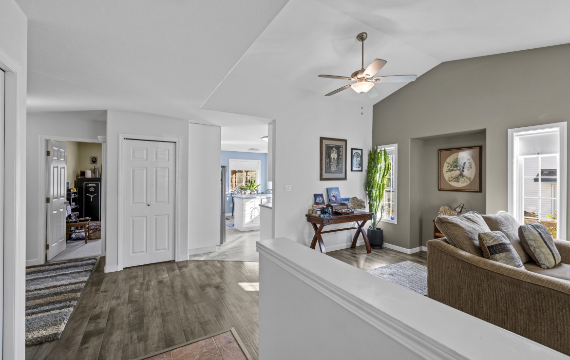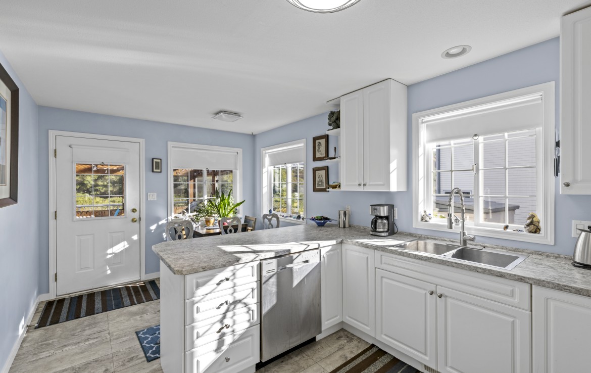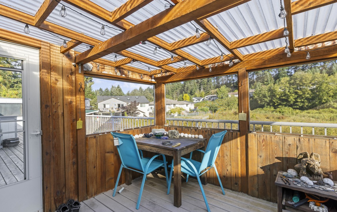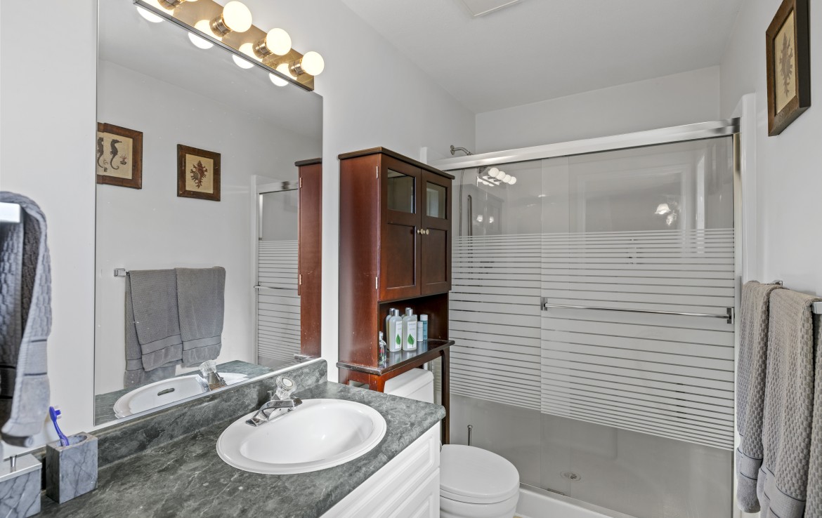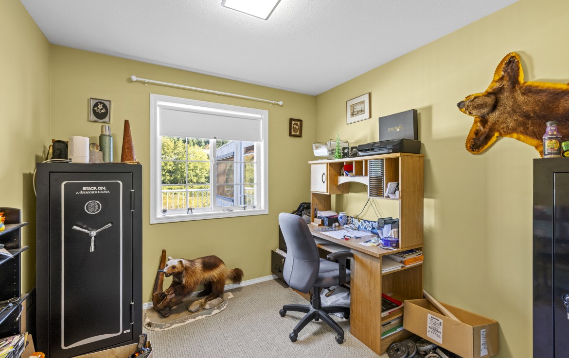 A partially covered deck overlooks the pond, providing a serene outdoor space. On the main level are two bedrooms, a four-piece bathroom, and laundry. The upper level is dedicated to the primary suite with a walk-in closet and three-piece ensuite. Recent upgrades include the roof and furnace.