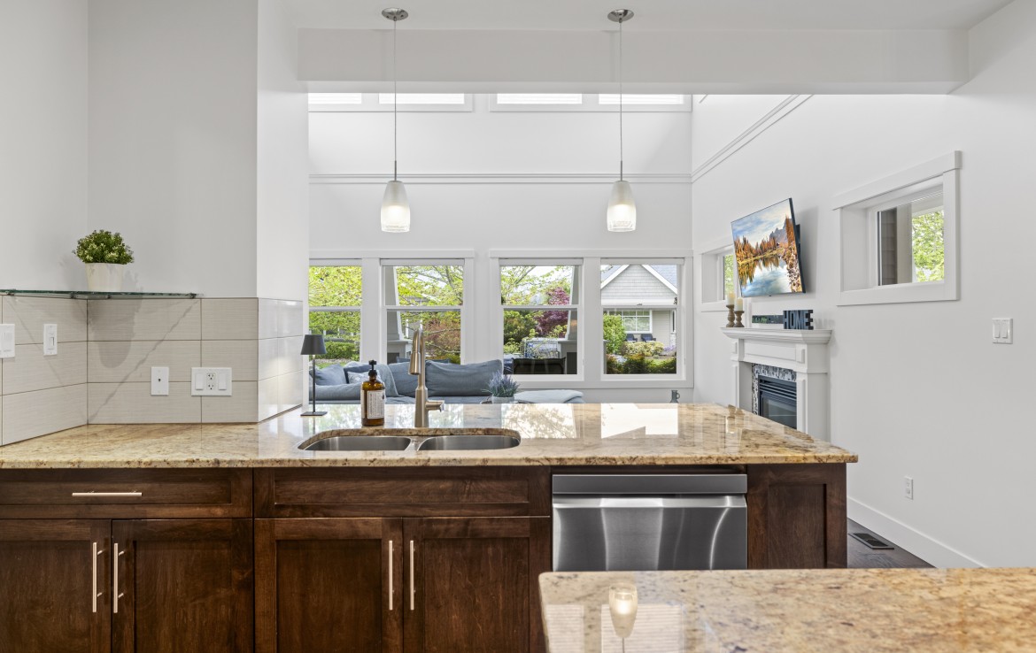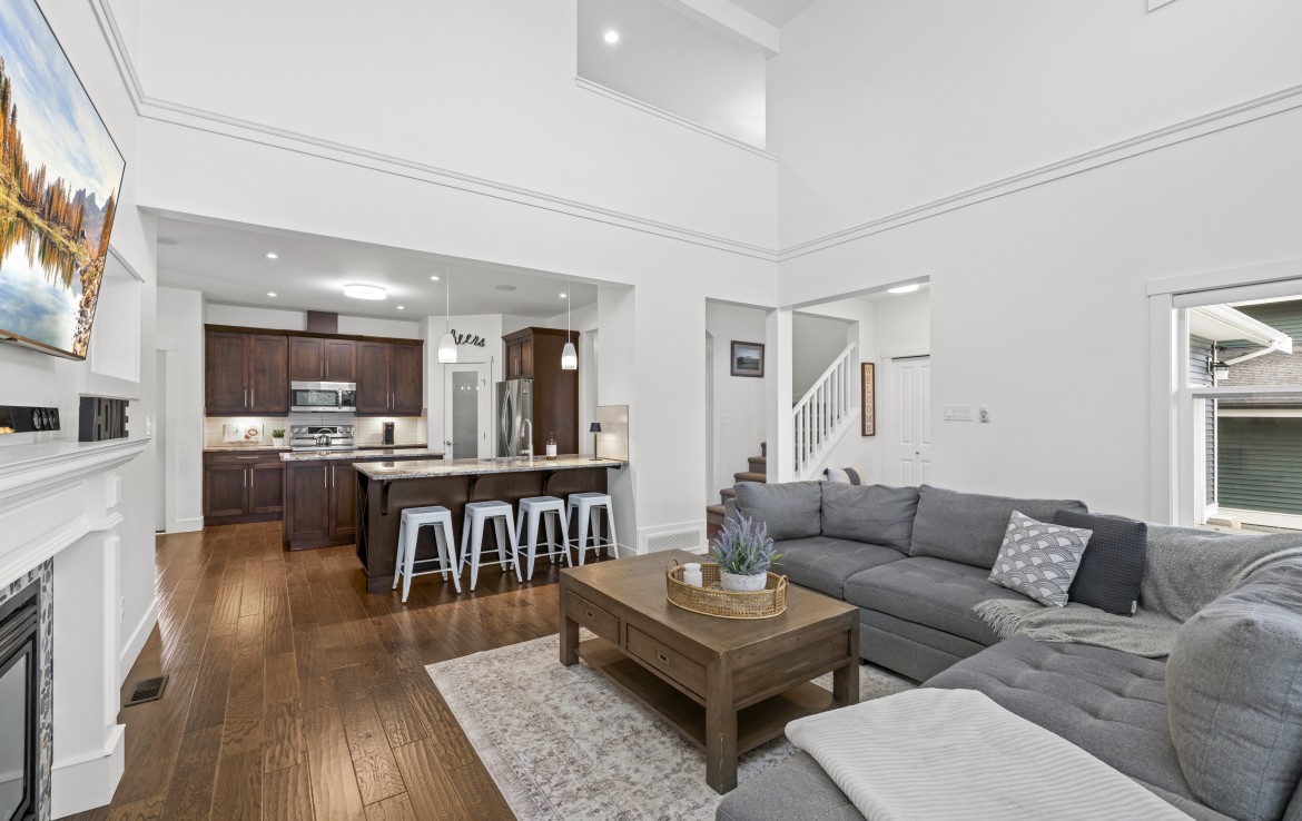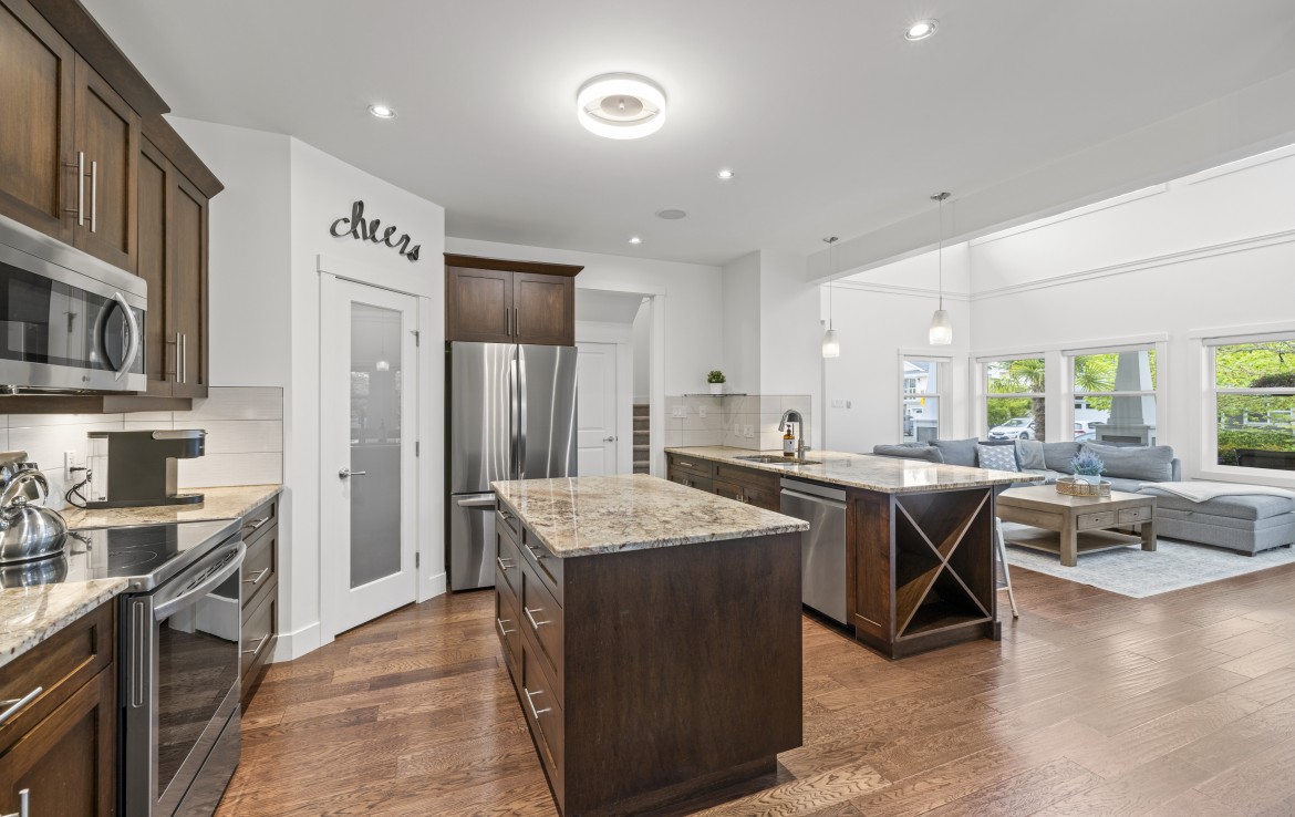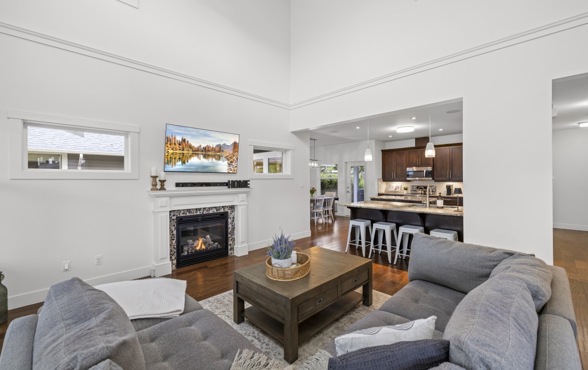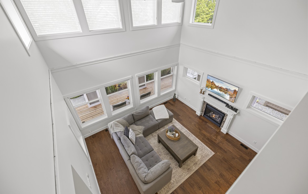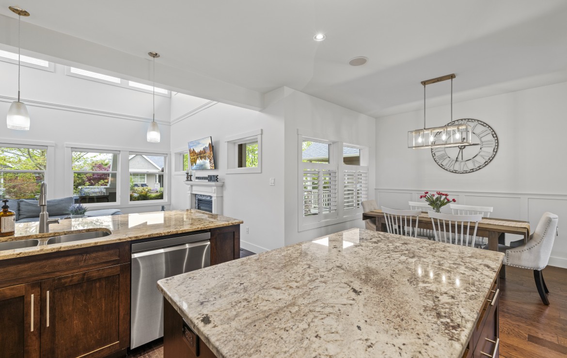 Inside, the open concept main level features a bright living room with 18’ ceilings, gas fireplace, and abundant windows. The kitchen is a standout with granite counters, double islands, and a walk-in pantry. The primary bedroom on the main includes deck access, walk-in closet, and a 5-piece ensuite. A two piece bathroom, laundry and double garage complete the main.