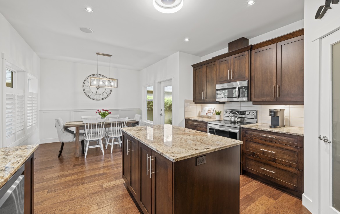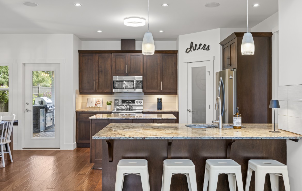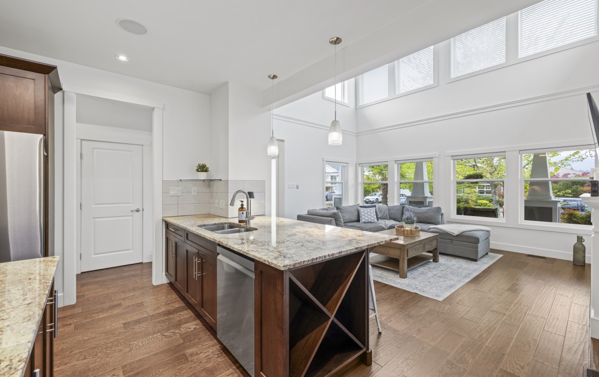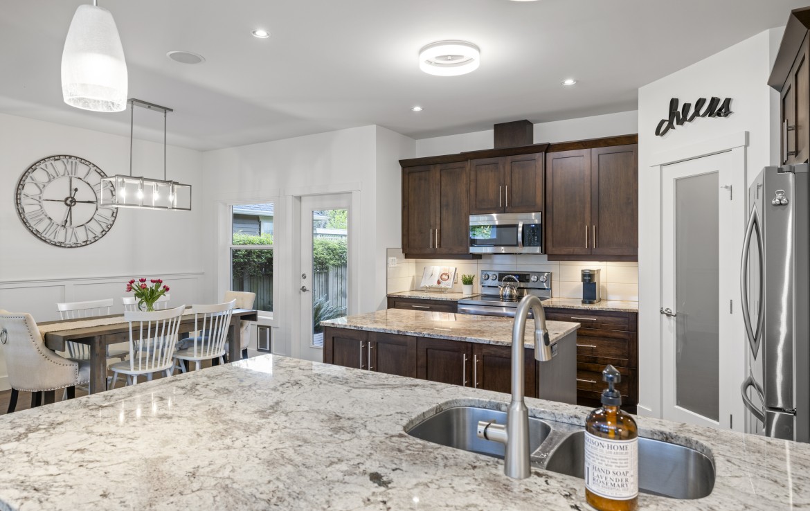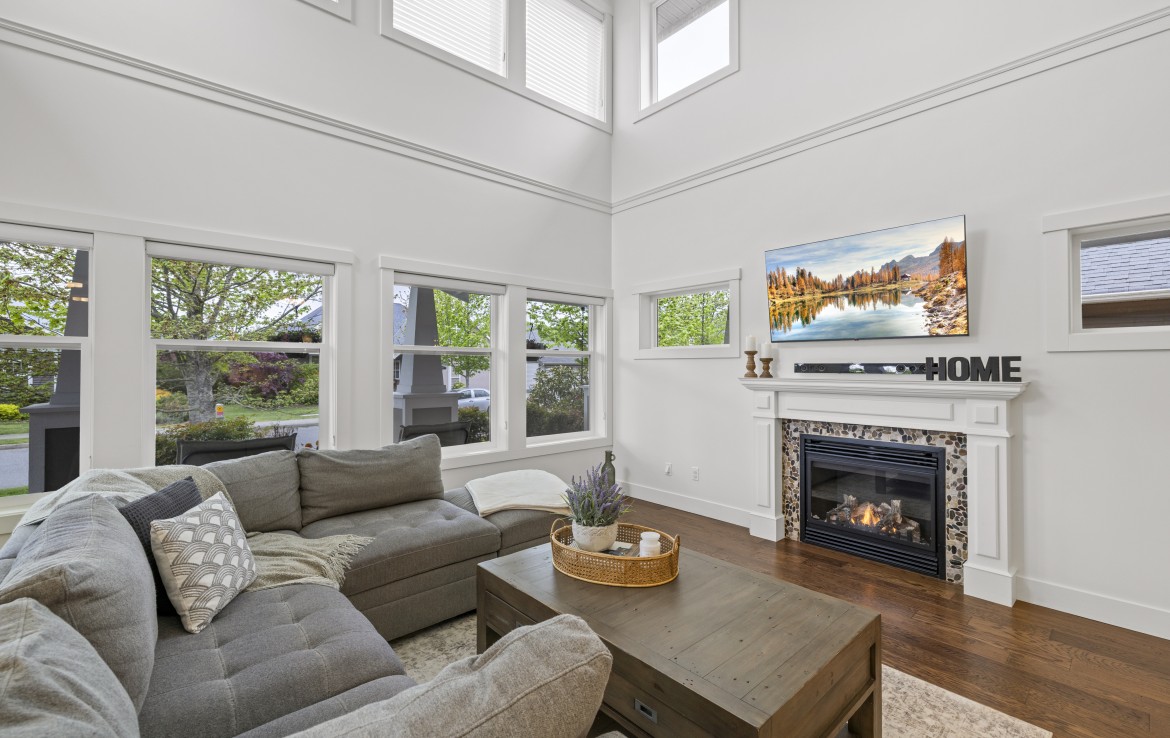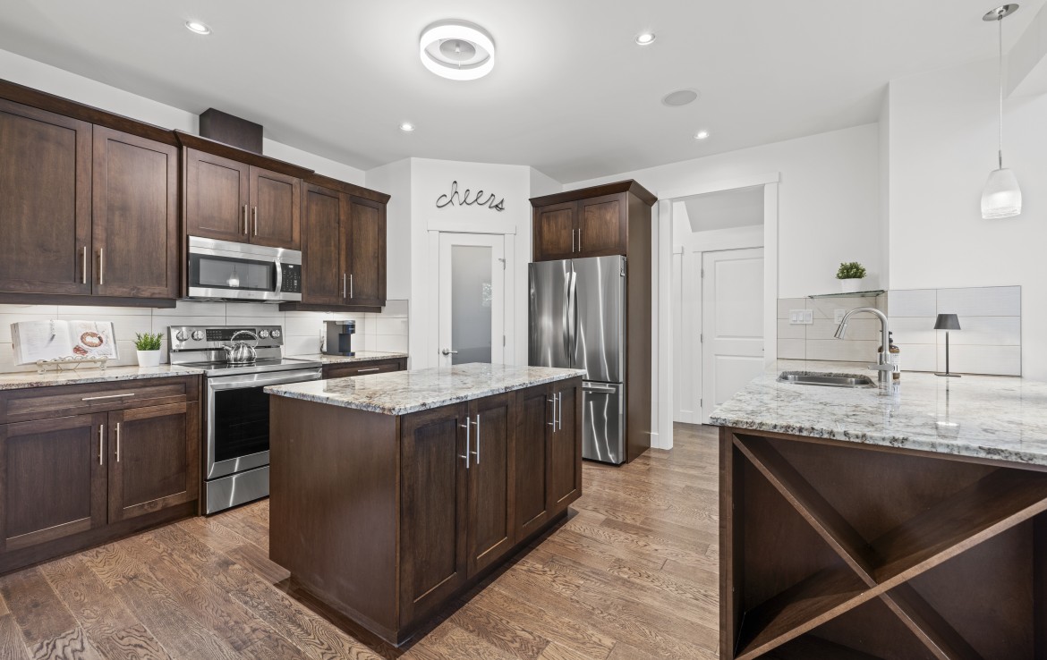 Inside, the open concept main level features a bright living room with 18’ ceilings, gas fireplace, and abundant windows. The kitchen is a standout with granite counters, double islands, and a walk-in pantry. The primary bedroom on the main includes deck access, walk-in closet, and a 5-piece ensuite. A two piece bathroom, laundry and double garage complete the main.