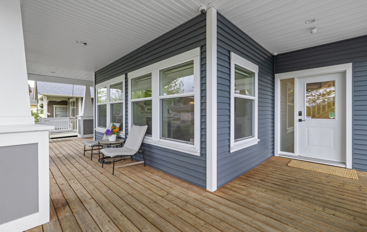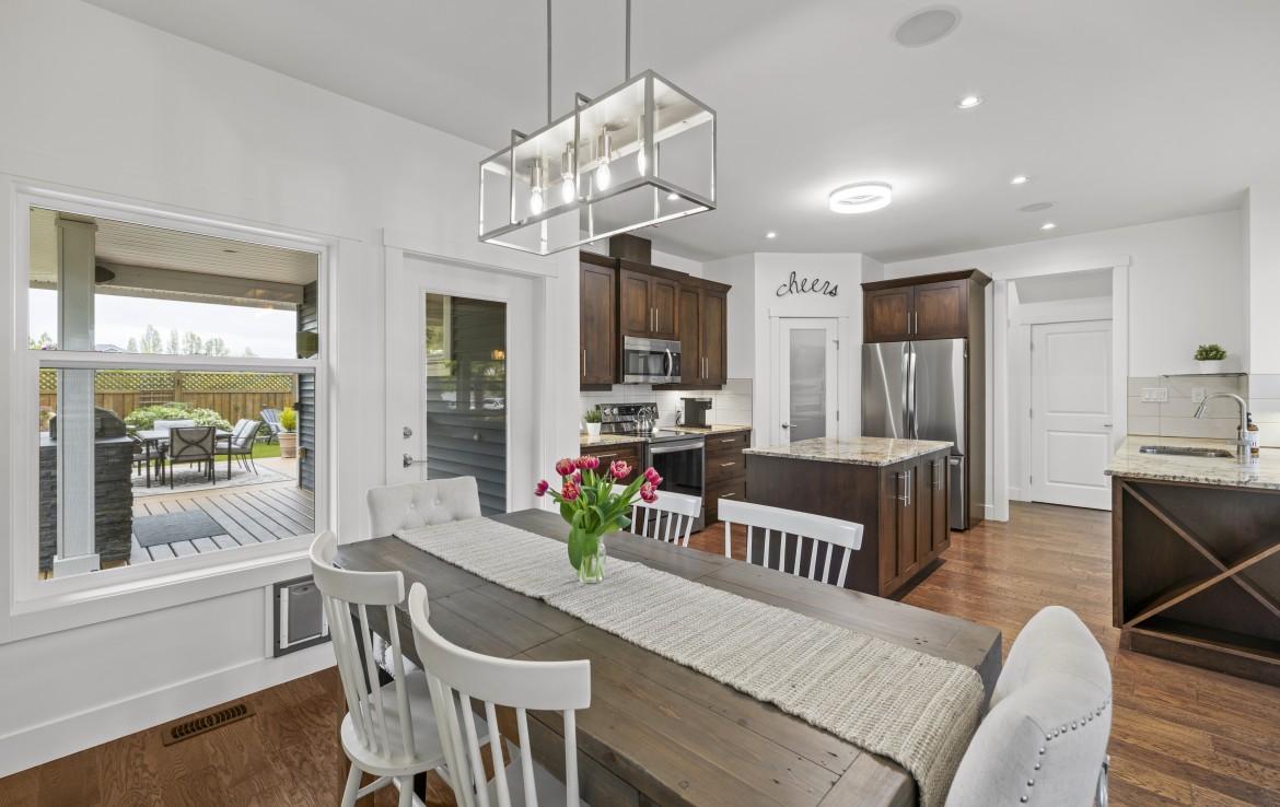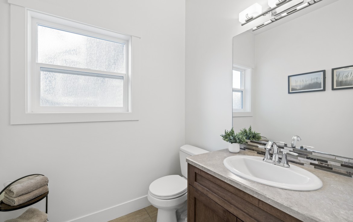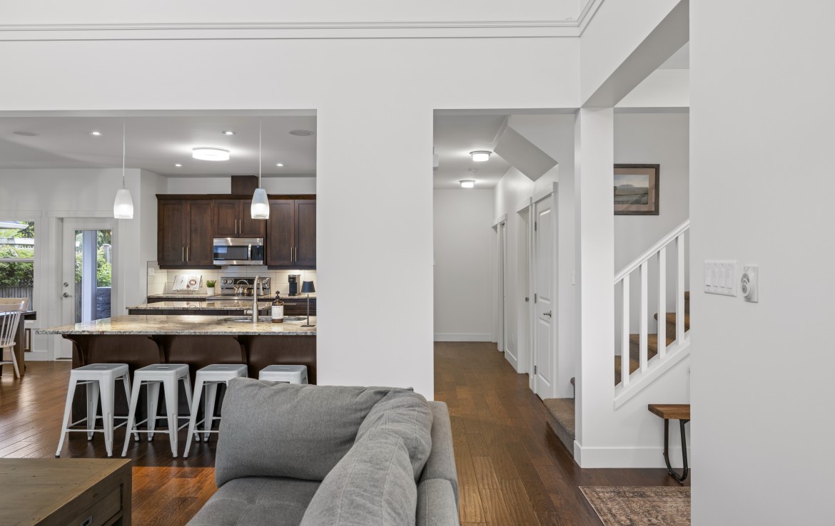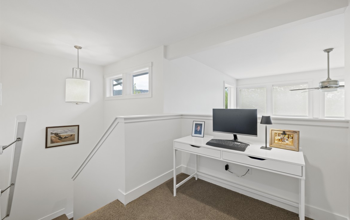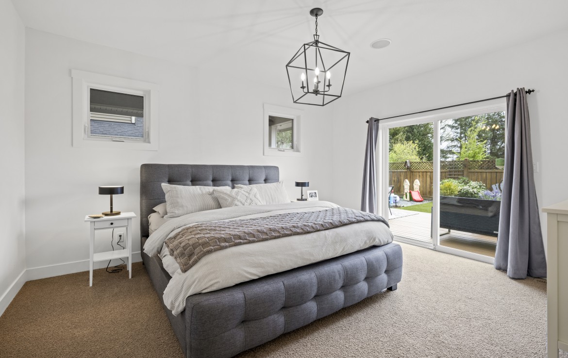 Inside, the open concept main level features a bright living room with 18’ ceilings, gas fireplace, and abundant windows. The kitchen is a standout with granite counters, double islands, and a walk-in pantry. The primary bedroom on the main includes deck access, walk-in closet, and a 5-piece ensuite. A two piece bathroom, laundry and double garage complete the main.